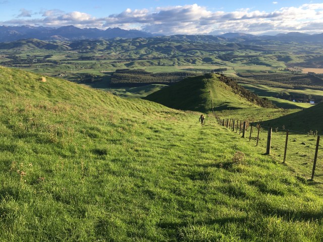 Prana and I take turns ducking behind a rise to dig holes, and de-layer further in the pleasantly warming day. Thus prepped to resume, I come face to face with a familiar choice…a marker-blazed line straight up a cow pocked field, with an unblazed switchbacking road practically in reach to the left. Hmm. What did I learn yesterday? I start up the blazed line, wanting to make the right choice, to not be beaten down. I can immediately feel my enthusiasm start to drain away, as I stare at my feet to keep from rolling an ankle. Not today! At the first approaching switchback, I cut over on a terrace take up the road. YES! A perfect gradual climb, unmonitored footsteps, fantastic views, compelling mountains ringing the panorama.