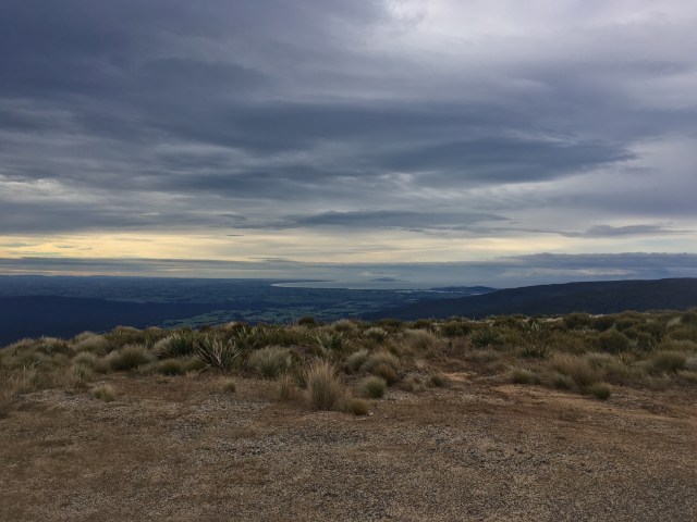 The last stretch of forest before the top is the most beautiful, and I wonder if I took the time to examine each tiny lacy stem of moss, if they would each be different, like snowflakes. I break out into the open to find Prana waiting on the ridge, which is covered with tussock and flax. We have a second breakfast and snack, getting chilly in a hurry. Where did summer go? We climb together towards the top of Bald Mountain, weaving through the patches of thick and spiny plants, some kind of cell tower structure marking the apex. Piles of crumbling reddish rocks appear to replace the plants, and the ground morphs from bog to white, glittering, huge-grain granitey-quartzy sand. We crest the peak and there it is- full views of the end and beyond.