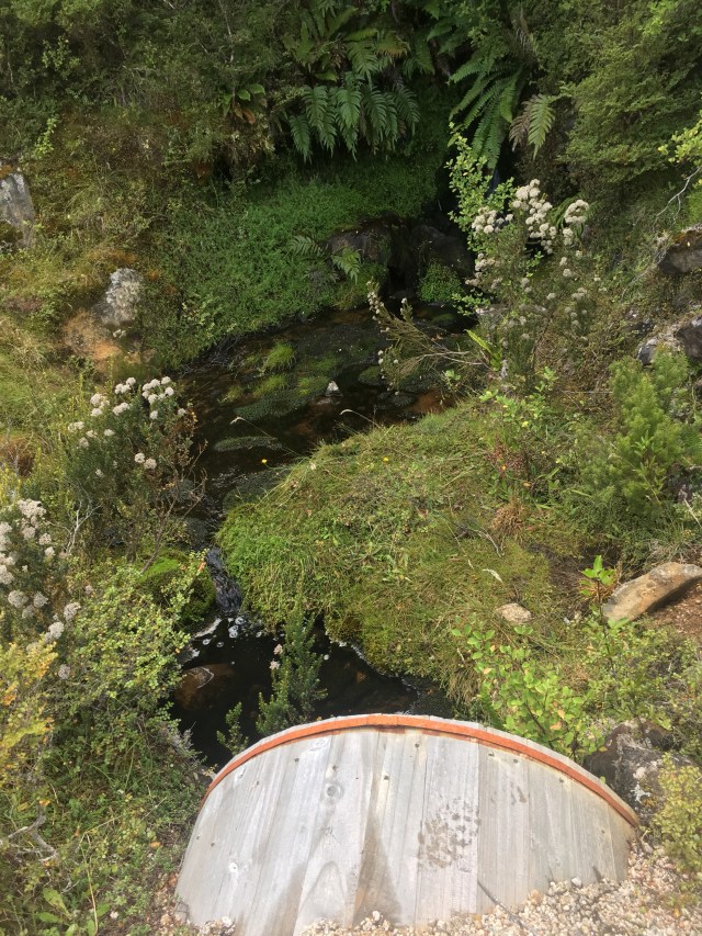 There is a wide, gently descending road, perfect for a jogging pace leading down the other side. And so we jog. Glorious! The road winds past beautiful rock piles and hanging gardens and little tricklets of water in the hollows. Not long before what is marked on our map as the “Old Quarry” turn off is the last creek for 12k, cascading out of ferns, and flowing through a culvert crafted of wooden staves bound by a metal ring, like an old fashioned barrel on its side. We tank up on the delicious sweet water.