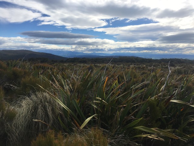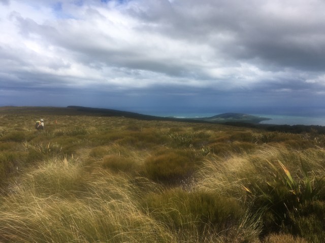 Eventually gain the Longwood Ridge for which this track is named. It is a beautiful bouquet of draping flax and bayoneted spines and succulent shrubs. We walk the long soggy length of the ridge, sloping toward the ocean. At another break I have service, and check my email. I am glad to see an email from Jo. She must be within a day of finishing, I think. When I open it, though, I read she is off trail with a broken wrist. No! I write back, hoping for her that she will still be able to complete her hike.
