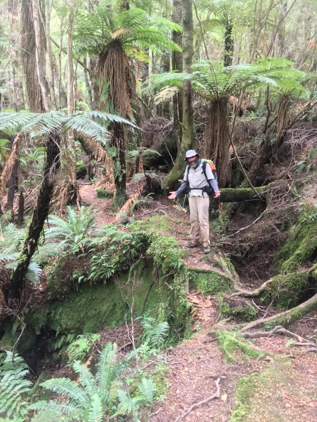 Finally building up steam for the day, I am able to appreciate the gorgeous forest track, the profusion of ferns, the variety of trees, the thick luxuriant moss. In a few groves the trees are draped in flowing moss, like furry characters from a Dr. Seuss story. The sunlight catches their fur and makes them glow…maybe they are alive and just moving so so slowly I can’t notice at my hasty pace.