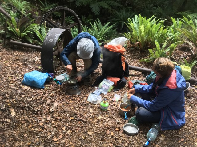 We turn a flat dry corner, and there finally is the indicating machinery sticking out of ground on a bench below the trail. There is indeed just enough flat space for both of our tents with the doors overlapping again. We pitch and prop ourselves against the old mining equipment to cook up a bowl of rice noodles, then bundle into the tents just as the sky opens up with rain. Perfect timing. I savor my nightly ration of Whittaker’s chocolate as I listen to the big fat drops slap the leaves in the twilight.