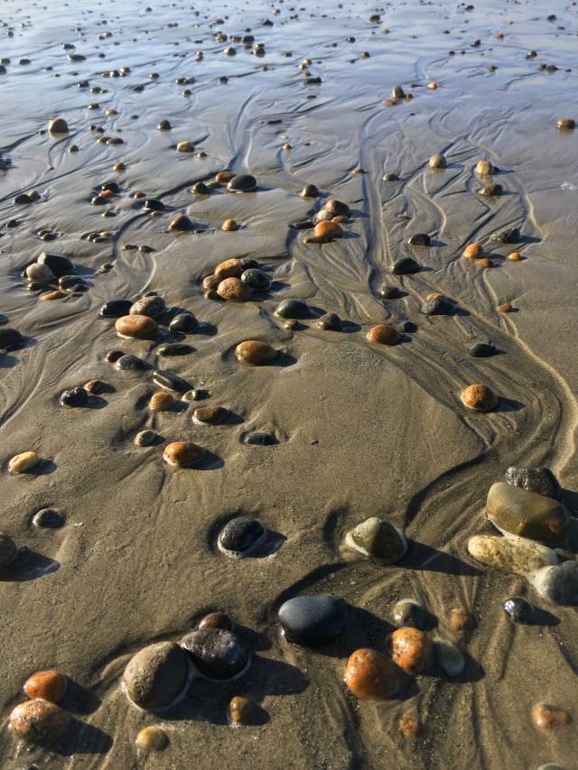 The beach walk is arresting. Stunning! The sand is multi-colored, leaving streaking geometric patterns behind as the waves run out. Small cobbles and pebbles of all different colors contribute to the swirls.