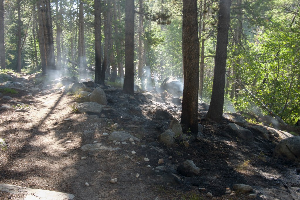The trail was smoldering 2 feet in front of him. Once I noticed that, my eyes picked up more tiny ribbons of smoke puffing from all over the ashen ground, as well as movement in the hazy trees. 4 firefighters were spading, trenching, and carrying water from the creek- the creek less than 30 feet from the trail.