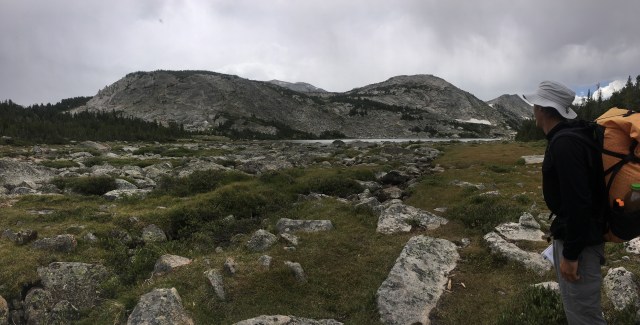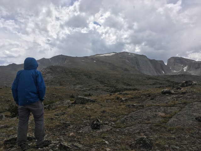The hours unwound past lake after lake. The sky darkened, spit rain, lightened, repeat. Much time was lost to heaving the pack on and off, doffing and donning rain gear in cycle with the fickle sky. The wind gusted erratically, whip-cracking pack-straps and elbowing us around. Finally we neared the Deep Creek Lakes, point of our first cross country embarkment. What greeted us atop the rise was awe-inspiring: huge walls of granite erupted from the ground, and tucked among the petrified swells was Wind River Peak, southernmost 13,000+ foot peak, and our first quest objective.