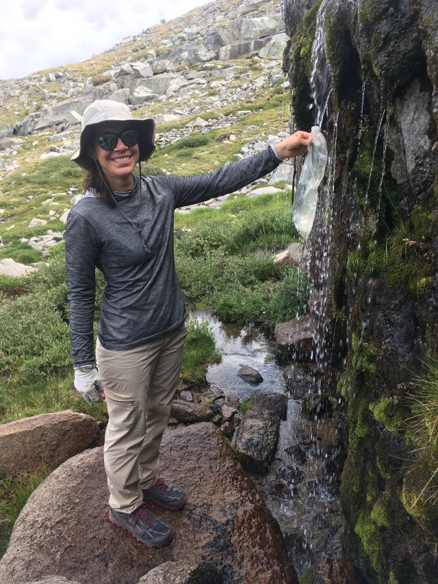 Deciding to gamble in the rain-free window, we scurried around the edge of the lake below us and up the ramp. It was a winning bet; when we dropped our packs in a protected nook, it took us only moments to locate the gushing spring. We filled all our water bottles, and started the game of where can we pitch our tent? The wind gusts grew stronger and more sporadic, and we finally stood in a spot that, while buffeted from the waist up, was comparably still from the waist down- and was just the square footage of our tent.