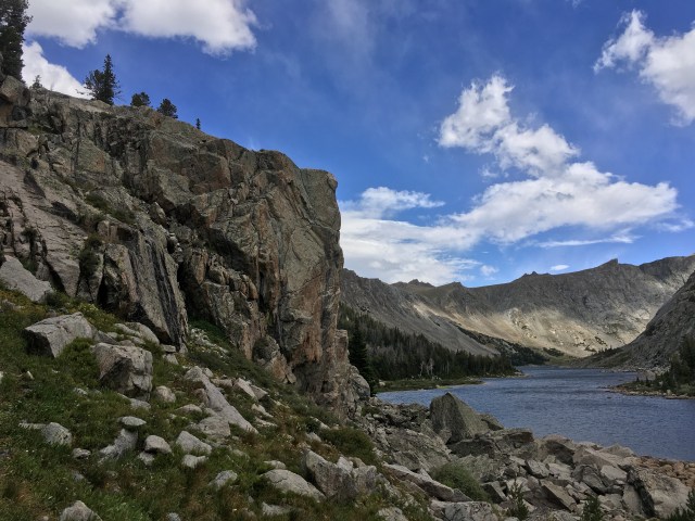 Down to Arrowhead Lake, a lovely basin in its own right, and then up Jackass Pass. At a fork in the trail we chose the climber’s route, down to the left instead of up to the right, hoping it would feature less people. It wound through well-settled, perfectly-cairned talus, a curated, sanitized sample of the bulk of our day. It was no less crowded, though, and when Prana hopped off a large boulder near the end, a dog being unsuccessfully coaxed through lost its mind, snarling barking growling rushing lunging for his arm. The dog’s person, commendably, scrambled for the dog, grabbed it, and loudly chastised it. “I’m so sorry,” she said. “He hasn’t done that at all today.”