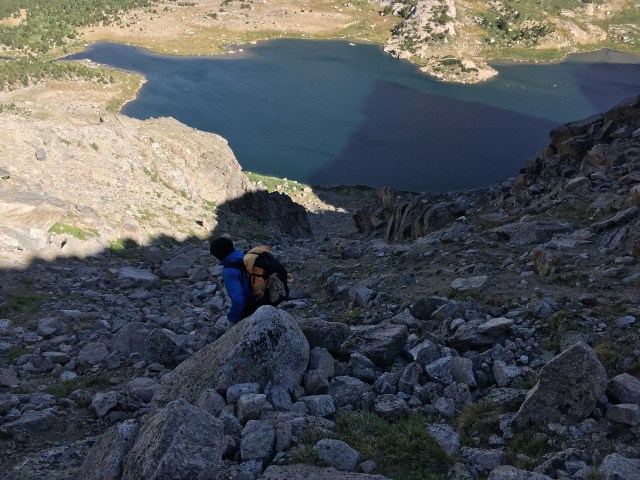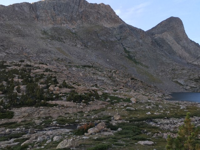 We gained the head of the valley, the access to Raid Peak Pass – a 2 for 1 deal which required a semi-contour around Mt Bonneville. We scrambled up easy slabs, then boulder hopped to the top of the first pass into the full force of the wind. We hopped down and around, passing a perfect reflecting tarn before gaining the shoulder which would allow us into the upper Bonneville Basin, assuming we could find the Class 3 scramble down- a map notation I’d been too exhausted today to spend my normal amount of time agonizing about. When the talus gave way to bedrock ramps, we debated which might offer the best descent. I passionately defended the exact location of the map’s datapoint, and, letting me have my turn, Prana followed. The route we found was beautifully simple – only 1, perhaps 2 moves, rate-able as Class 3; looking back up from the bottom, it would be hard to guess where that exact weakness lie, and many other slabs similar at the top did not end in a comparably easy landing. Hats off to the map’s precision.