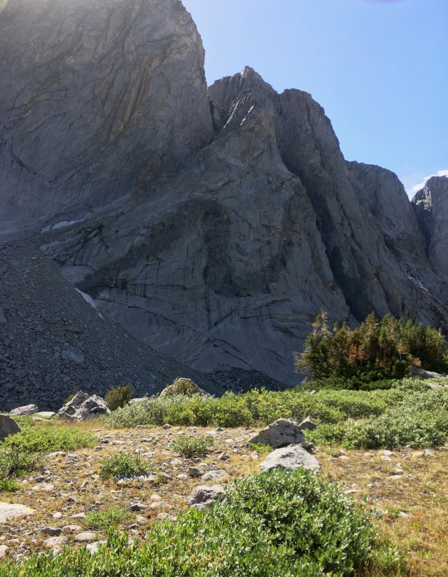 Up steep trail from Lonesome Lake, we spiraled around Pingora Peak, indisputable centerpiece of the Cirque. A monolith jutting into the center of the ring, she was hewed by glaciers draped back to back across the eastern ridge of the Wolf’s Head. A Shoshone name meaning “high, rocky, inaccessibile peak,” Pingora seemed to magnetize sunbeams towards herself, basking in the spotlight. A slightly inaccurate name, I thought to myself, as most of the climbing shouts in the basin echoed from her flanks, and teams of climbers were queued at her base.