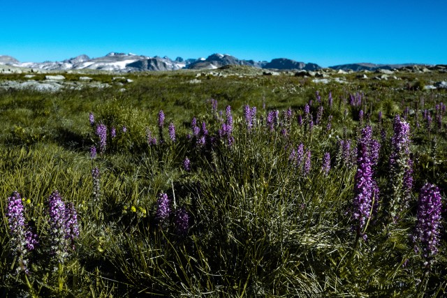 We wandered down the broad peak and along the gentle, rolling Divide. It was bizarre to me the Continental Divide was so wide and obscure here; in my imagination it was a distinct and obvious spine for its entire length, even where it wasn’t tall. The walking was pleasant, not too mind-consuming, and there was no wind. Huge patches of elephant head flowers were in different stages of bloom and wilt. The tarn marking our exit funnel to Golden Lakes was a lovely little thing, ice blue, with pockets where a tent could snug in. We scrambled up the hill behind it which was cleft by a fault line.