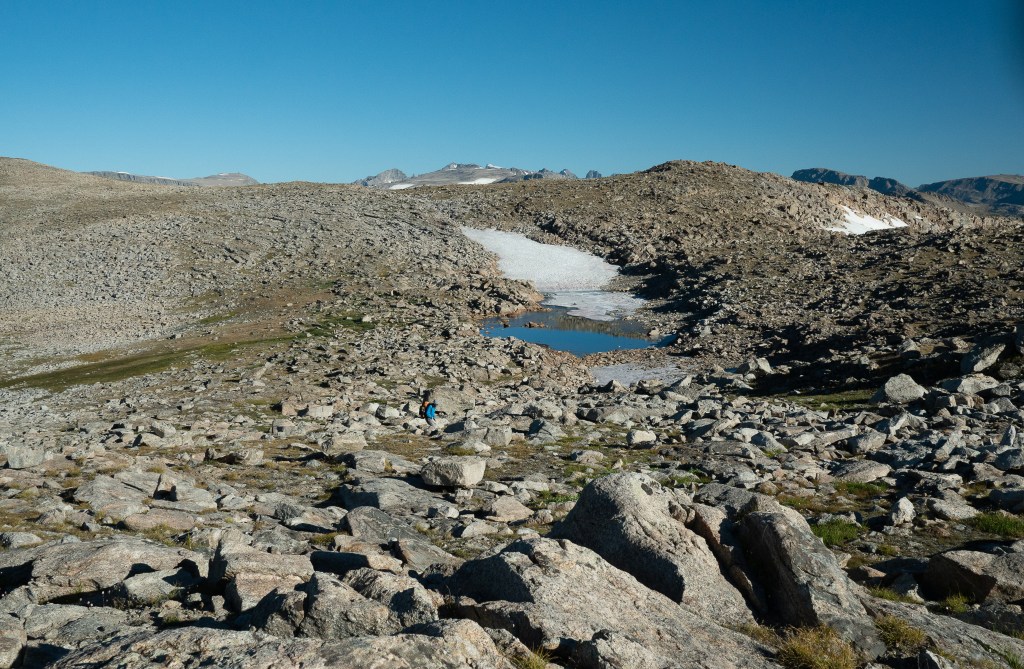 I reached the top of Douglas Peak Pass, where Alpine Lakes basin opened before us, no less incredible the second time. A book I’d read in the interim claimed this basin was the last accurately mapped area in the Winds, and therefore the contiguous US; it was the late 1970s before the cliff bands were drawn and waterways connected correctly. Below, the lakes sparkled their slightly varied shades of turquoise. Much of the snow had disappeared: much more boulder hopping and much less snow crossing than last time, for both better and worse.
