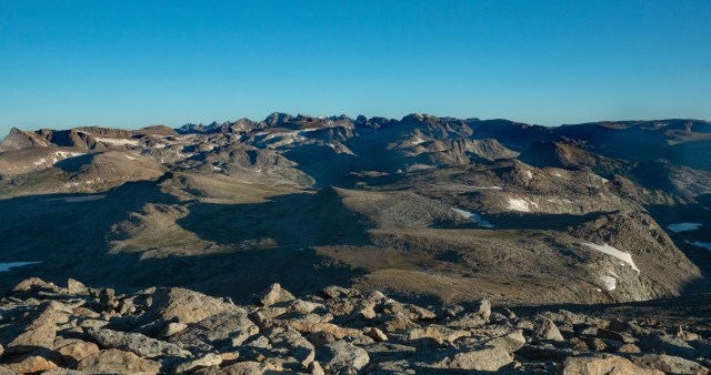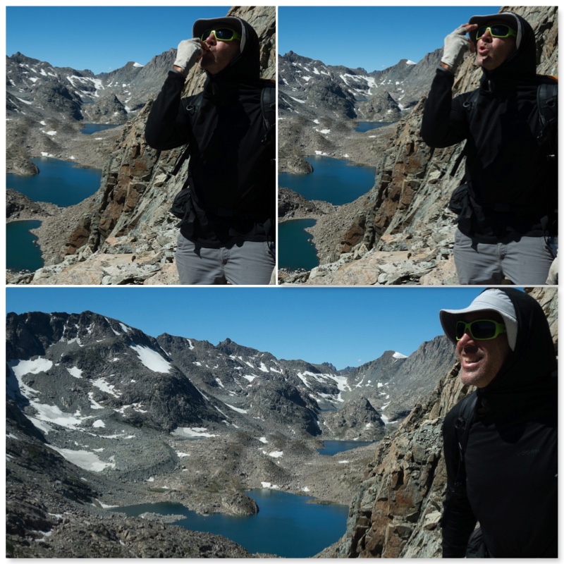 From Europe’s true summit we had fabulous views: west, into the top of Europe Canyon; east, down the Milky Lakes valley; and north, into Golden Lakes Basin, where I was fairly confident I could pick out Douglas Peak, Alpine Pass, Gannett Peak, and wondered if I could in fact see Blaurock Pass. (Later I would confirm I’d been looking at the correct ridgeline, but the low point of the pass itself had been out of sight.)