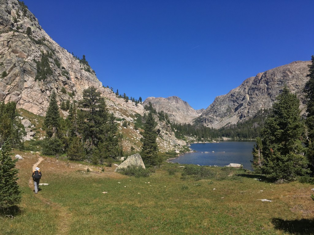 Now, the Winds are likely full of faults (aren’t we all) but this one actually felt like a crack in the earth that had been filled in and barely grown over. Plates and blocks of heaved rock bracketed our vague hallway, and our trajectory in it lined up perfectly with the straight-cut valley of the Golden Lakes. Down down down we followed the fault, into the first water-filled green-grassed valley, where we stopped to snack and apparently be ambushed by horseflies. Stringing together elk trails on the upper right bank, we worked downstream until the valley narrowed, cupping a tarn, whose outlet we crossed. A westerly contour dropped us directly onto the antique tread of the Hay Pass Trail, just below where we’d intersected it 2 weeks ago.