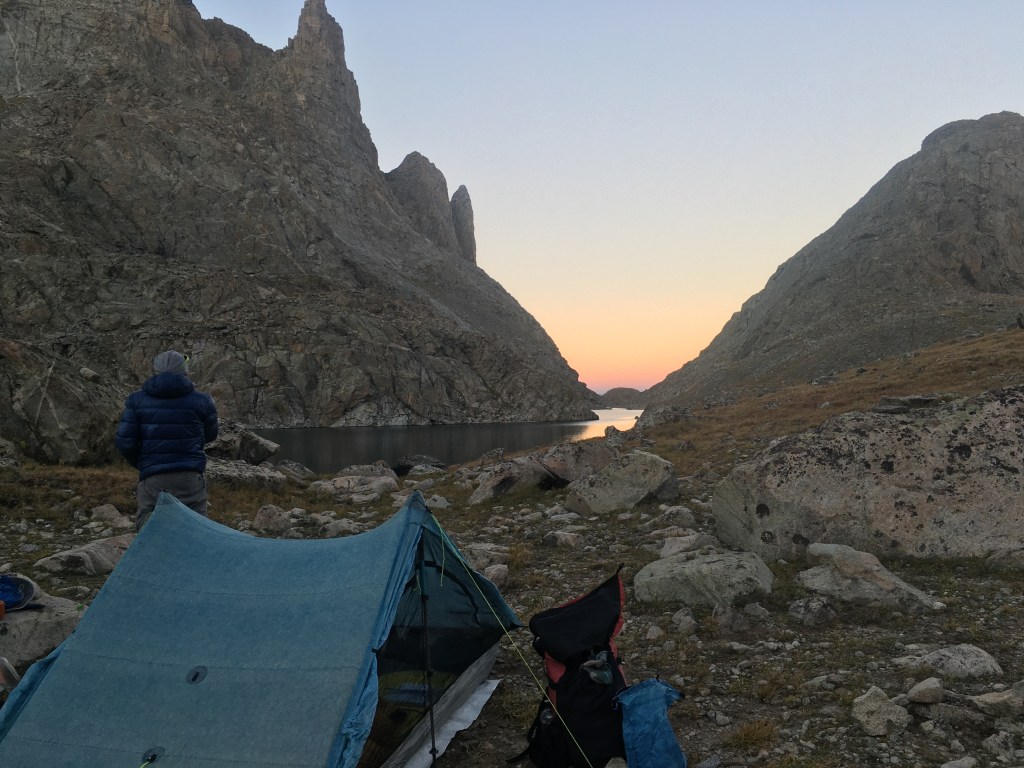 We scouted the kettles, and though we located a cradled cowboy camp, we ultimately set up the tent, as it was the first night where mosquitoes were a bother. We cooked dinner watching the parapets fade to silhouettes, the lake don its nightgown of liquid silver. Last visit I’d felt a sense of confinement, of intense isolation while crossing this basin. Whether from the mellowing conditions, the acquaintance of returning, or the deepening of immersion and therefore tranquility of the longer trip, this time I only felt welcome and solace.