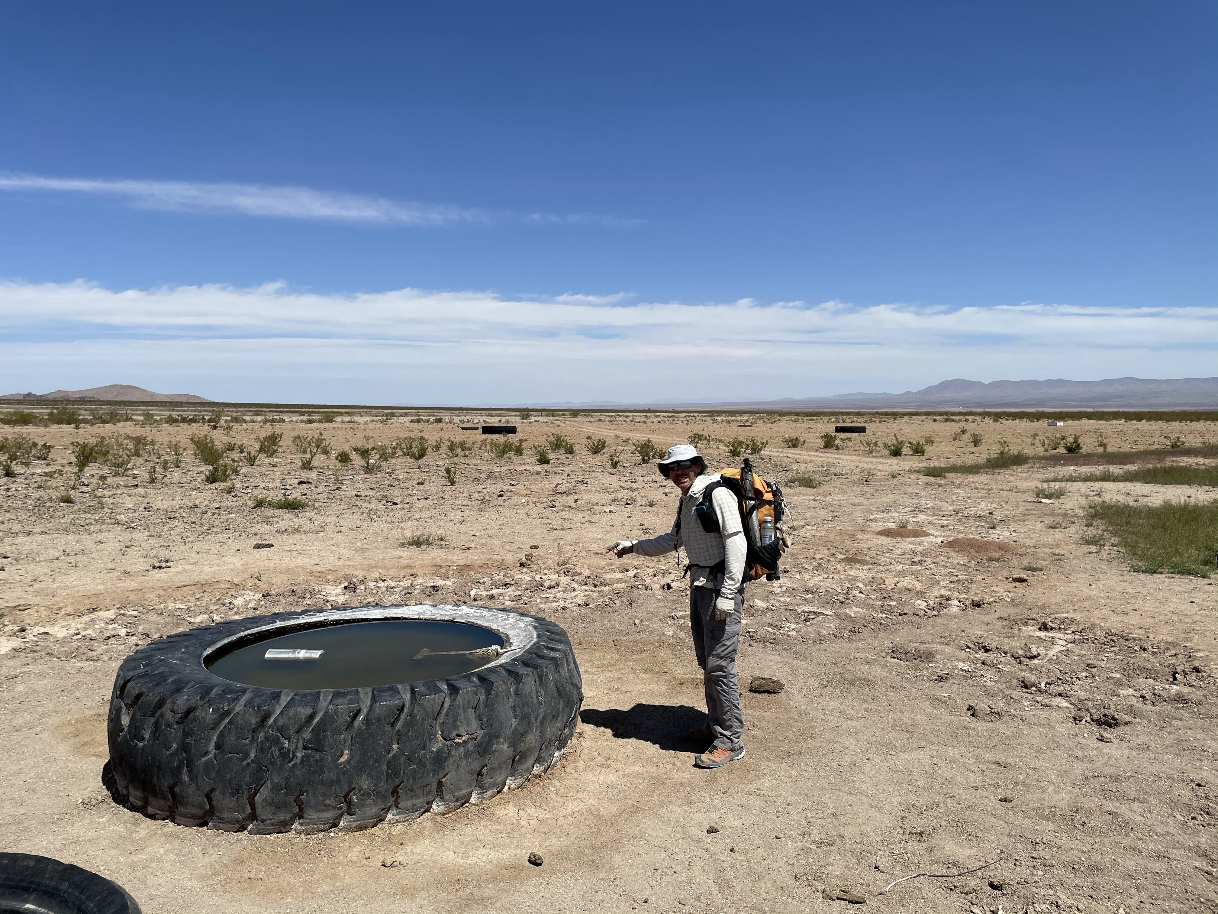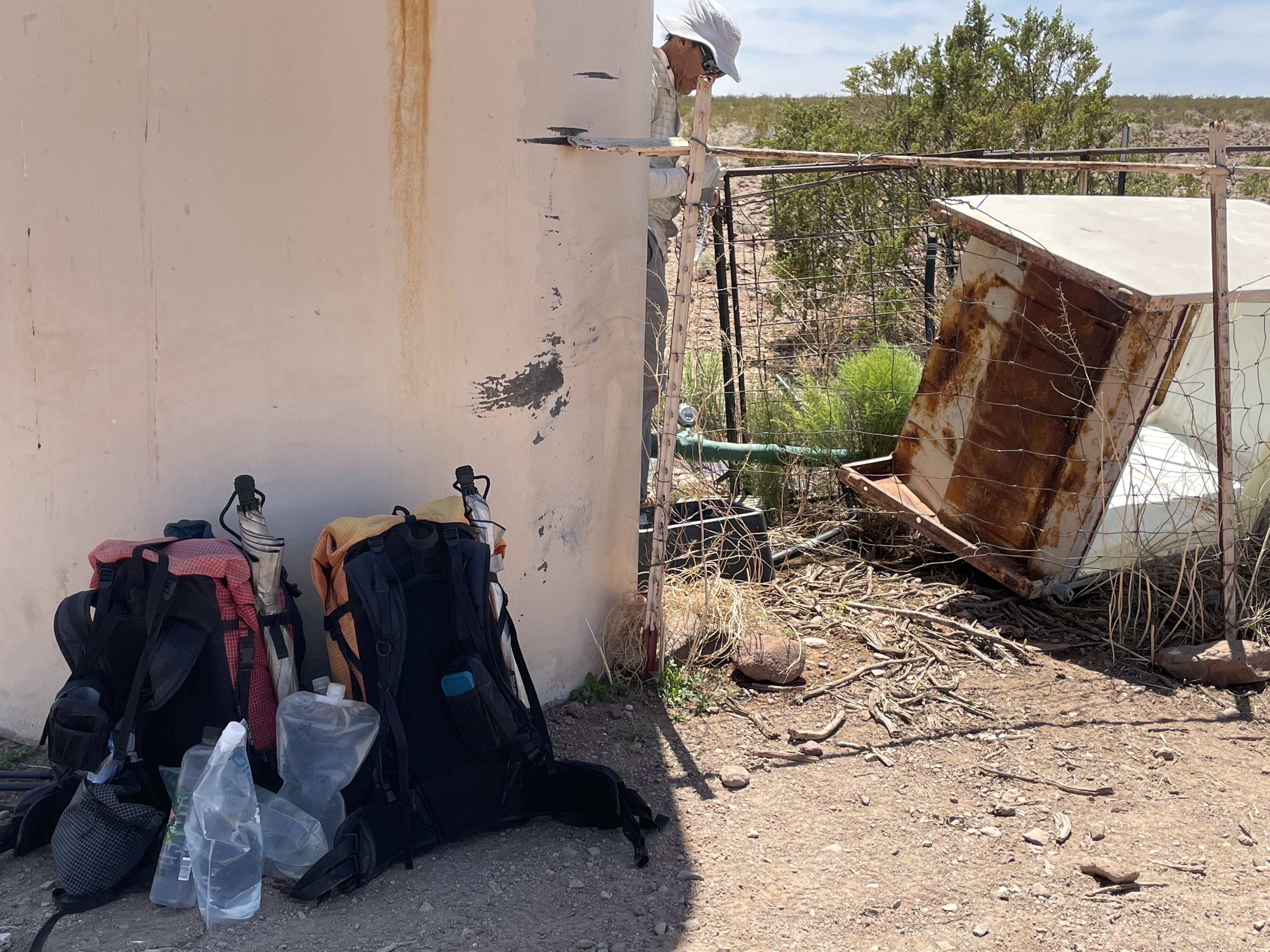 Our afternoon/lunch break is at the best spot yet- an off trail solar powered well with a faucet, and junipers shading exposed bedrock slabs down in the creek bed. We drink water, eat lunch, drink lemonade, wash our socks, wash our feet and legs, drink electrolytes. We floss, finger comb our hair, solar charge our phones. I work on my feet: my heels have become painful, but I can’t pinpoint a spot causing issues. I plaster them with tape and hope for the best.