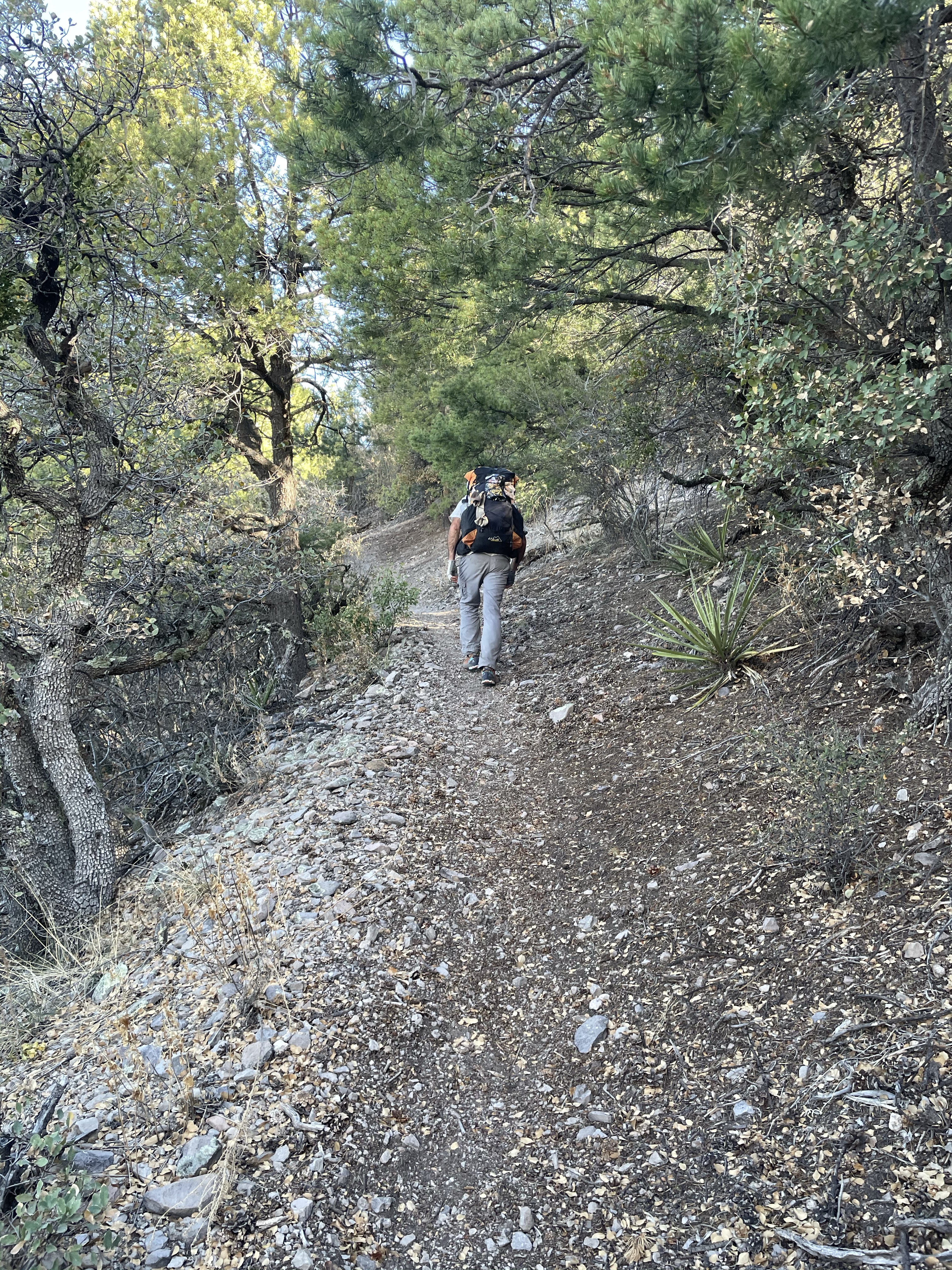 About 150 feet past our rocky make-do campsite, nooked in the last bend in the trail before the side hill, was a camp in a massive circle of pines: pine needle carpet, no rocks, and probably no scorpions. Haha – there is just never telling what waits up-trail.