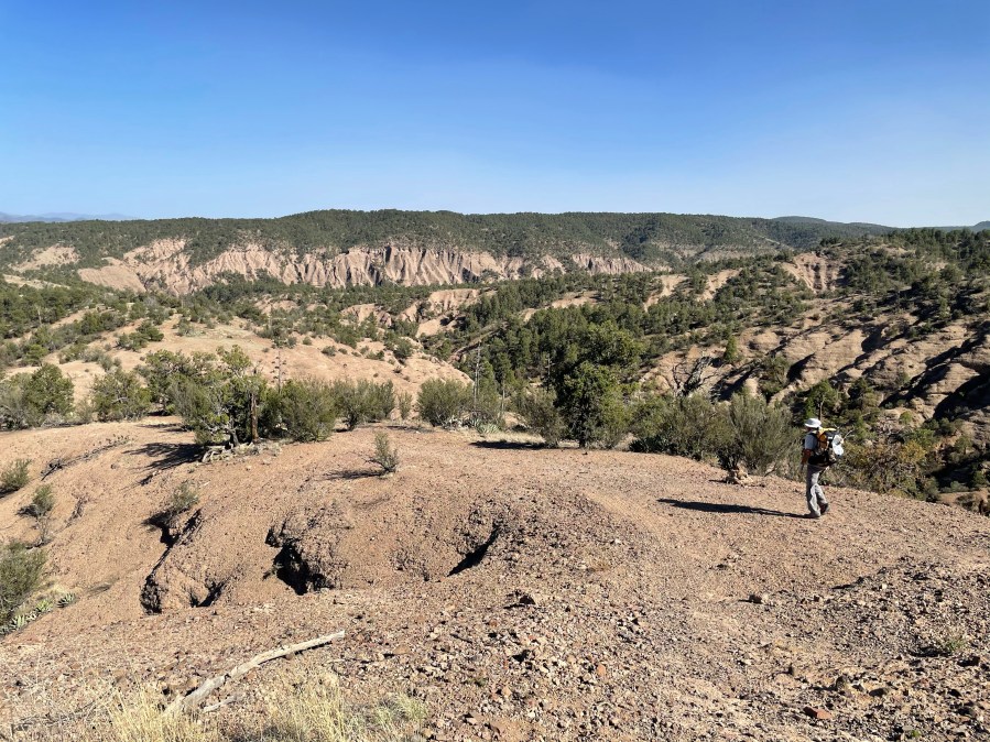 We climbed to and crossed the front of The Twin Sisters, where a horny toad surprisingly scampered from us; walked the top of a broad saddle; then dropped through a burned area. One last glance back to Silver City and its environs, and we plunged down the back of the ridge and into the Black Range.