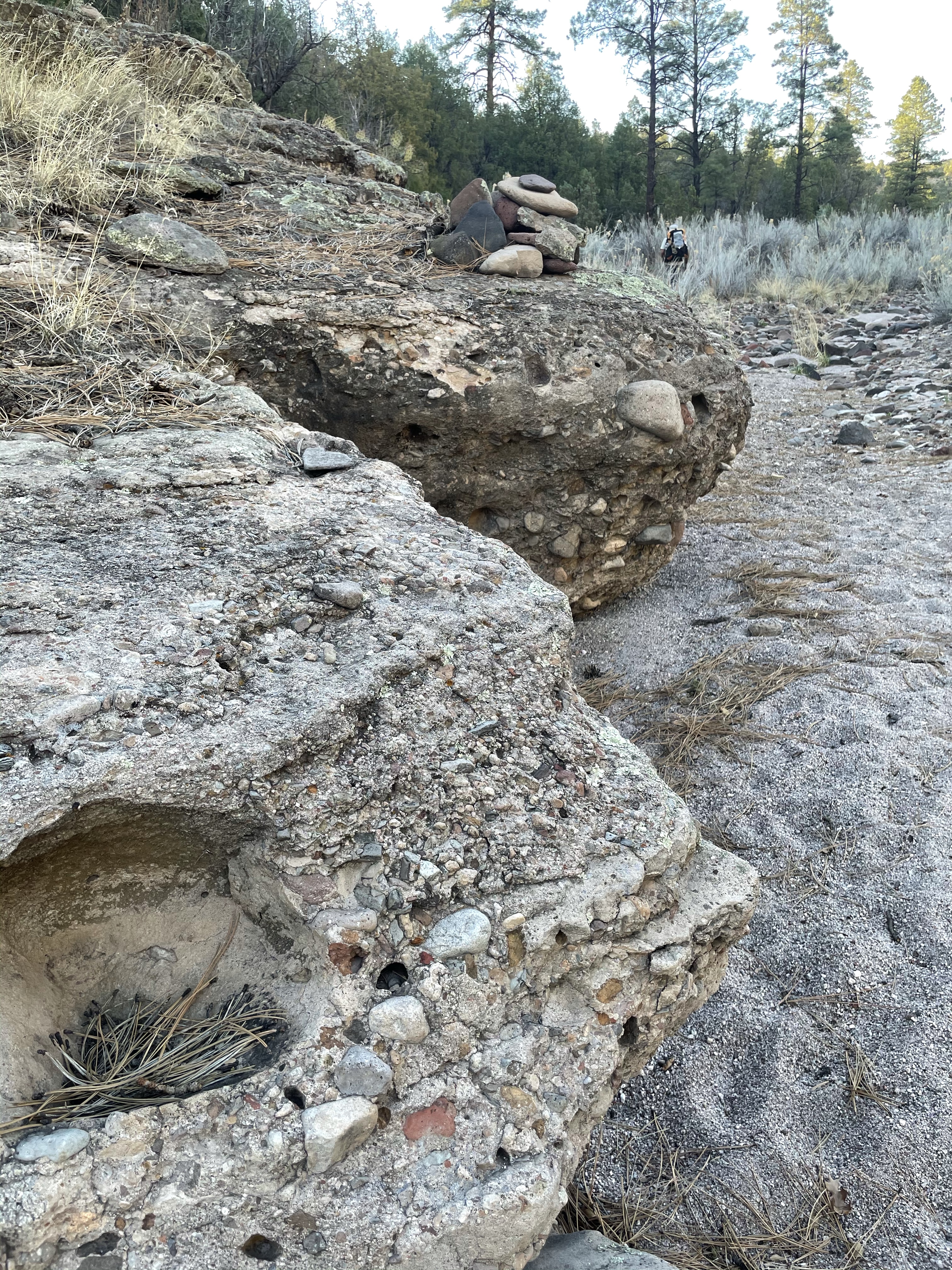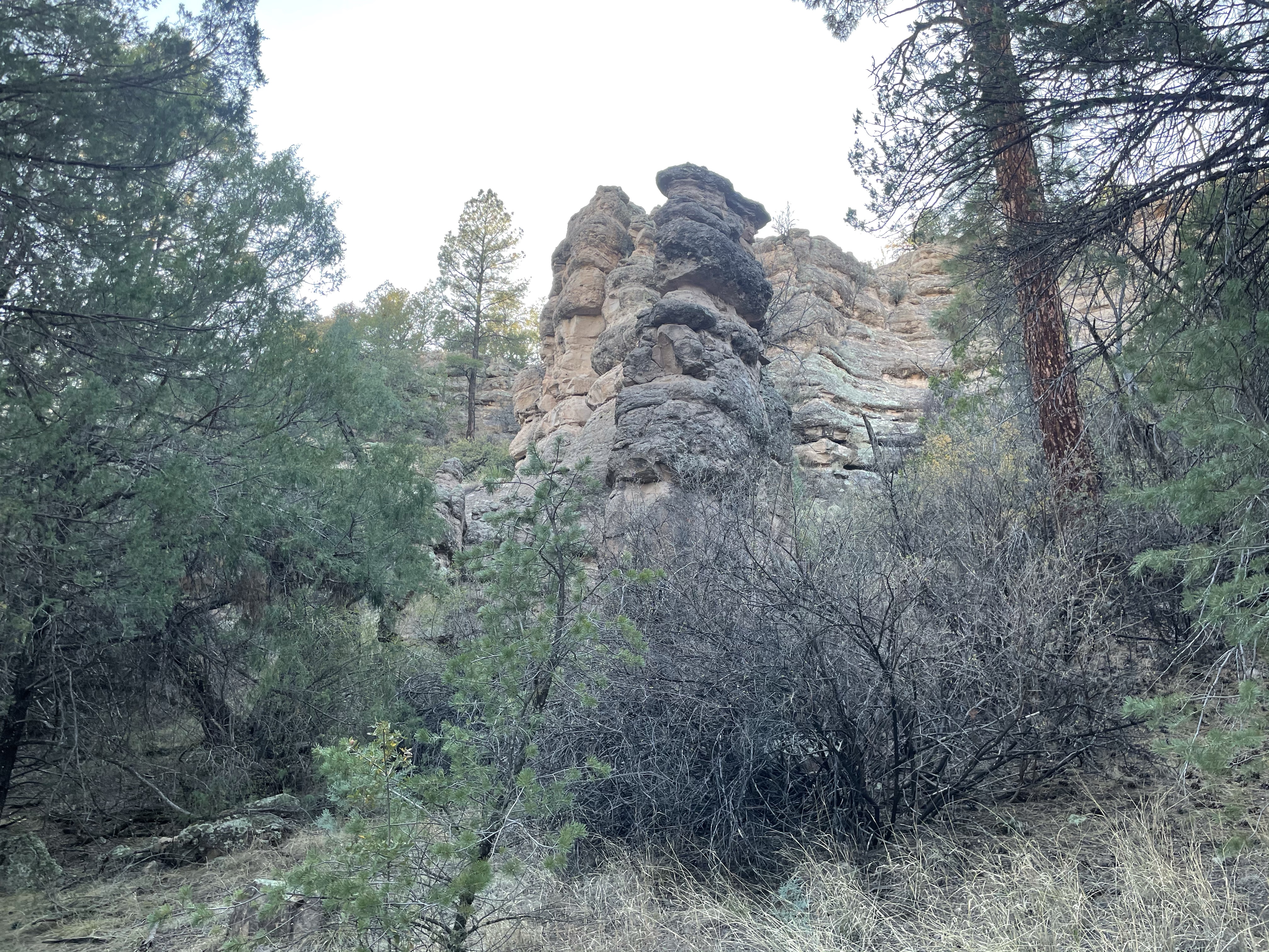 We crossed into our first wilderness area of the trip, finally – the Gila Wilderness! As soon as we were through the gate, a magic descended: we were in the canyon, we were in shade, it was deeply, peacefully quiet, there was no cow shit anywhere. The trail was well worn in, and the canyon walls were some kind of…sedimentary conglomerate? of volcanic chunks? I’m not sure, but they weather into spires and hoodoos.