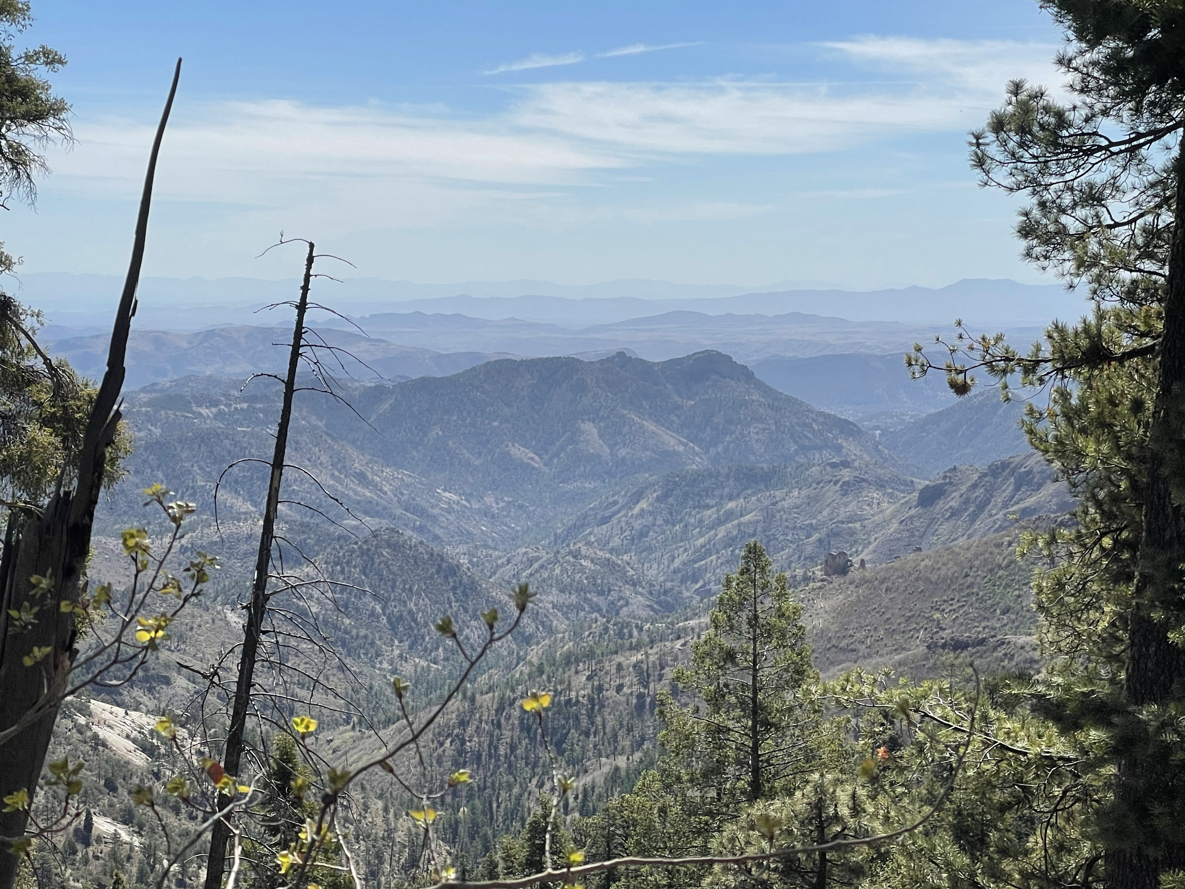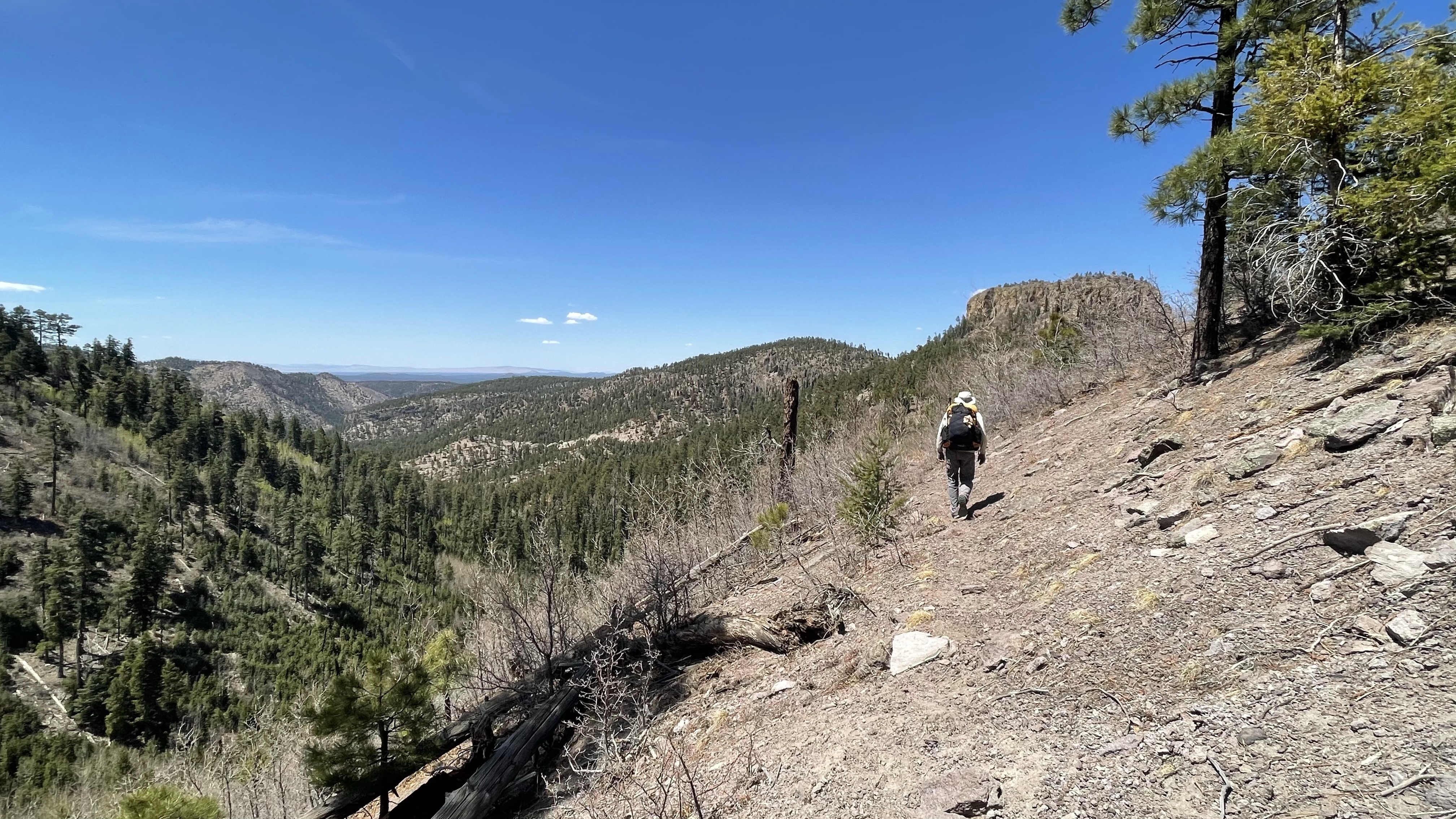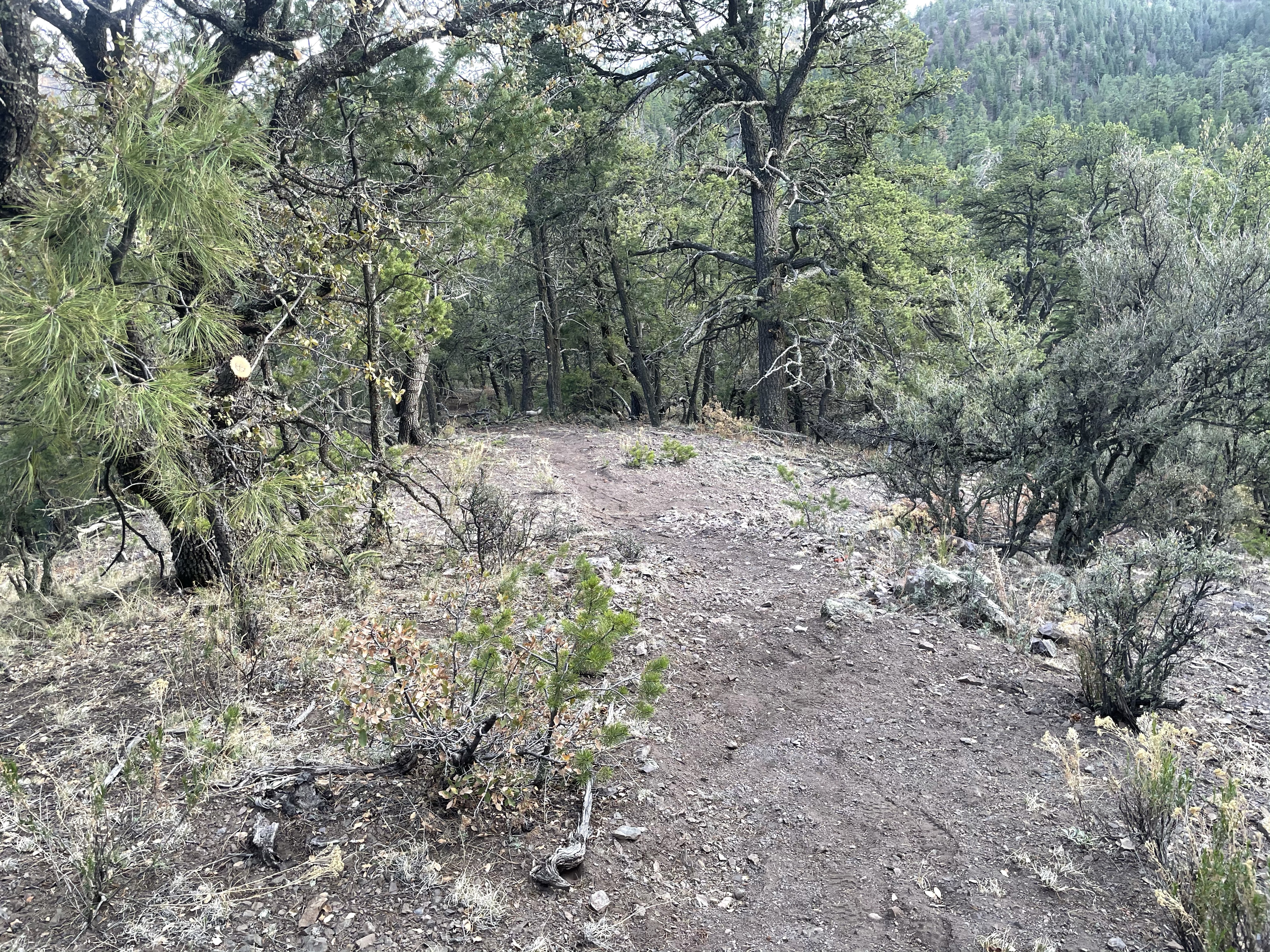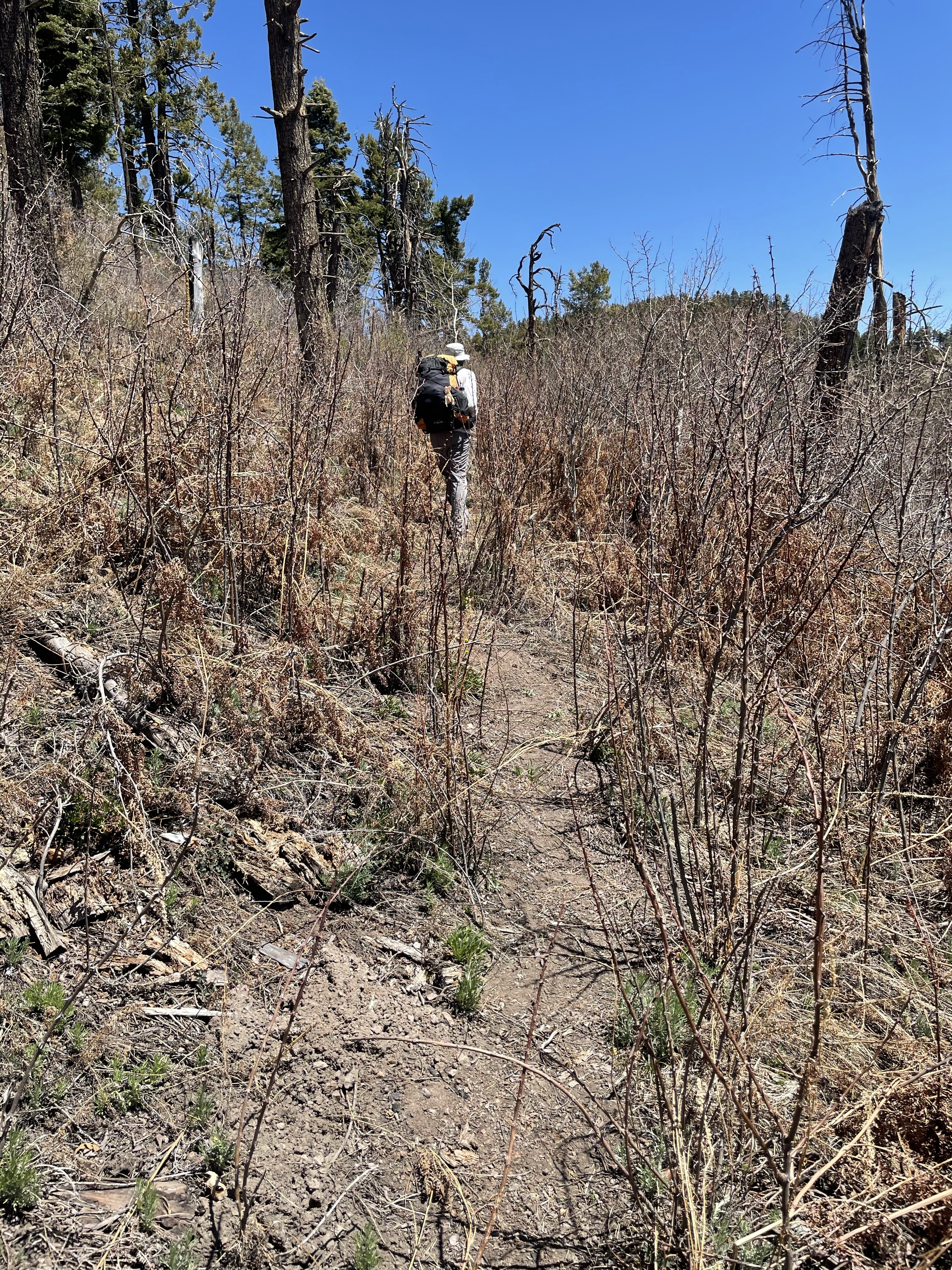 A few slow, thorny miles brought us to where another trail on our wishlist – the Grand Enchantment Trail – joined the CDT for a stint. That was where we’d planned to get water, but now there was no need. Seeming to be mostly out of the burn and back into pines, we slowly climbed Diamond Peak, dropping our packs for the summit spur, which had fabulous views. We’d hoped for a fire tower but only found the 4 defunct leg bases, concrete squares and metal attachments, and rolls of old telephone wire. A white insulator was still nailed to a tree fallen across the trail.