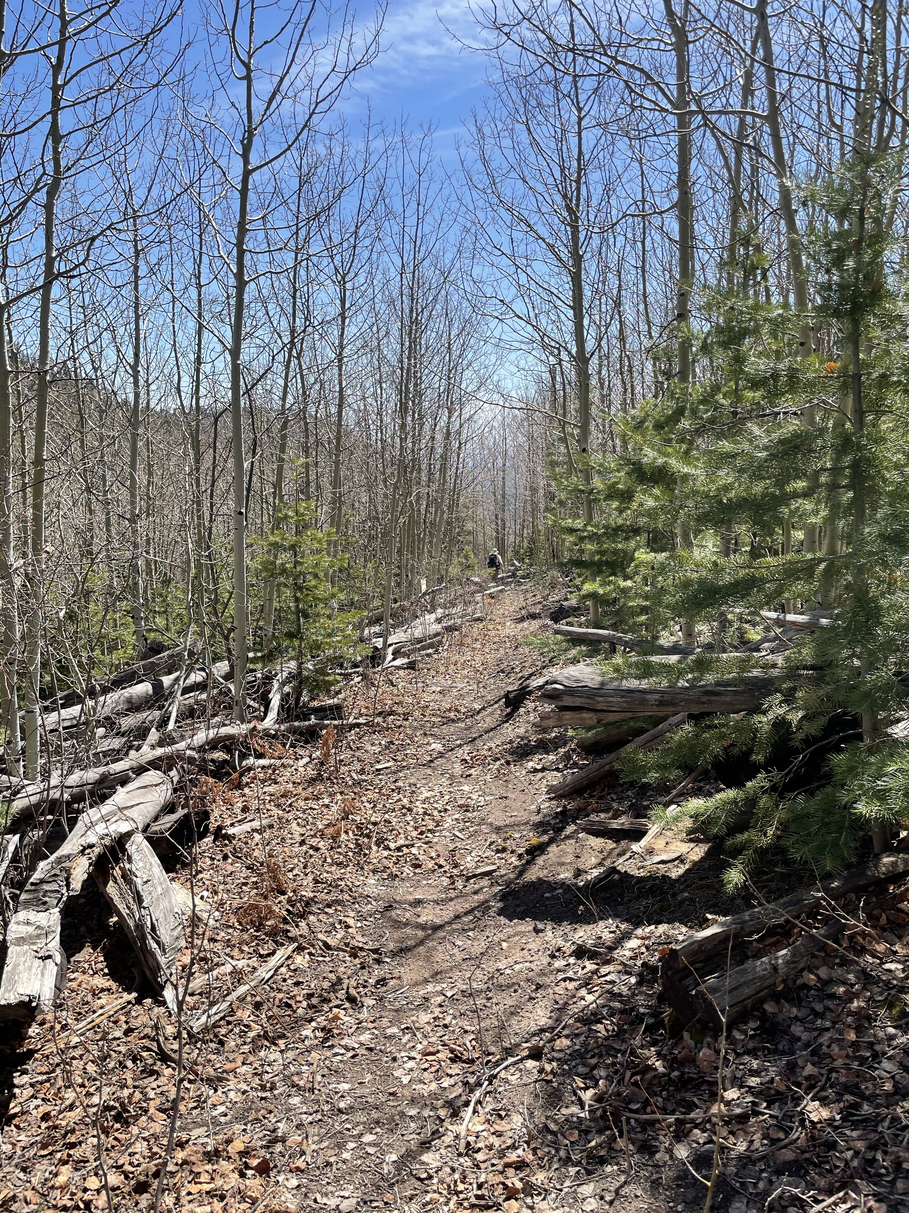 Looking back past Black Canyon, the crest looked about the same as it did right here, which is to say, not too bad. Over our next rise, the more tangled regrowing forest appeared impenetrable, but the path magically unspooled onward, very faintly. New aspen crowded close together, way too many locust bushes tangled the understory, but it was far, far from the worst trail I’ve ever been on. There were some snagged clothes, some moments lost to disentangling, but the going wasn’t slower than the uncompacted tread in the canyons. Were the previous crest miles that much worse than here? Or did we fall prey to others’ exaggerations? By the time we return to do that stretch it will be better than it is now or worse than it is now, but not the same – so perhaps we will never have the answers we wonder about.
