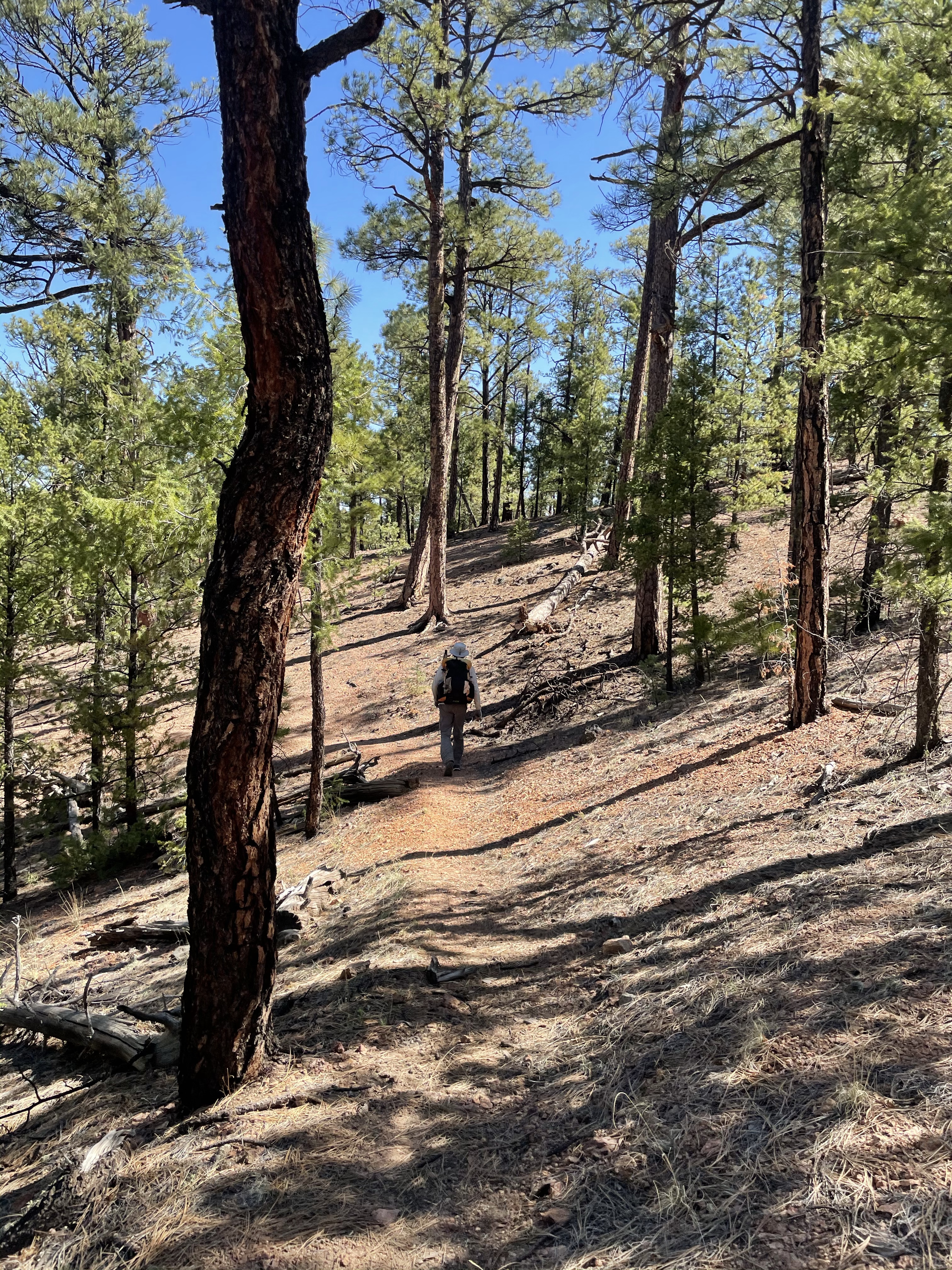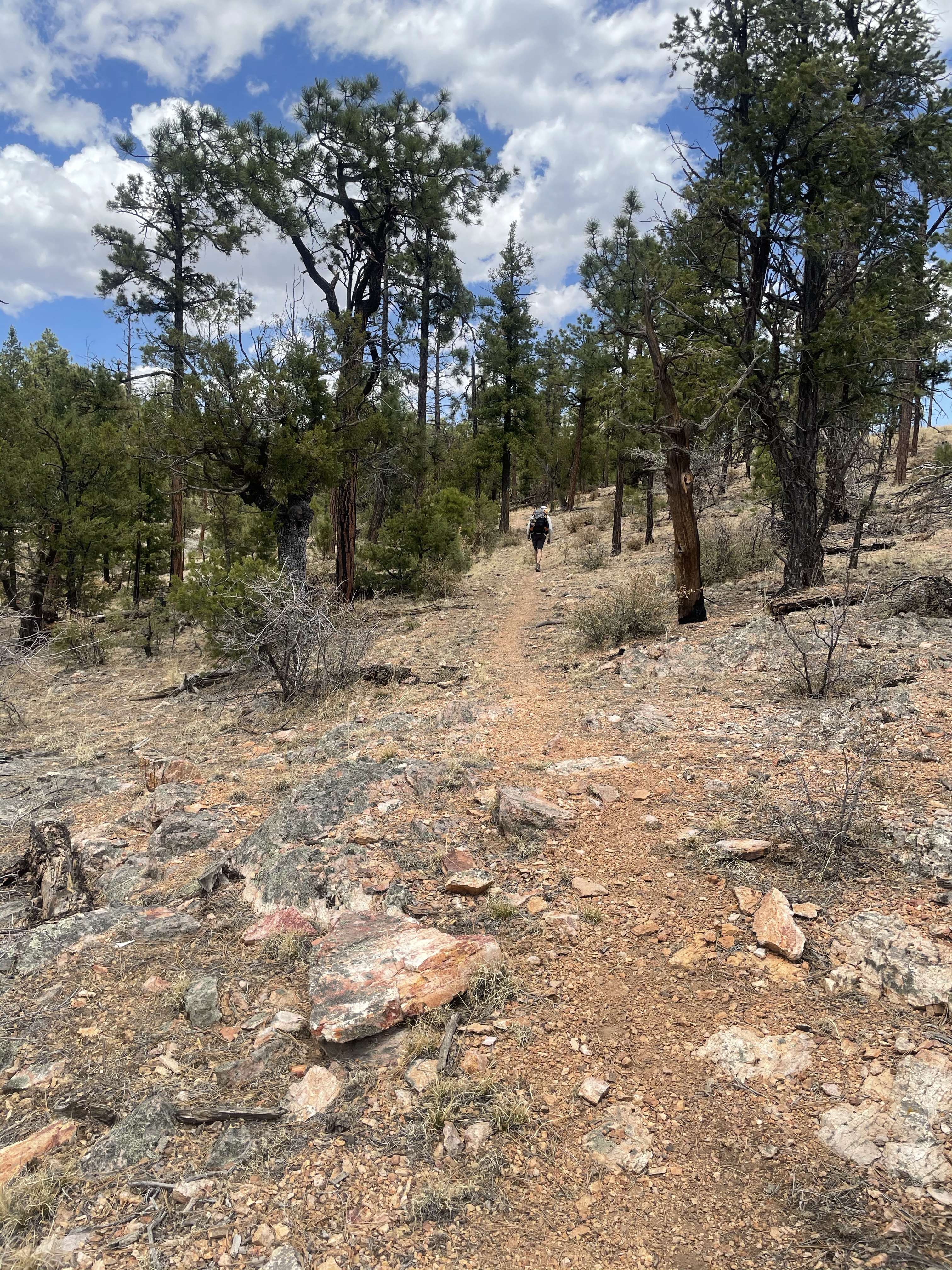 The trail was simple today, beautiful gently rolling tread winding through hills and traced ridges. Some of my favorite hiking, through big pines. The gentle crunch of gravel, the swish of pine needles, the soft rattle of pine cones kicked up the trail.