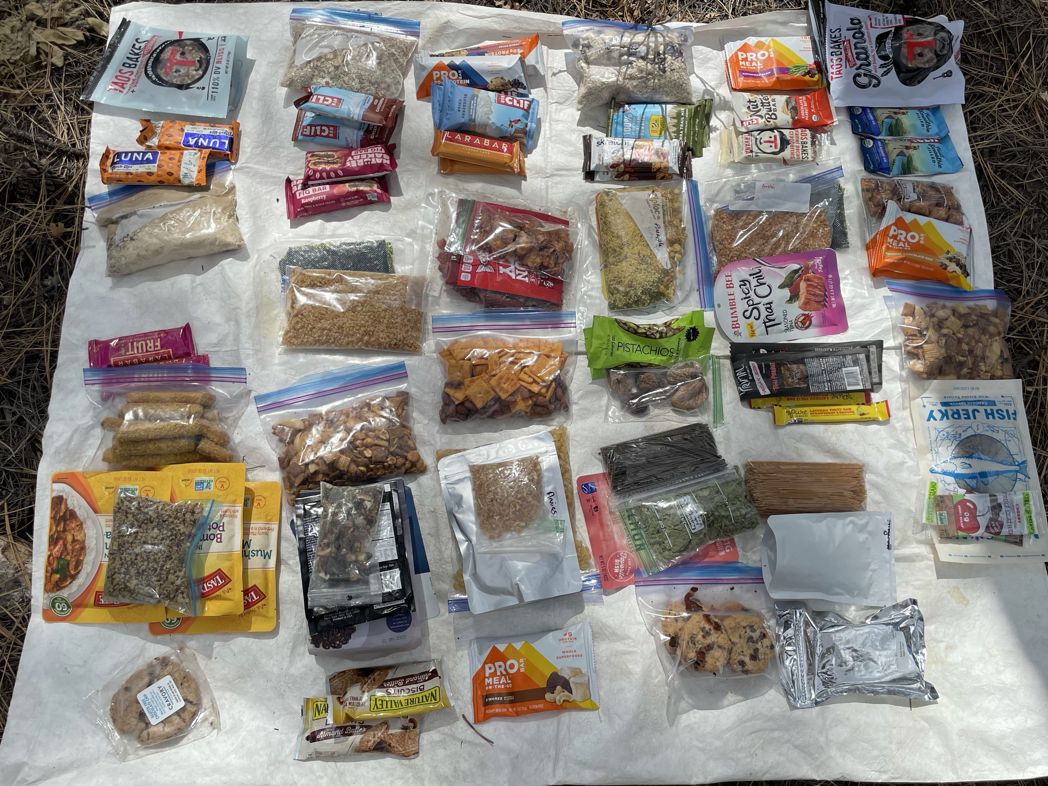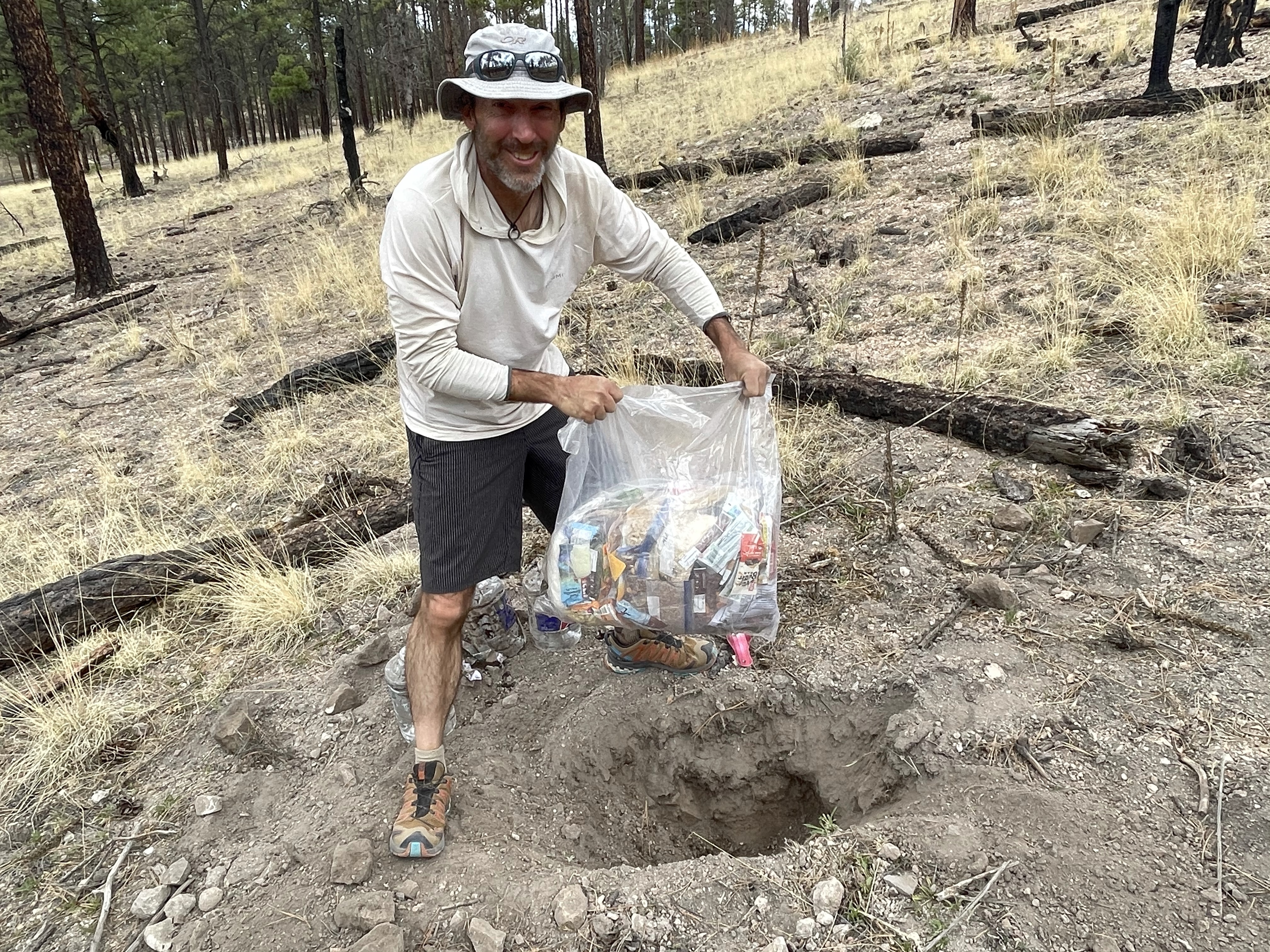 We pulled our water from the mess of charred logs it was hiding under, and pulled out our trowel to dig up the food. We had one moment where we thought we couldn’t find it, but were just off by a couple inches. Plastic finally glinted as we scooped out rocks and dirt.
