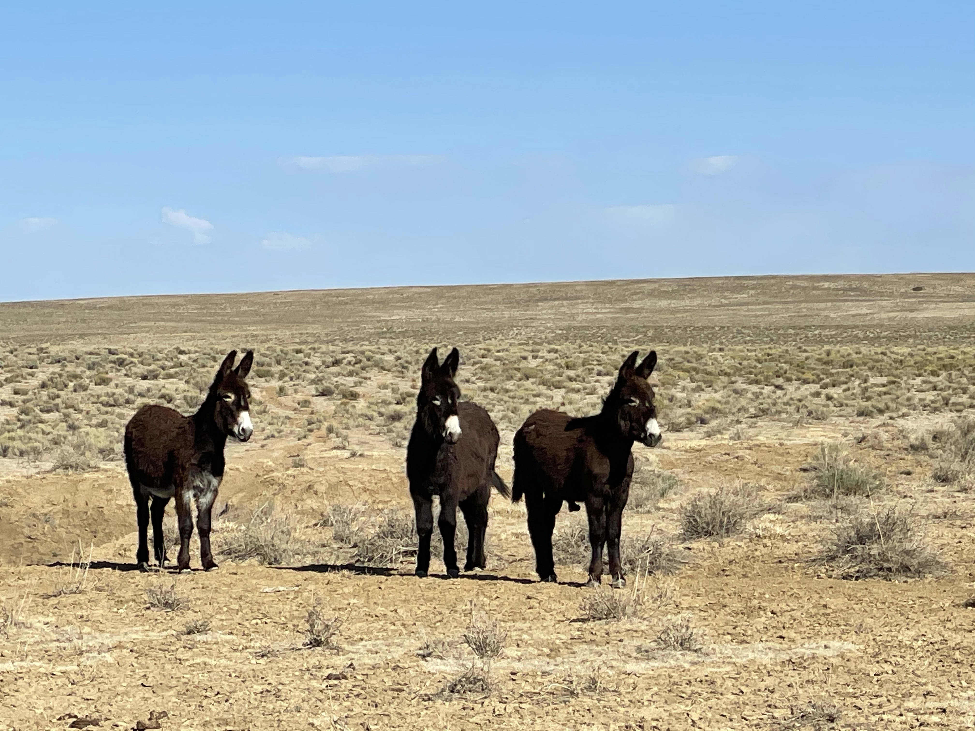 Pie for breakfast and a big pot of coffee helped immensely, and then we hit the road. A few miles along, 3 dark shapes were clustered at the side of the road, which I assumed were cows, until we got close enough to see them. “Burros!” They watched us with curiosity, even seemed like they might come closer if we waited long enough. “They’re like tall puppies,” Vince had said last night with authority, “they love gettin’ skritches.” But we had miles to cover.