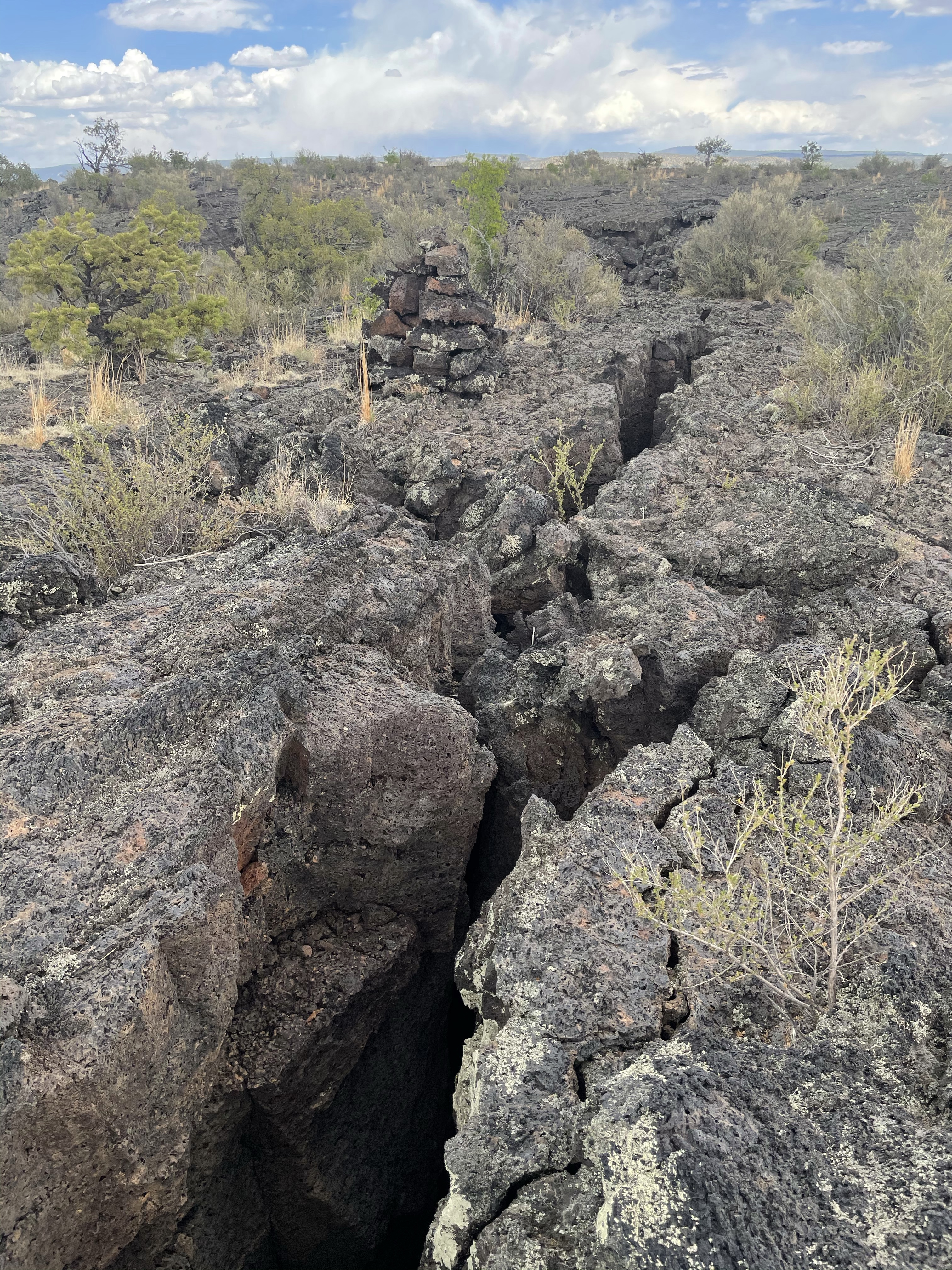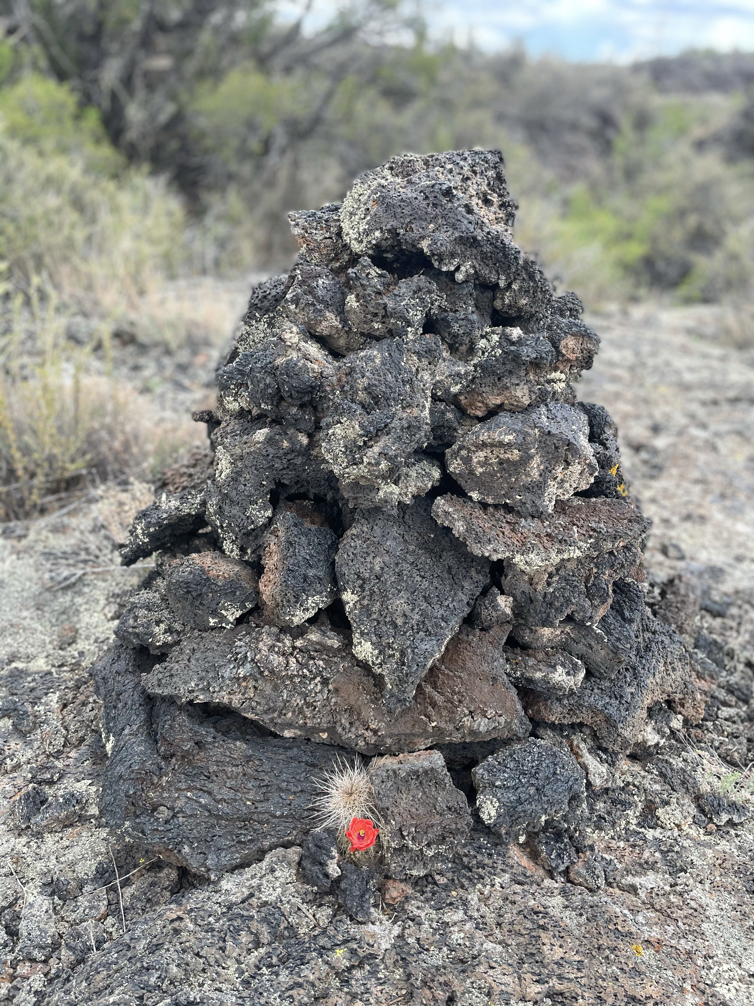 Cairns led up and onto the lava, and twisted through the easier passages between wrinkled, collapsed domes and long, crumbling cracks. It was like another world, the shapes and swirls of the living rock frozen and petrified mid-flow. Bright red-orange claret cup cacti bloomed, neon flags against the black.