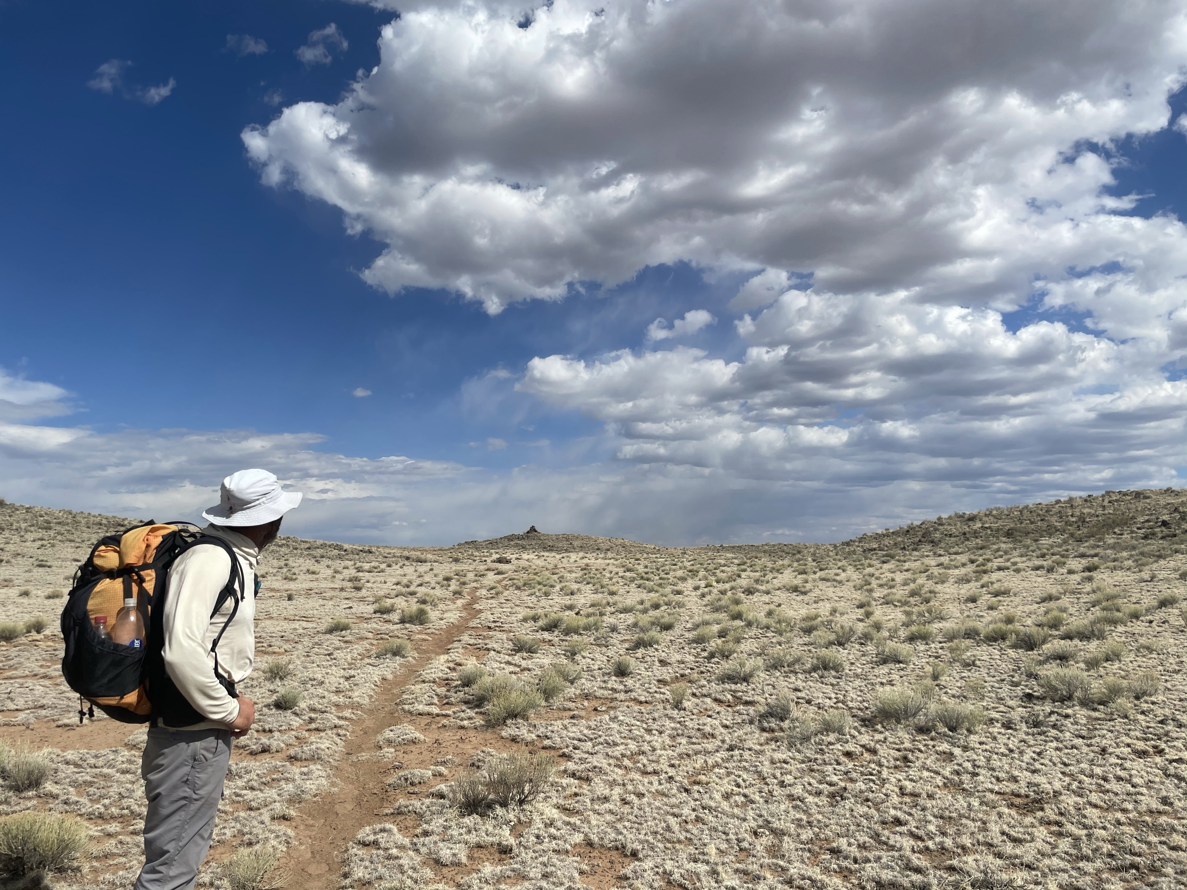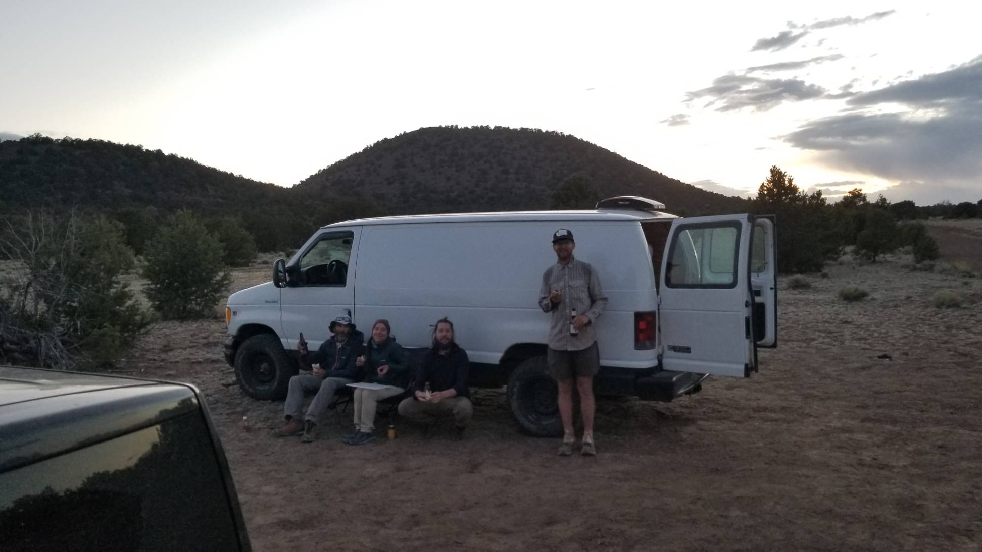 We took a 20 minute sanity break behind a clump of juniper when neither of us could stand the wind another minute. We likely would have just camped there, if not for plans to meet the others, so we cranked up some music and rallied. Every half mile came harder and slower, until finally, finally Cerro Brillante, who had hovered on the horizon all day, loomed above us, and the road cut opened in front of us, just as a little black Scion zoomed down the dirt, Vince looking out the driver’s window instead of my direction, and then out of sight. I sighed. I didn’t care how good of a camp they’d found, I was not walking any farther today.