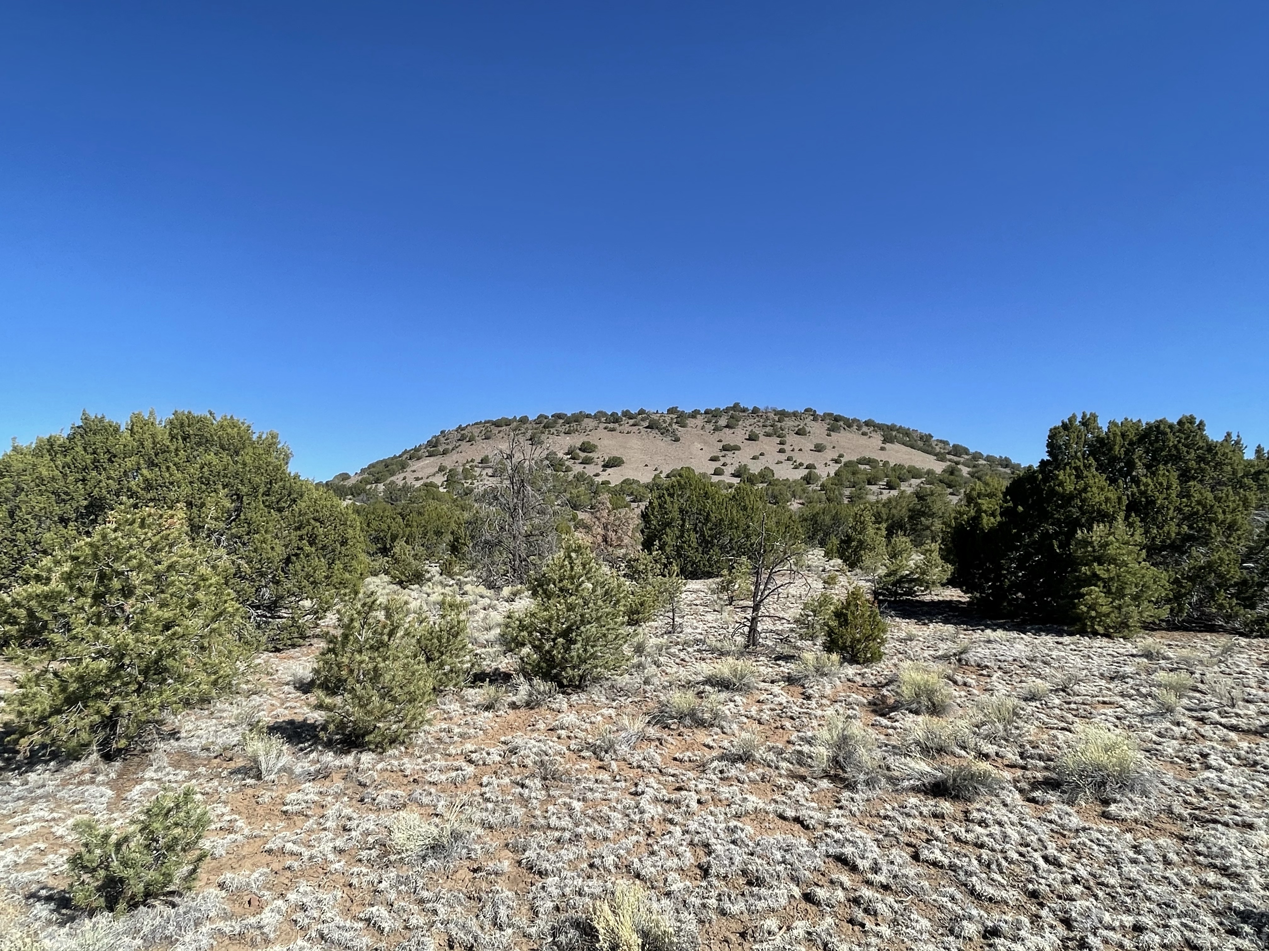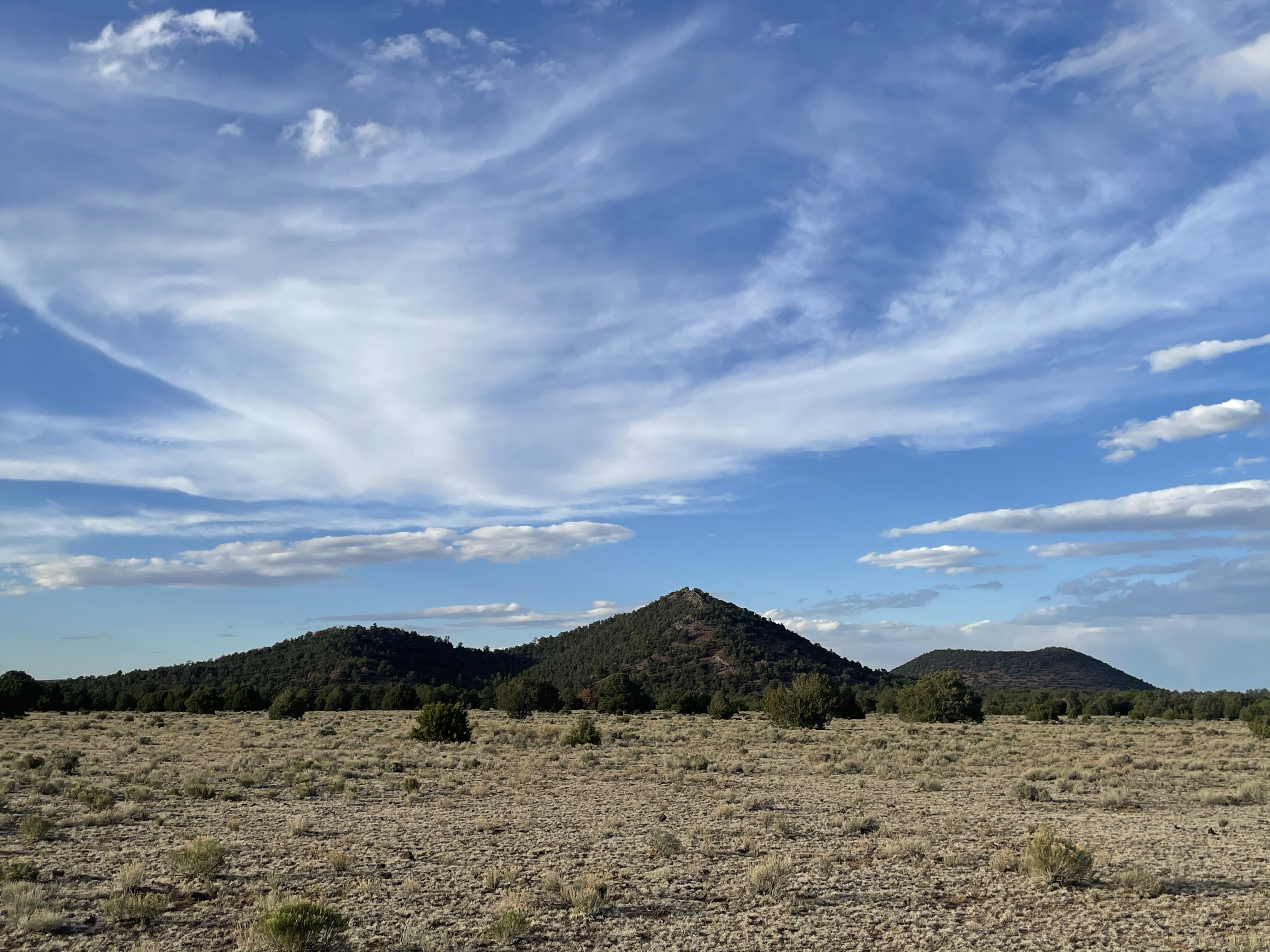 Geez it was hot today. Quite a few fences crisscrossed these badlands, and rocks were piled at most of the crossings in primitive stiles. There were a few views through the trees of the chain as a whole, craters slouching at intervals. The water we were rationing for ourselves wasn’t quite enough, and the miles were coming so, so slow. We finally stopped to cook dinner in the shade. Watching the clouds, watching some pronghorn, getting some food down, splurging on water all helped, and by the time we started again the cool of the evening had set in. A different world! Suddenly the evening was beautiful. Pronghorn scampered away from us, a cross trail was imprinted with bear prints so fresh I could see the creases in the pads of his feet. GT caught up to us again (we’d leapfrogged a few times through the day) and bemoaned how awful the water source had been, gross and slow to filter. The twilight grew thicker and we watched a bat do it’s acrobatics, swooping after bugs, chirping it’s shrill sonar. We tucked between two pinion pines as the sky flamed into sunset.