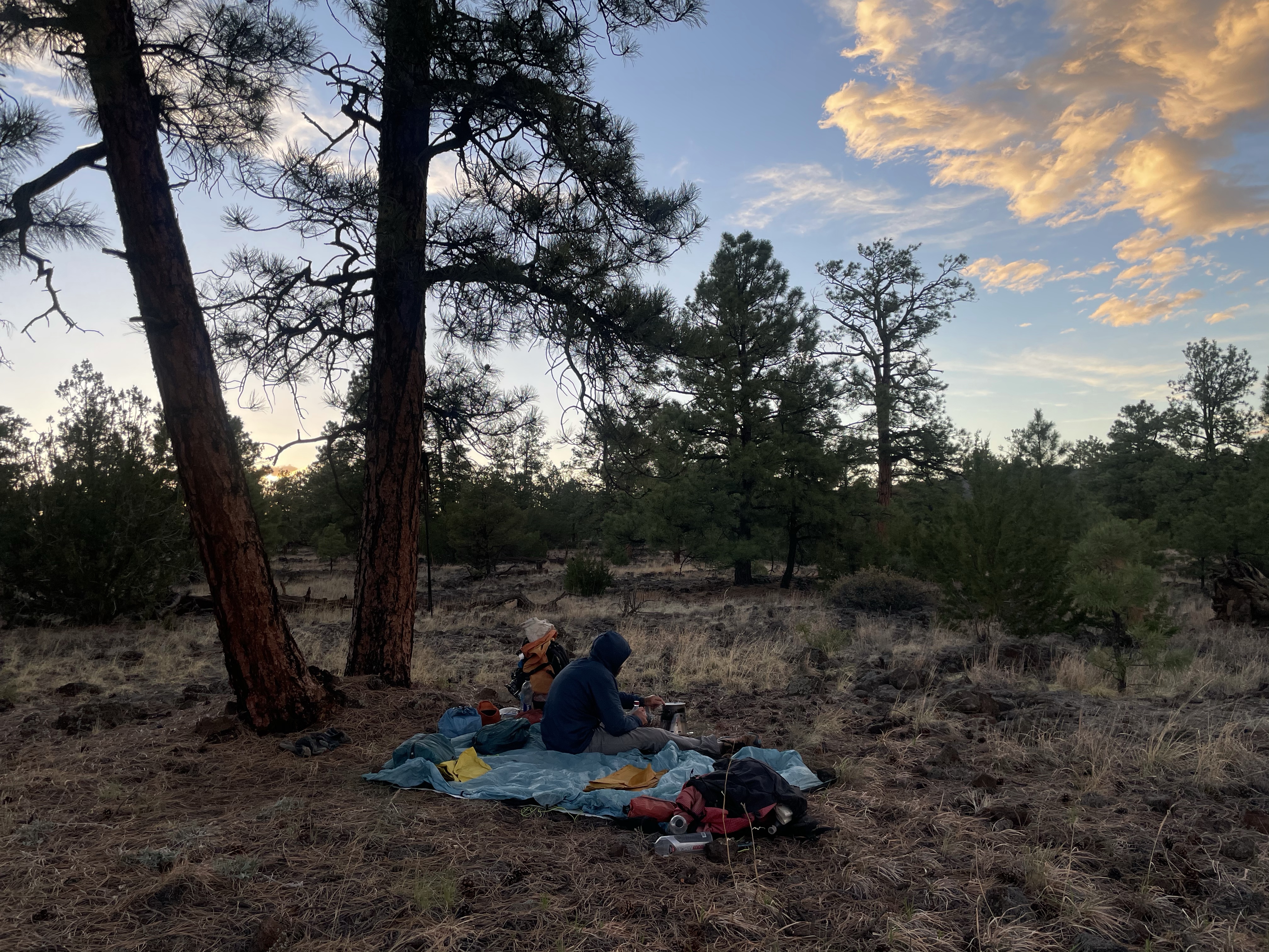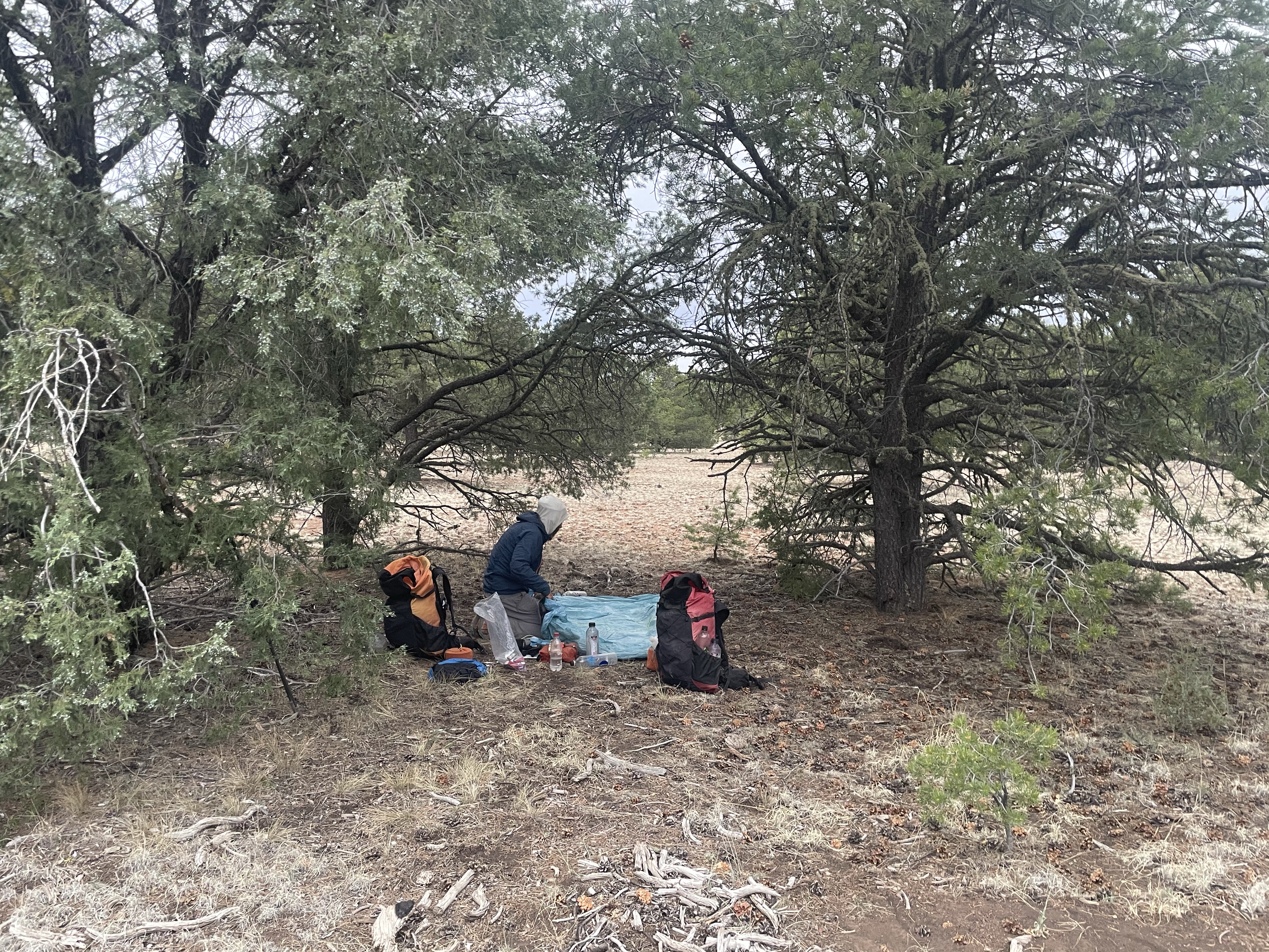 We finally found a spot at the base of a split pine where the rubble was flat enough we’d be able to sleep on it. It hardly blocked the wind, but I was to the point I’d take what I could get. “I guess if it rains we can burrito roll ourselves in the tent,” I conceded.