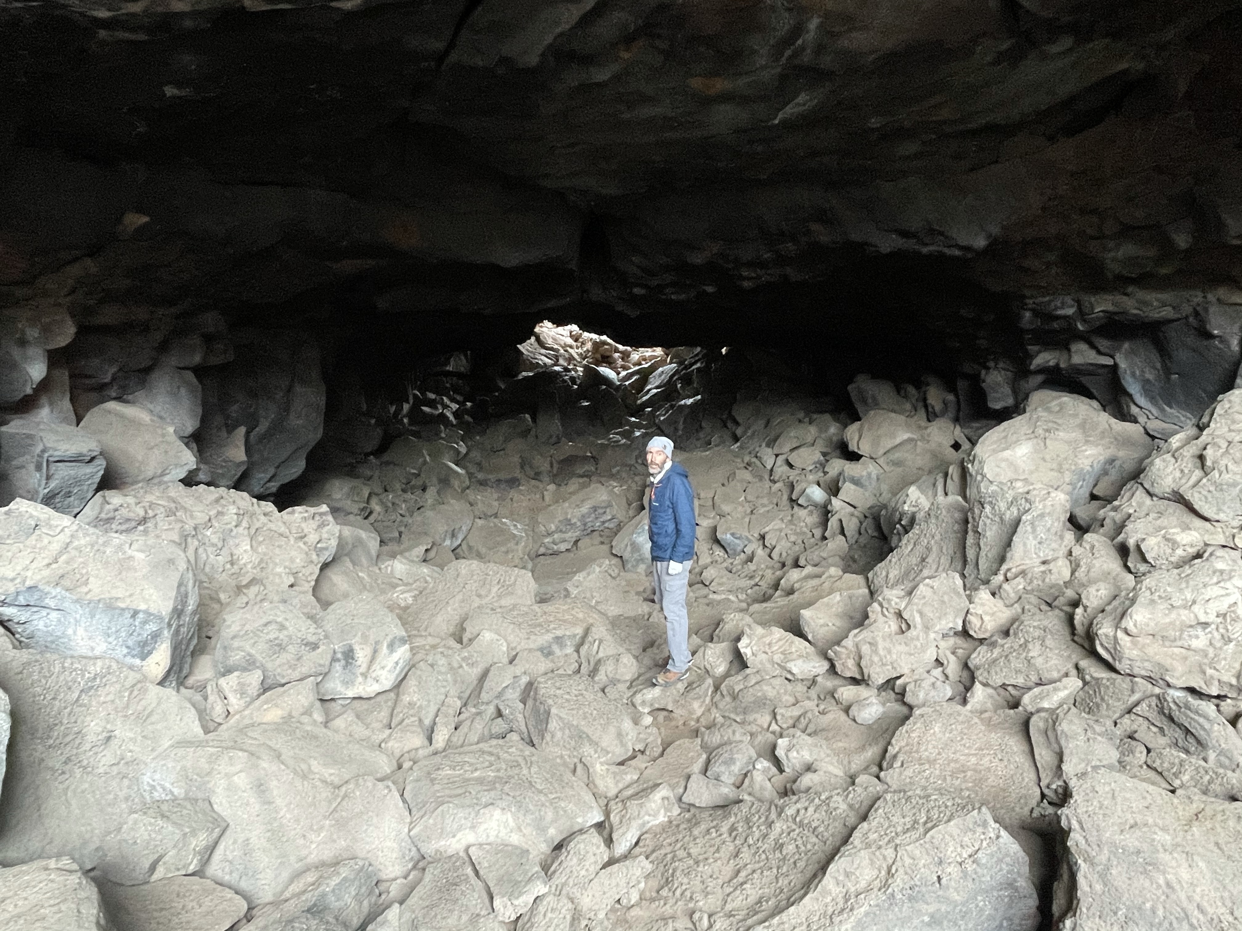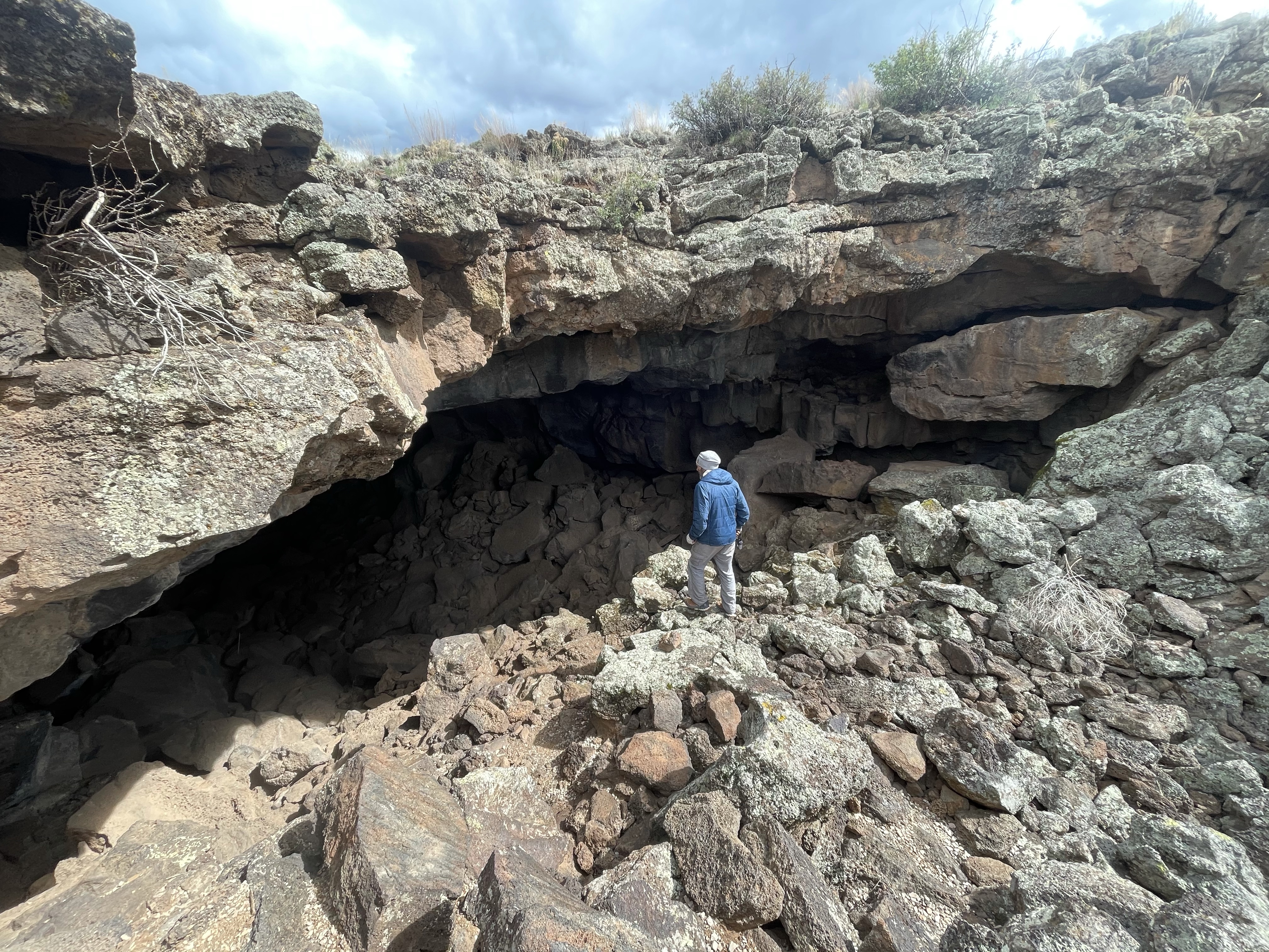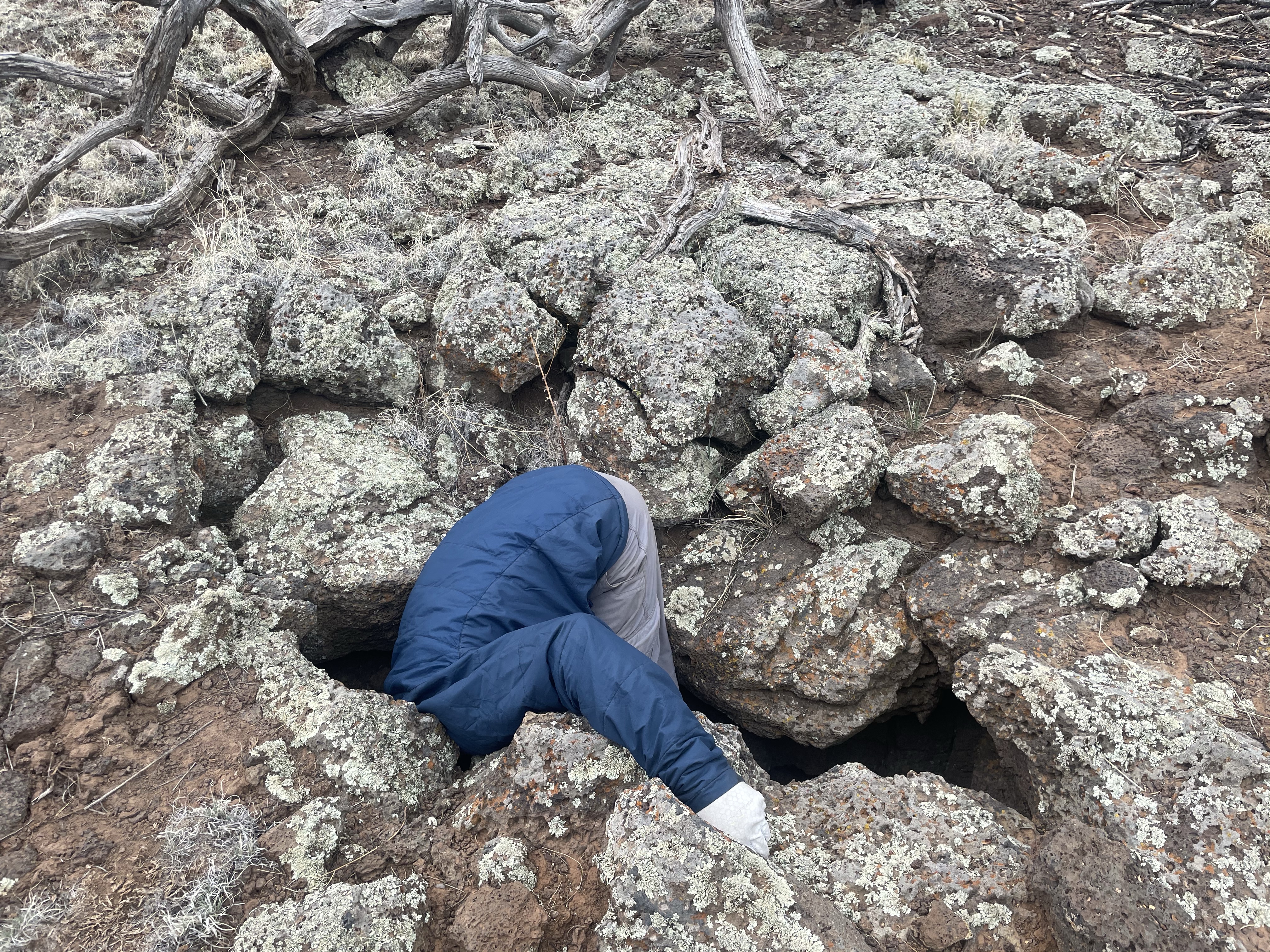 A parking area, an NPS info sign, a wide, manicured gravel pathway which was not the CDT. The star attraction lava tube caves were closed due to Covid, but a small cavern at the nature walk entrance tempted us down to investigate. Oh, I can not wait to come back when this place is open!