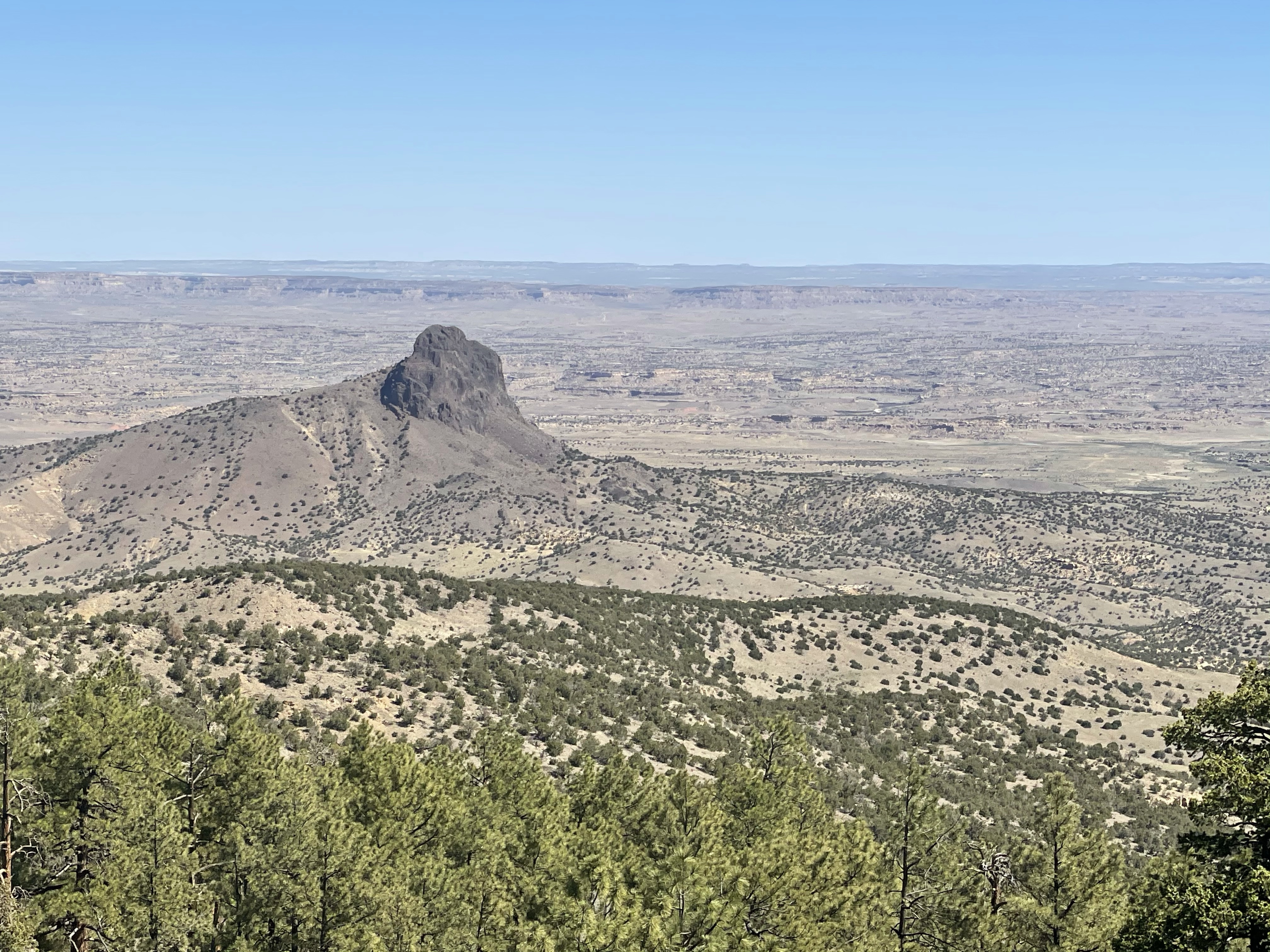 The forest opened at the sheer edge of the mesa overlooking Cabezon Peak and surrounding badlands below. We ate a snack, drank some water, then were off again, more miles of flat, until our descending edge appeared.