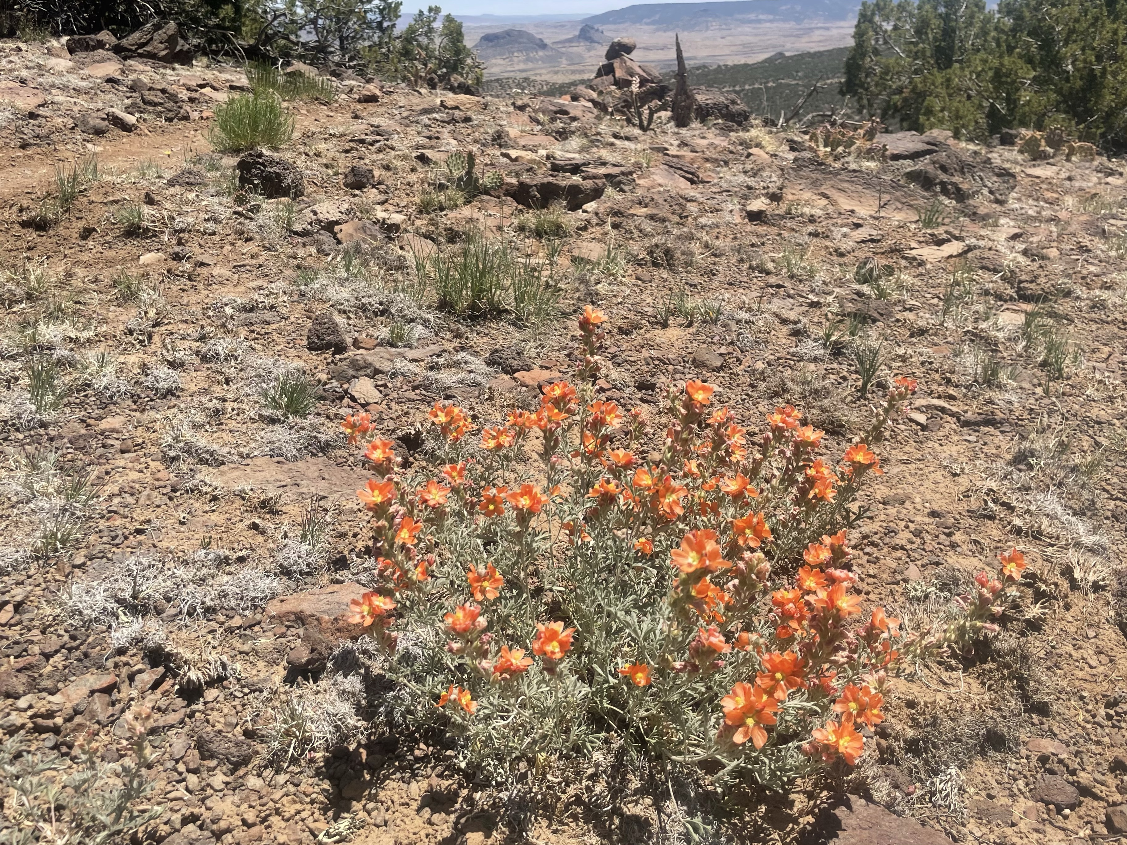 The sides and strata of these mesas held so much variety, the vertical miles were often more intriguing than the horizontal. Bright green oaks shaded short volcanic walls, big ponderosas shaded small sandstone shelves. Incongruently, as we dropped and the land grew sparser, the flower blooms multiplied. Orange desert globe-mallows, yellow-blossomed prickly pear, and fancy white mariposa lillies: entire benches just covered with mariposa lillies. I had not expected those.