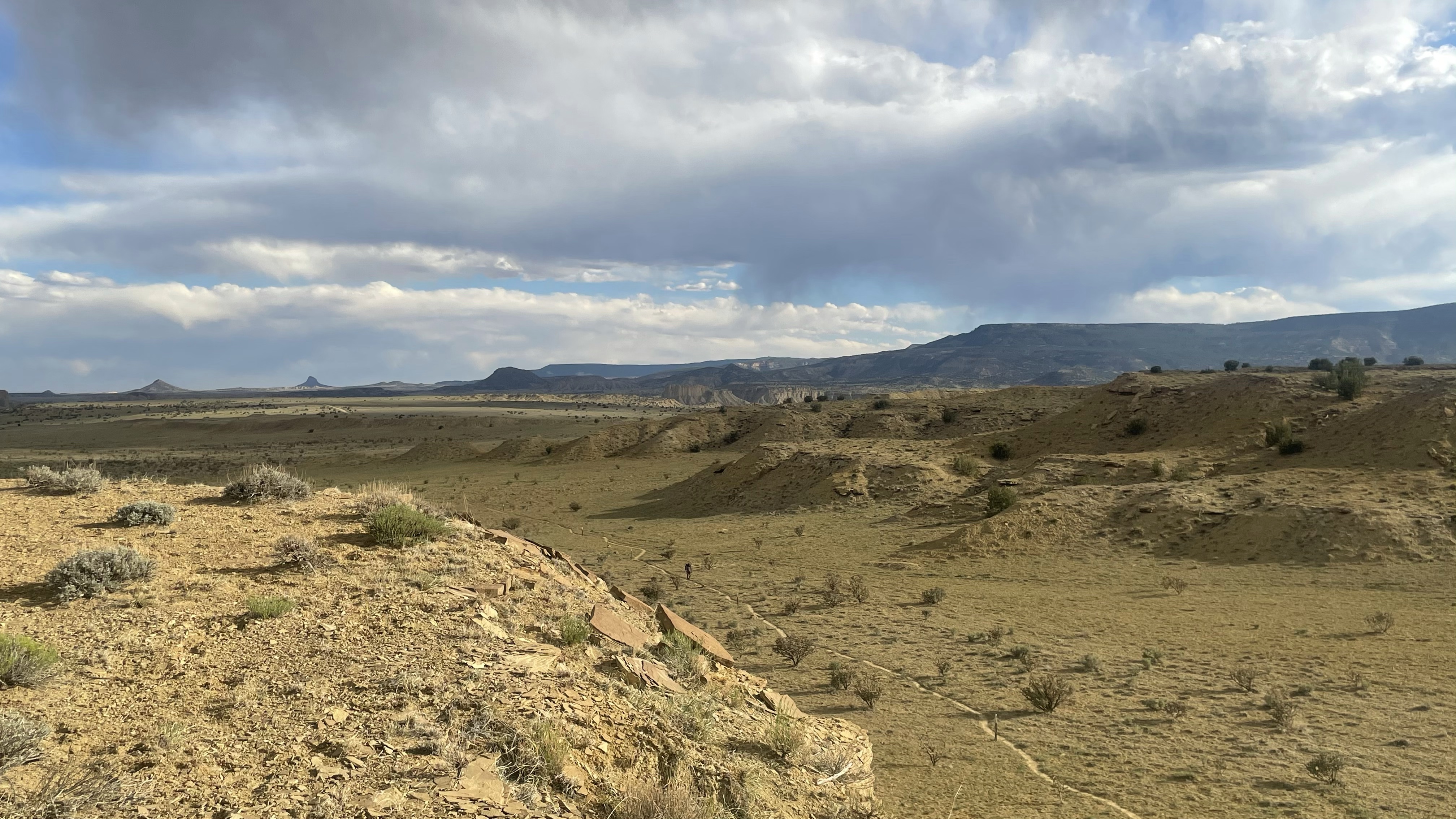 As we hiked away, clouds rolled in to cover the sun. My mood brightened another notch. We didn’t really have the water we needed, and I was already thirsty, but this would help. After a bit I stepped off the trail to pee, and when I was done I realized with a start one of the fattest rattlers I had ever seen lay only two feet behind me. He hadn’t moved or made a sound. I scampered to catch up with Prana.