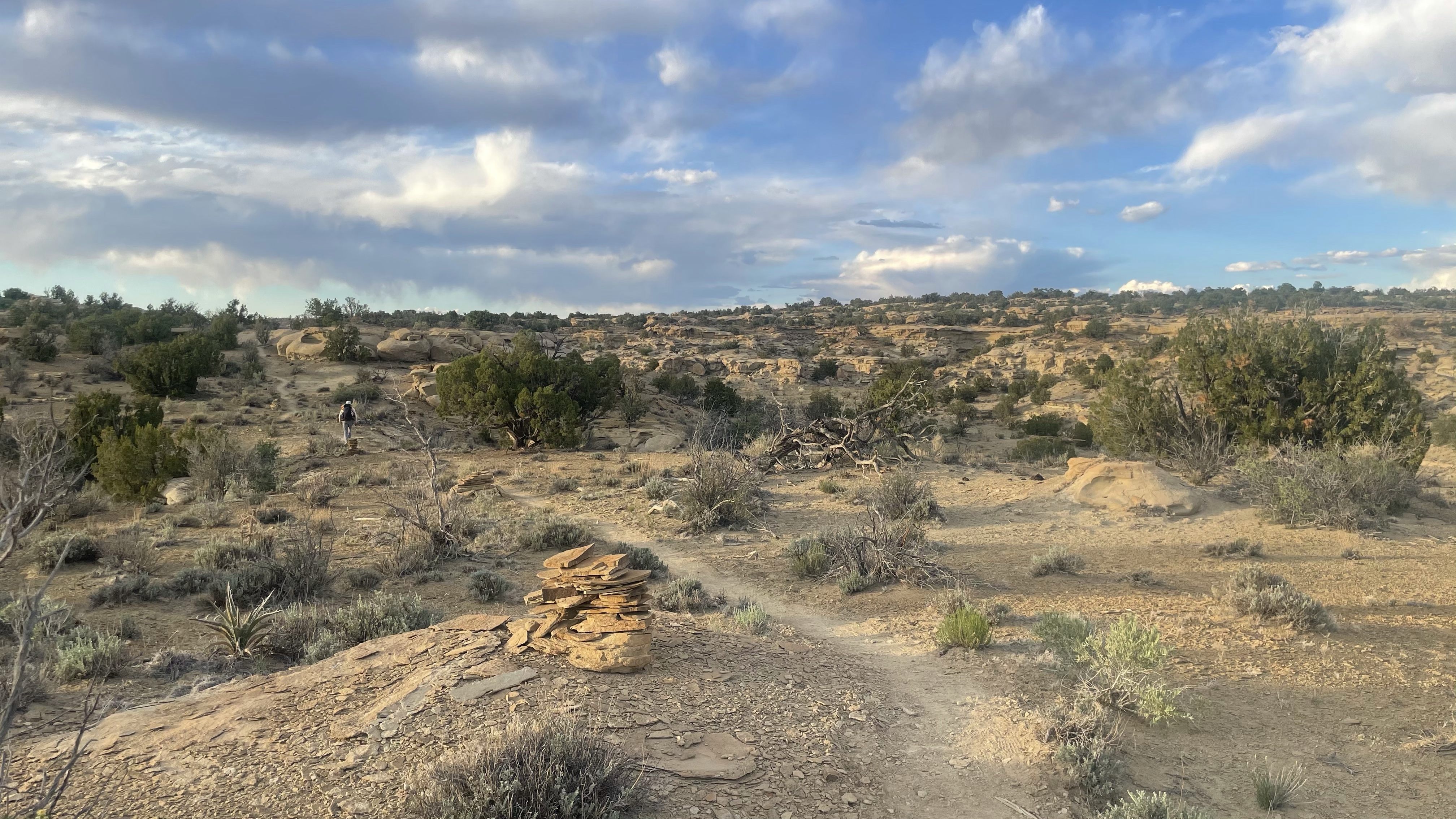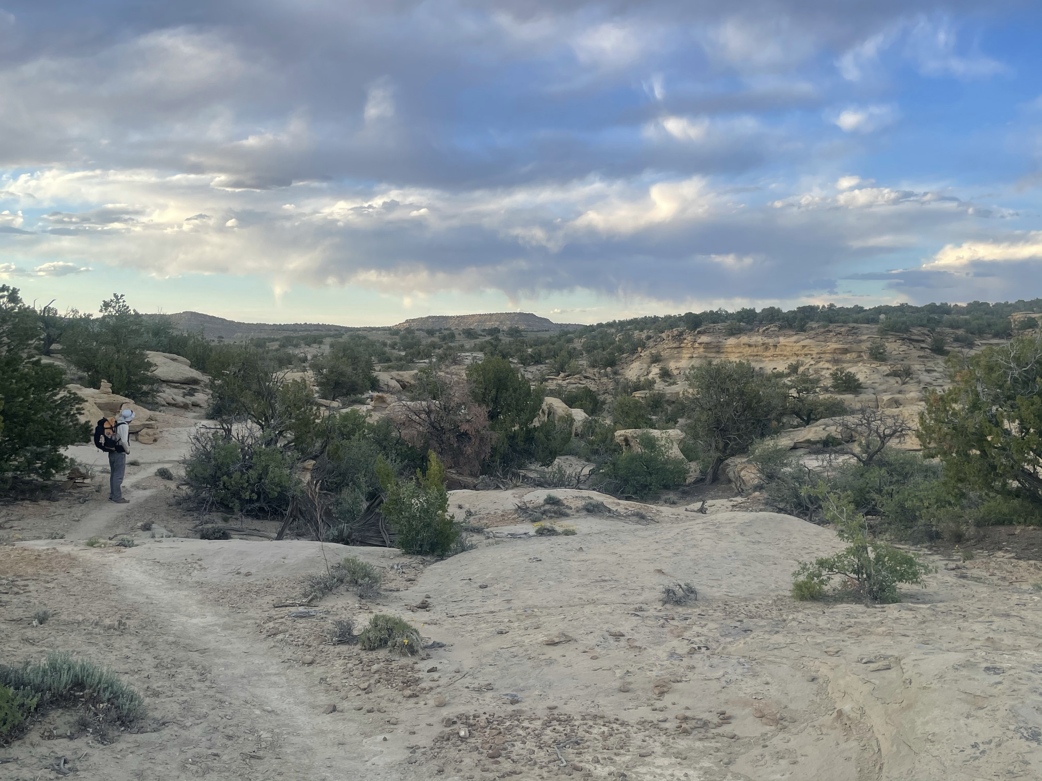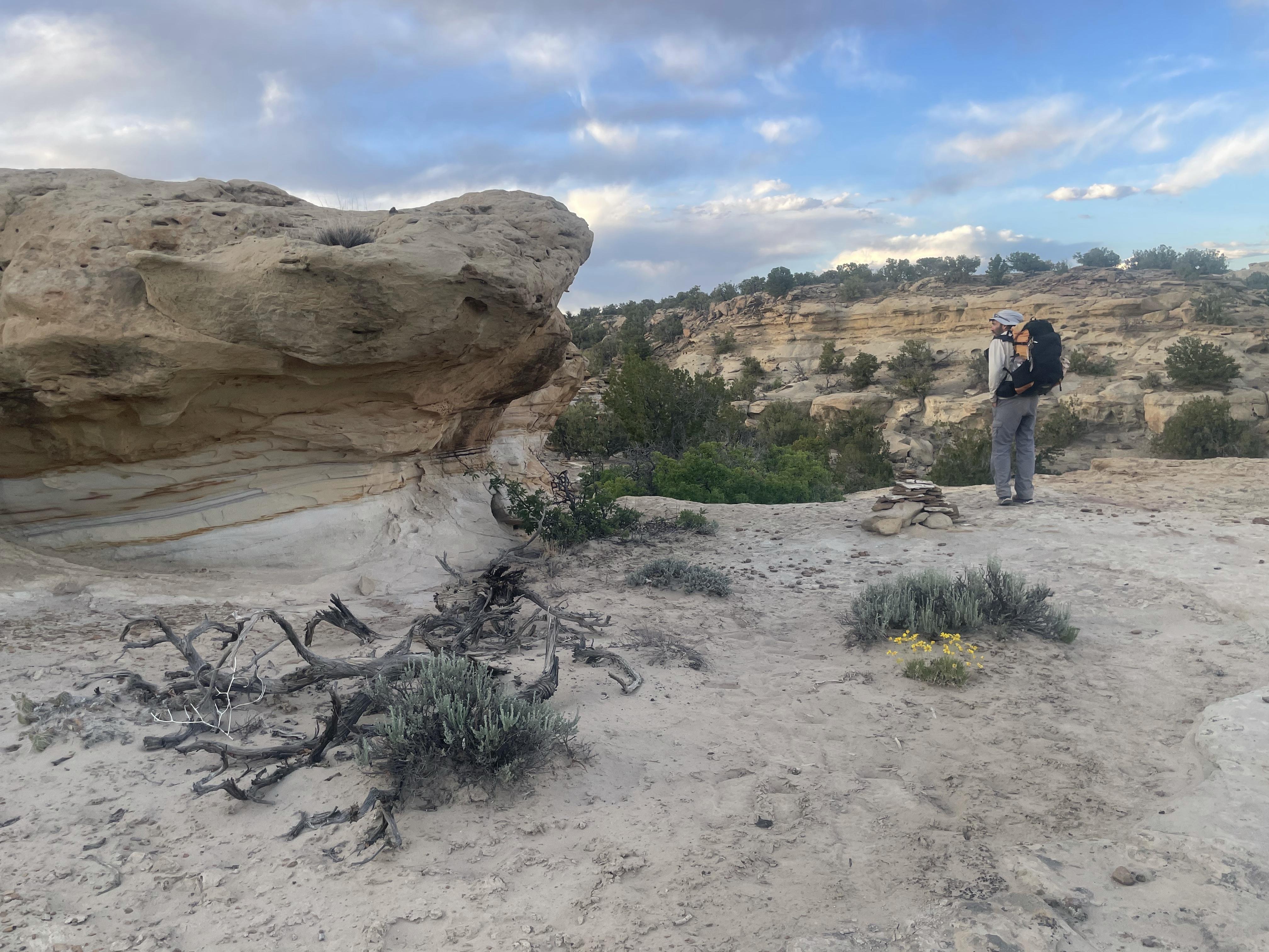 3 miles short of our goal, a white sandstone ridge offered a flat, easy cowboy camp, overlooking the twilight spectacle and ringed by a circle of stones, as if runed for protection. We accepted.