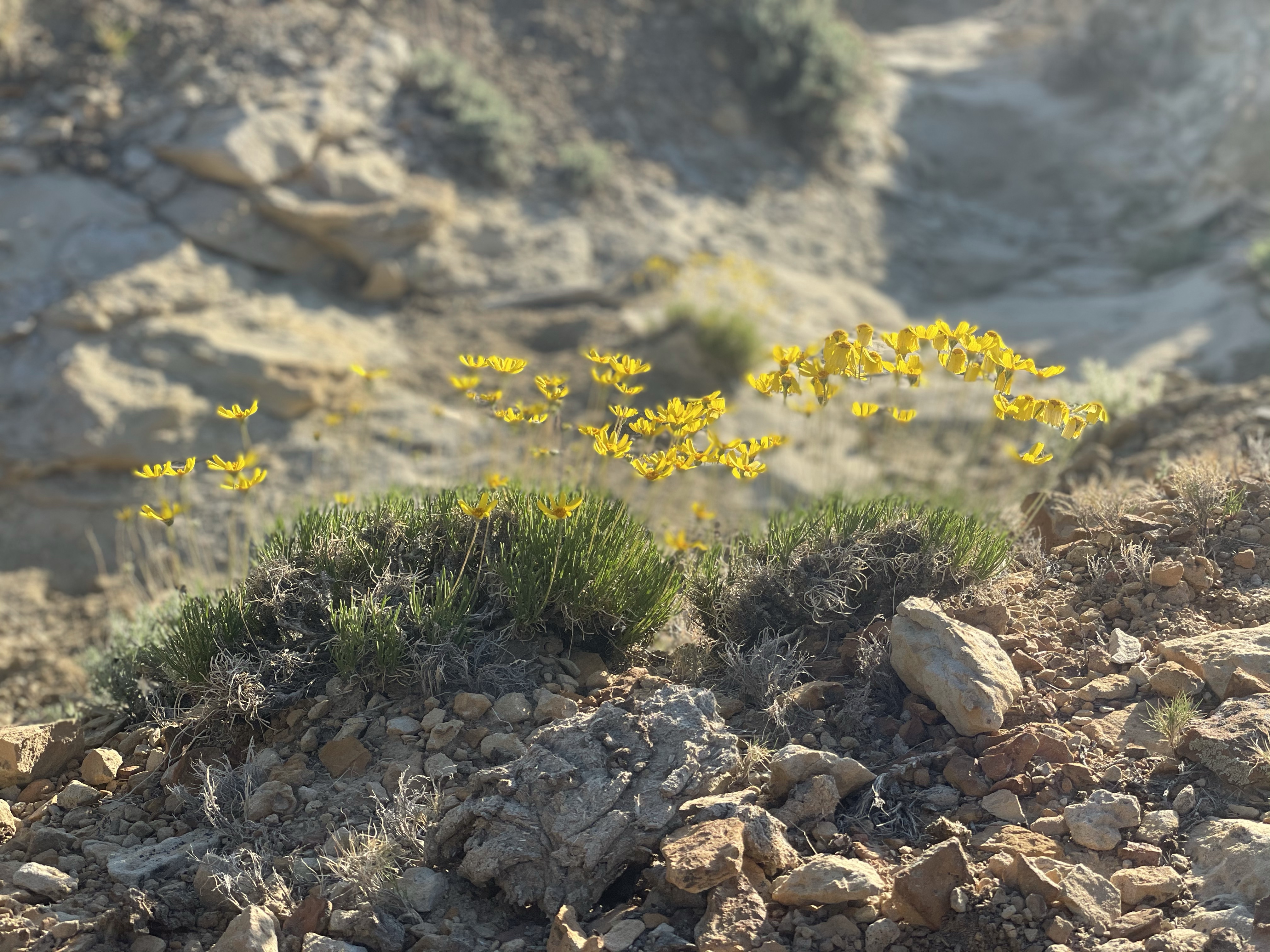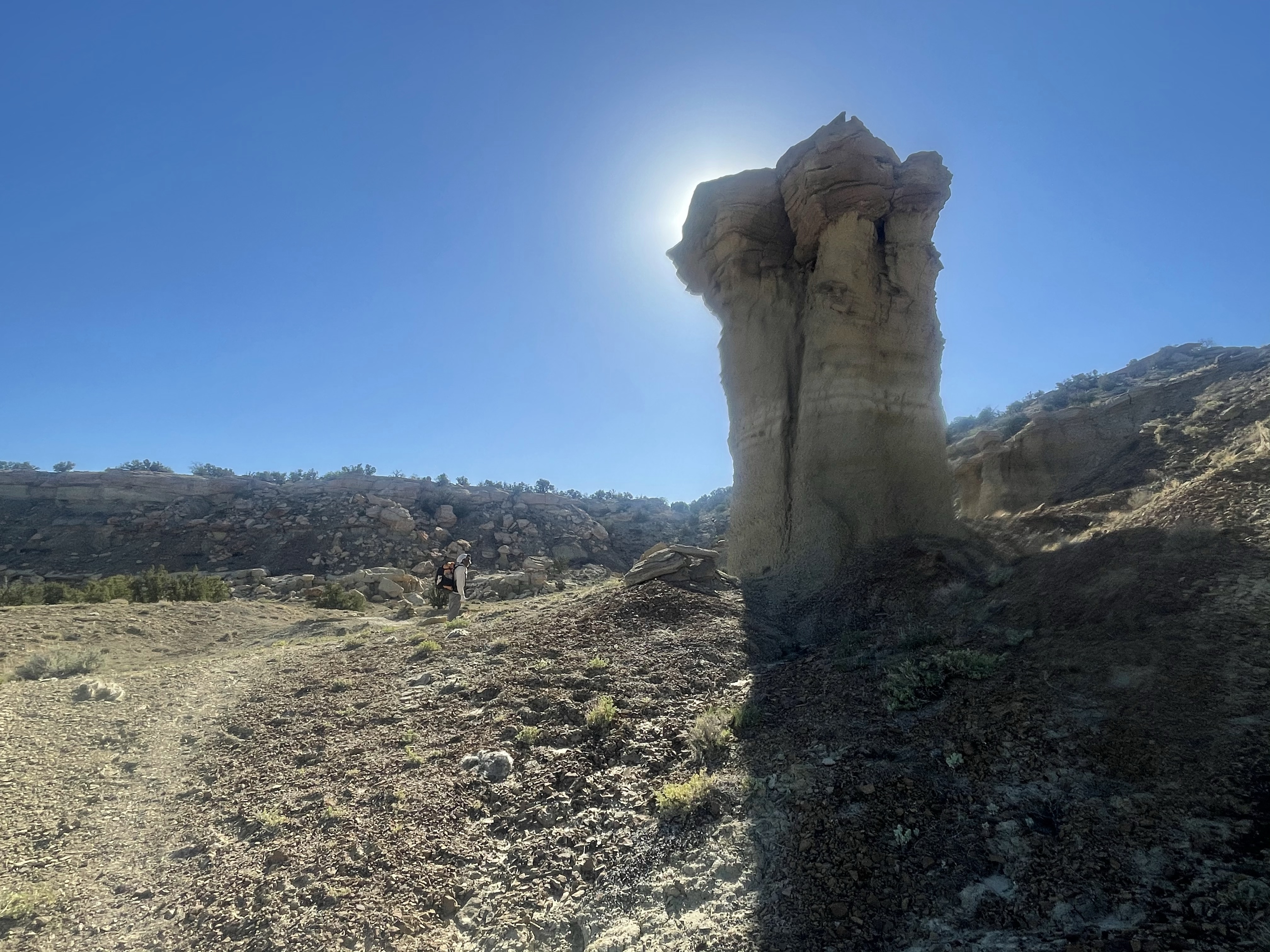 With bellies full and bottles full of delicious water that did not have to be filtered, we carried on into the heat of the day. Barren, beautiful sandstone, shale and sand badlands fully exposed to the sun. We contoured Deadman Peaks, then Cerros Colorados on the edges of a balcony level of the mesas, the hillsides just choked with the yellow and pink striped flowers for blooming prickly pear. We found a shade tree big enough to tuck under for lunch, a shrimp and shiitake and cabbage egg roll filling that we rolled in tortillas and turned out awesome.