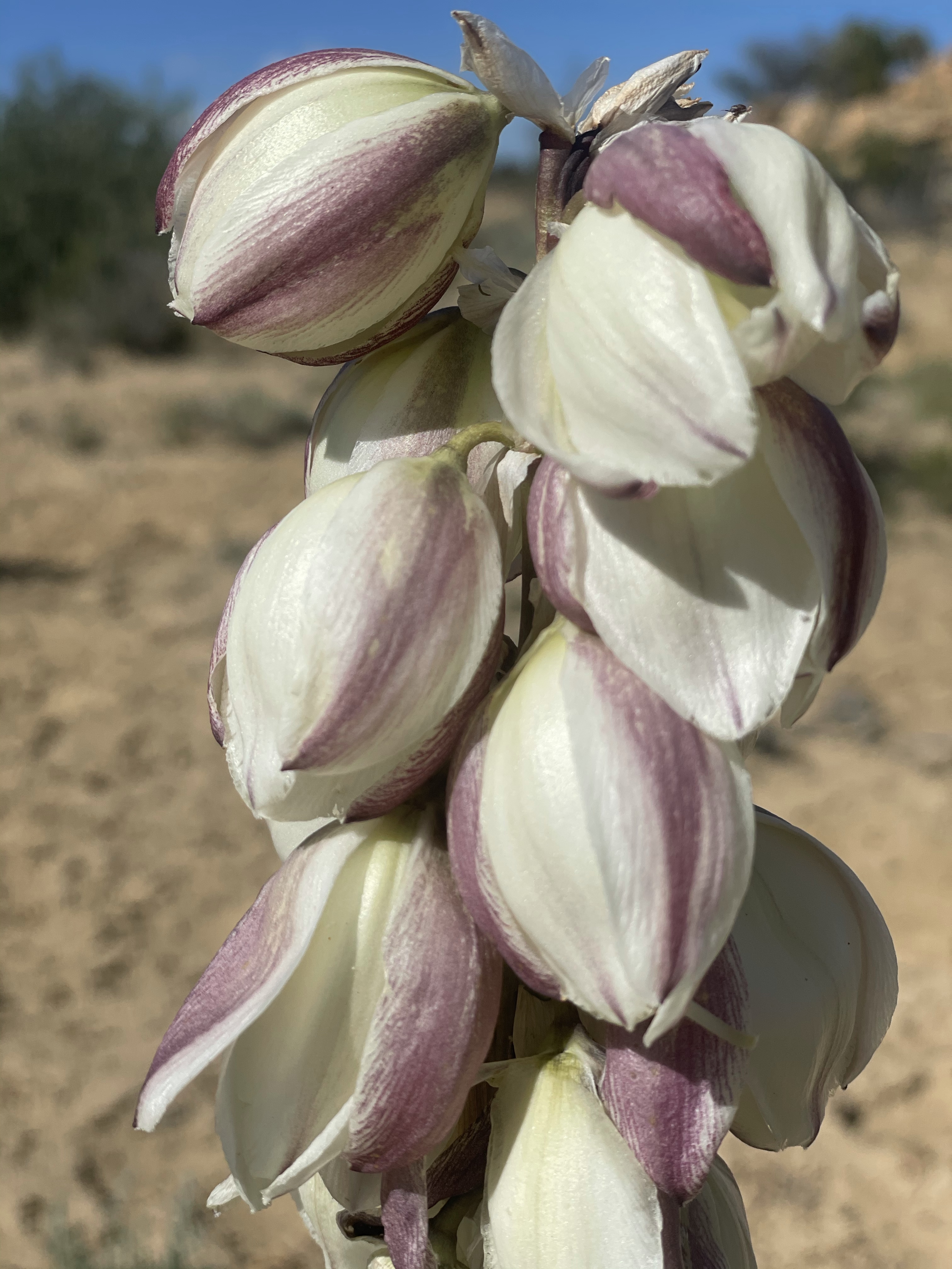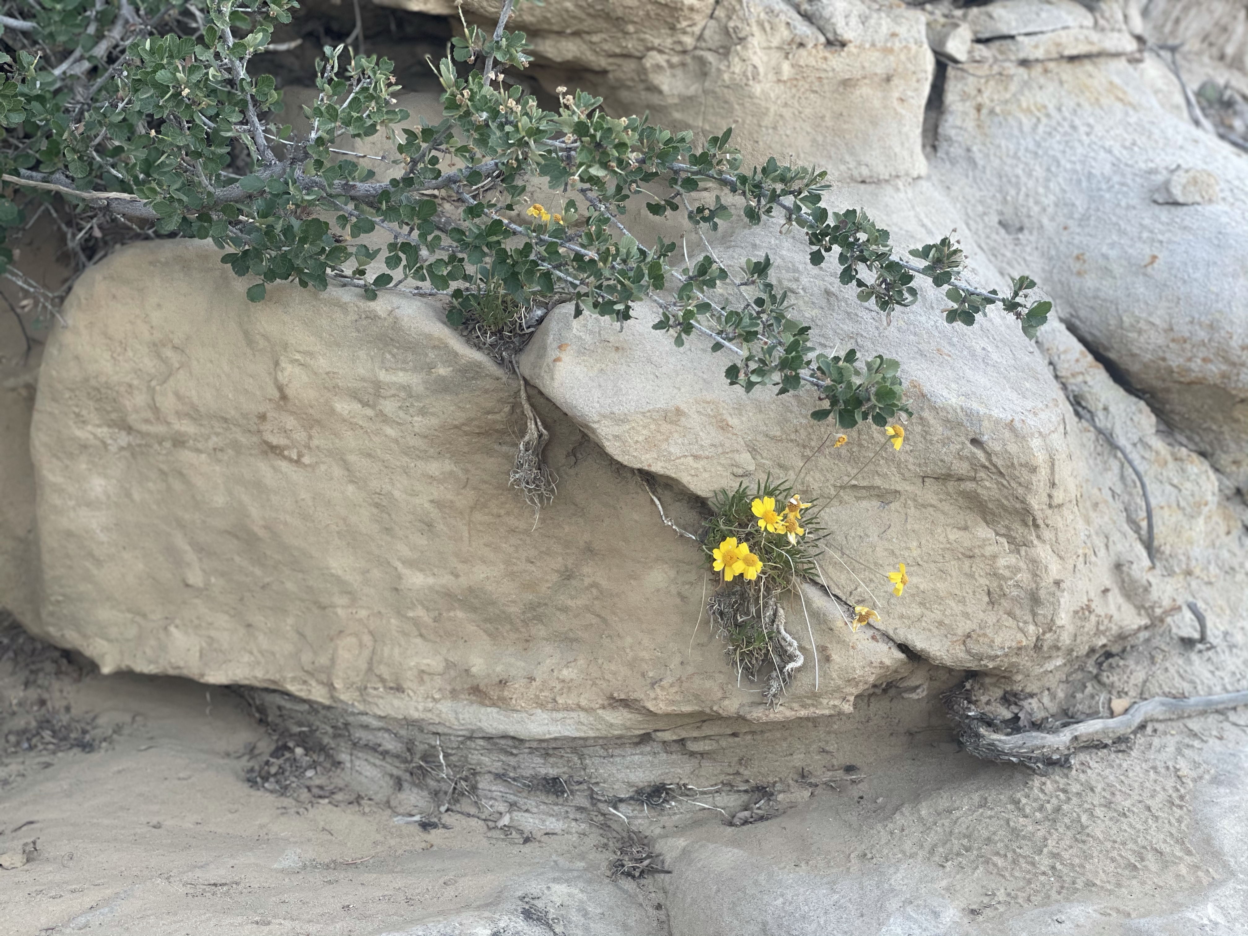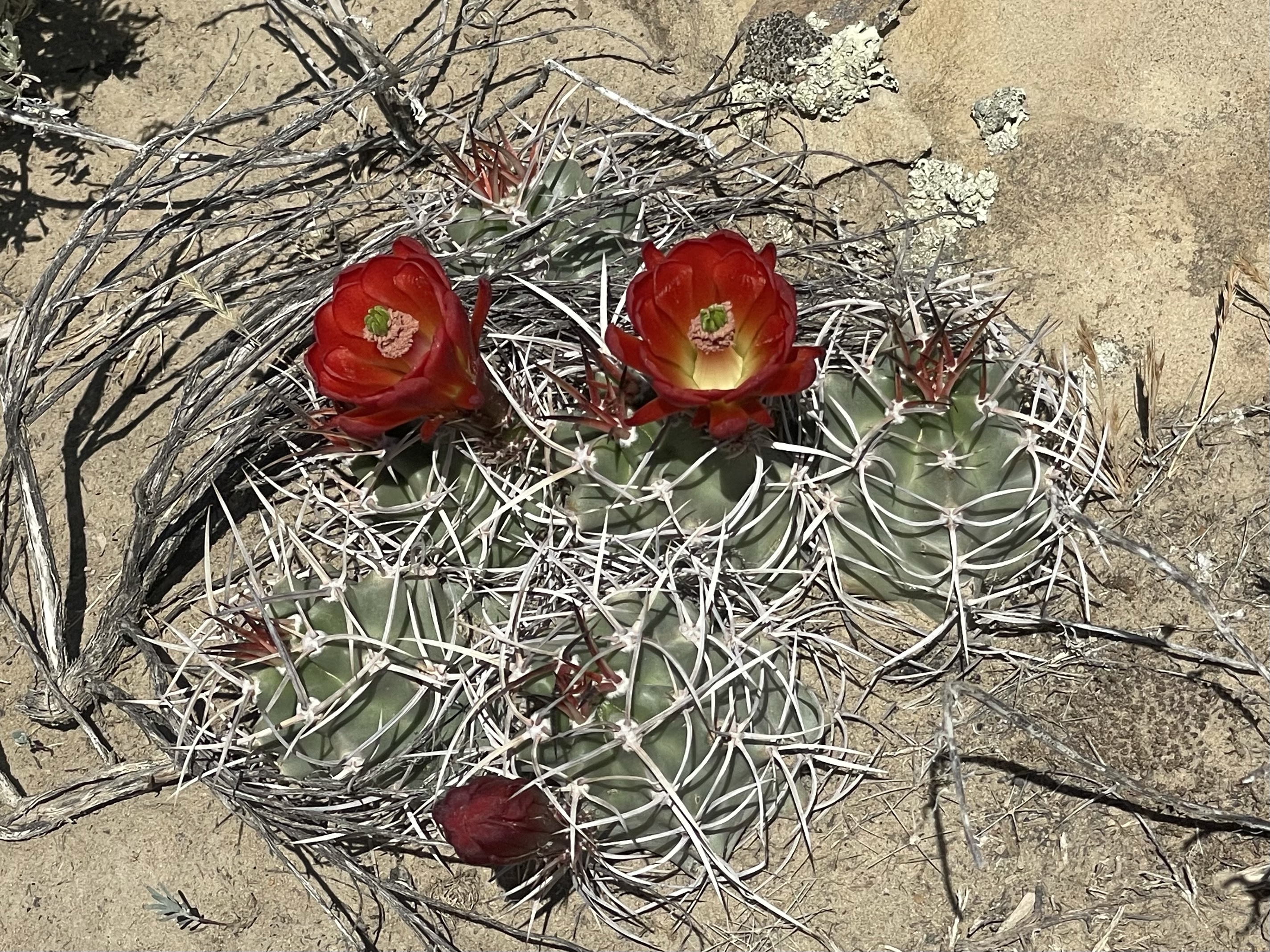 We traced our way up a few levels onto the sandstone mesa sides, flowers jeweling the way. An hour and a half in, still nice and early, we found Chimney standing in front of two coolers. “One is snacks, and one is cold drinks,” he said. There were fig bars and fruit snacks, among other things, and from the tree above hung snack size bags of chips and popcorn, duct taped to the branches, as if they had grown there. There was also a bag of Cuties oranges, perfectly ripened. Fruit! What a treat!