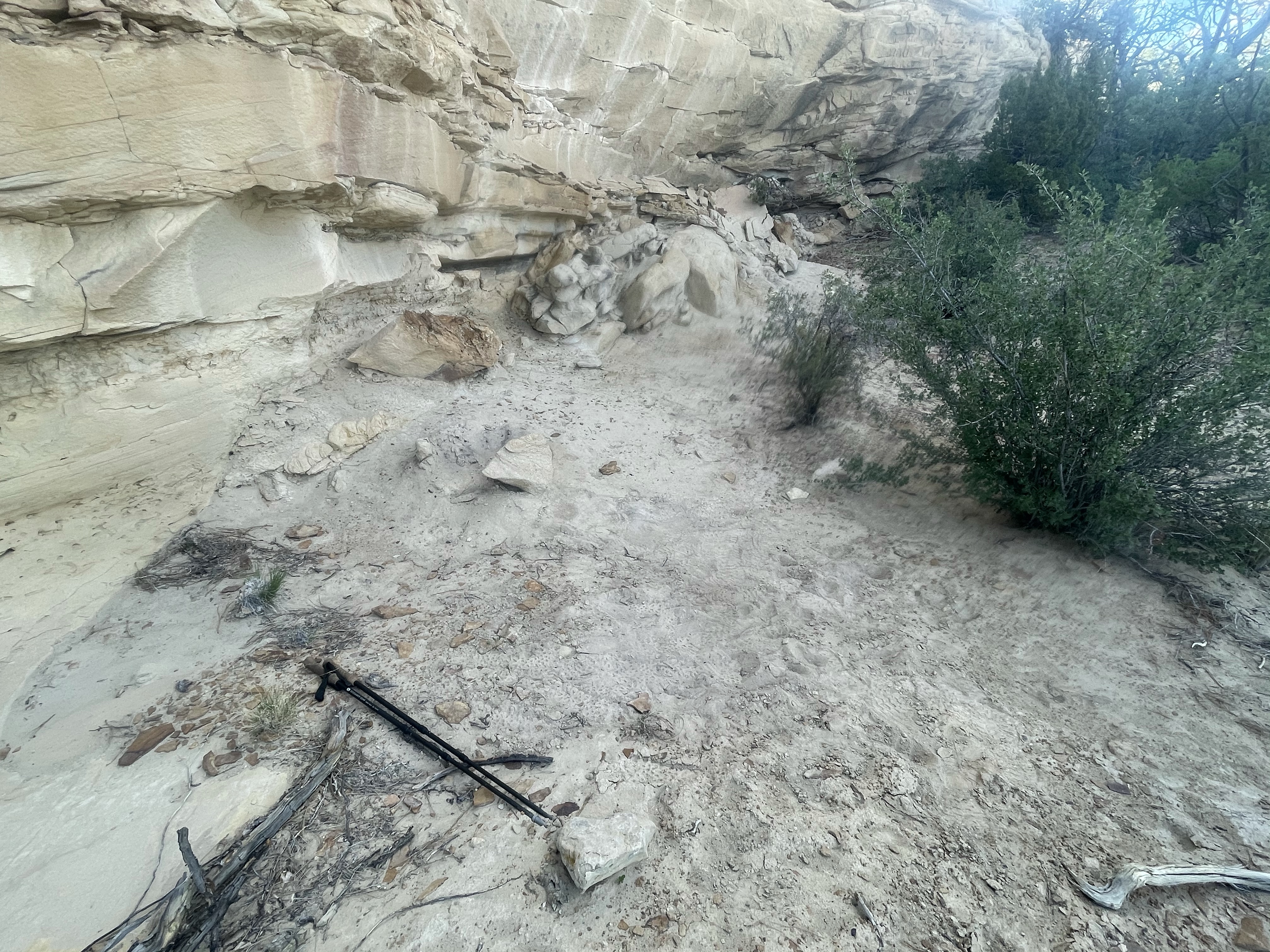 An hour later I followed the trail into a narrow peninsula of sandstone, brightly striped mesas in the distance, and several huge scalloped walls. In the middle scallop sprawled Prana, half napped out, and I dove into the white sand beside him, burrowing down to the cool layer that had never been heated by the sun and rolling in it, the shade cast by the wall so deep and complete I thought I would keel over from the pleasure. Sweet sweet relief! How in the world are people still starting in the Bootheel as late as last week?!