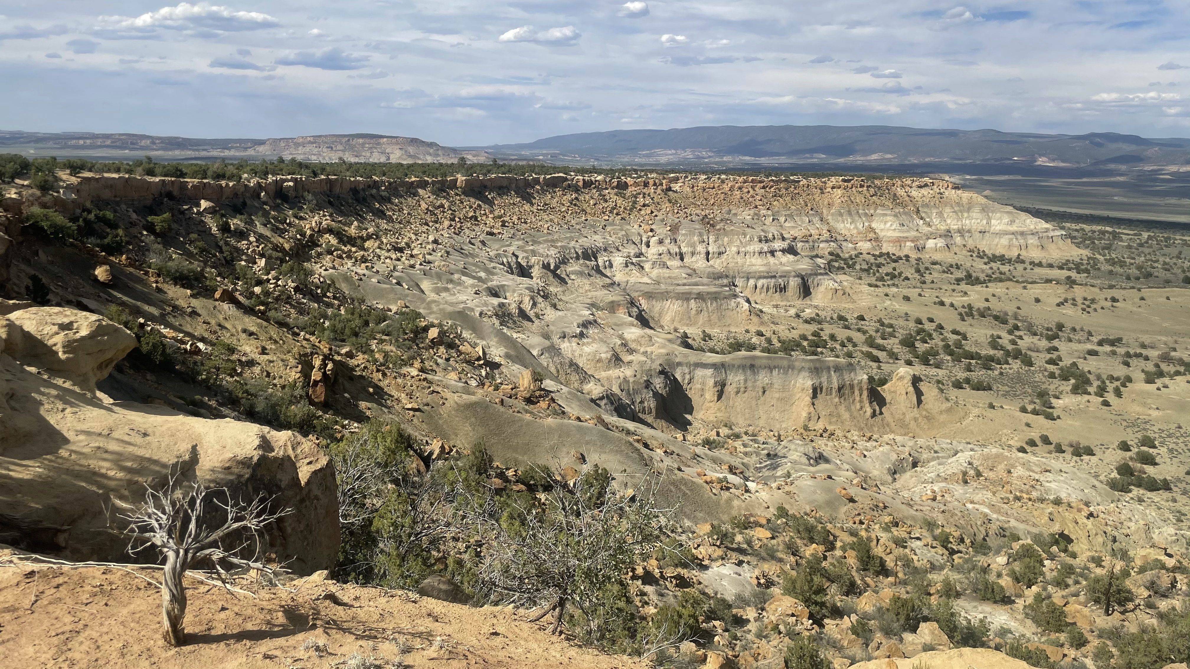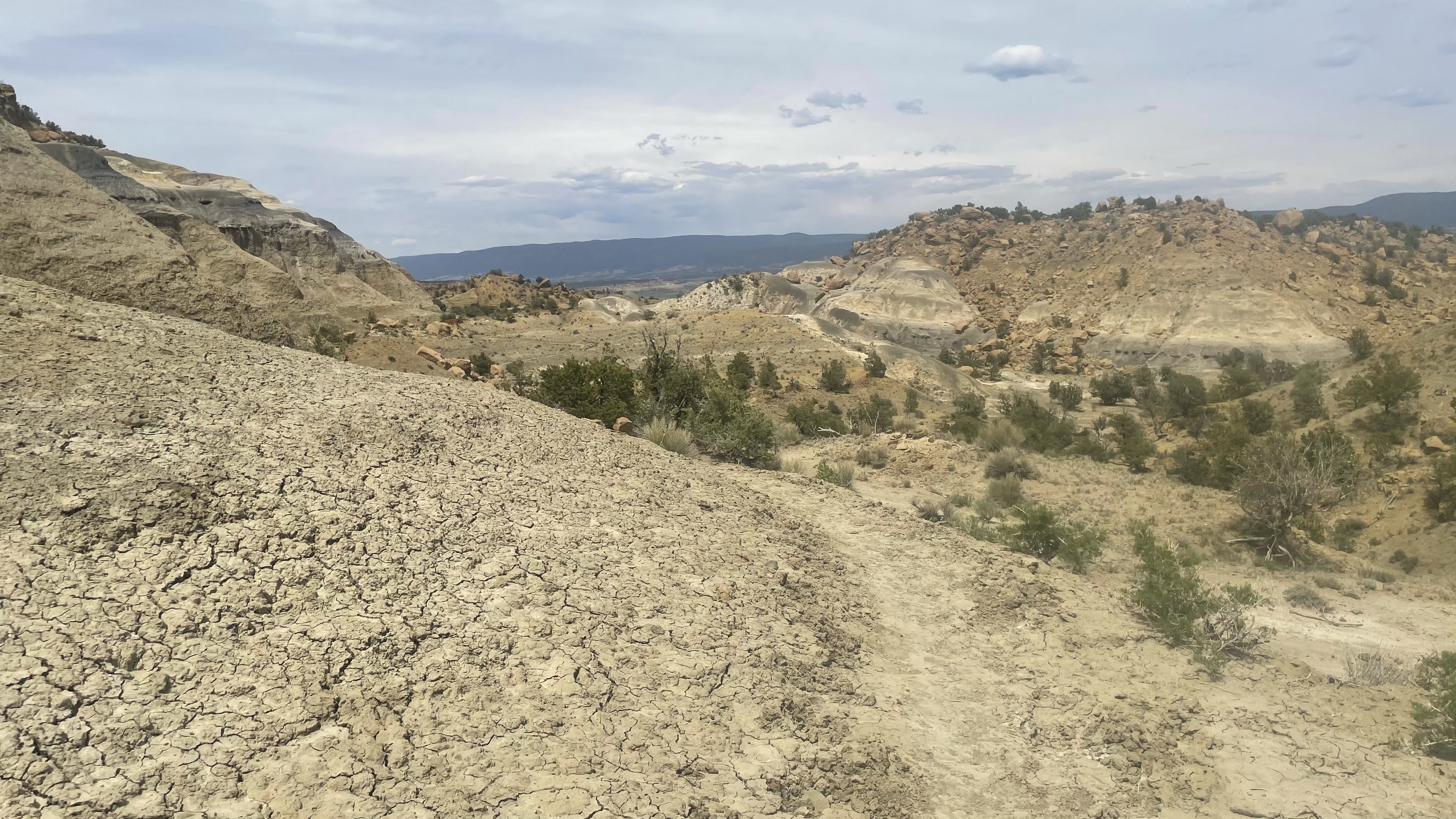A few miles along we plopped down under the last shady pine tree before crossing open sage flats to the far mesa- our last mesa level-up until Cuba- for lunch. Miraculously, clouds rolled in, and though it wasn’t cool, it wasn’t the brain-deconstructing sun pressure of yesterday. I cued up the album Exile on Main Street and struck out across the sand.