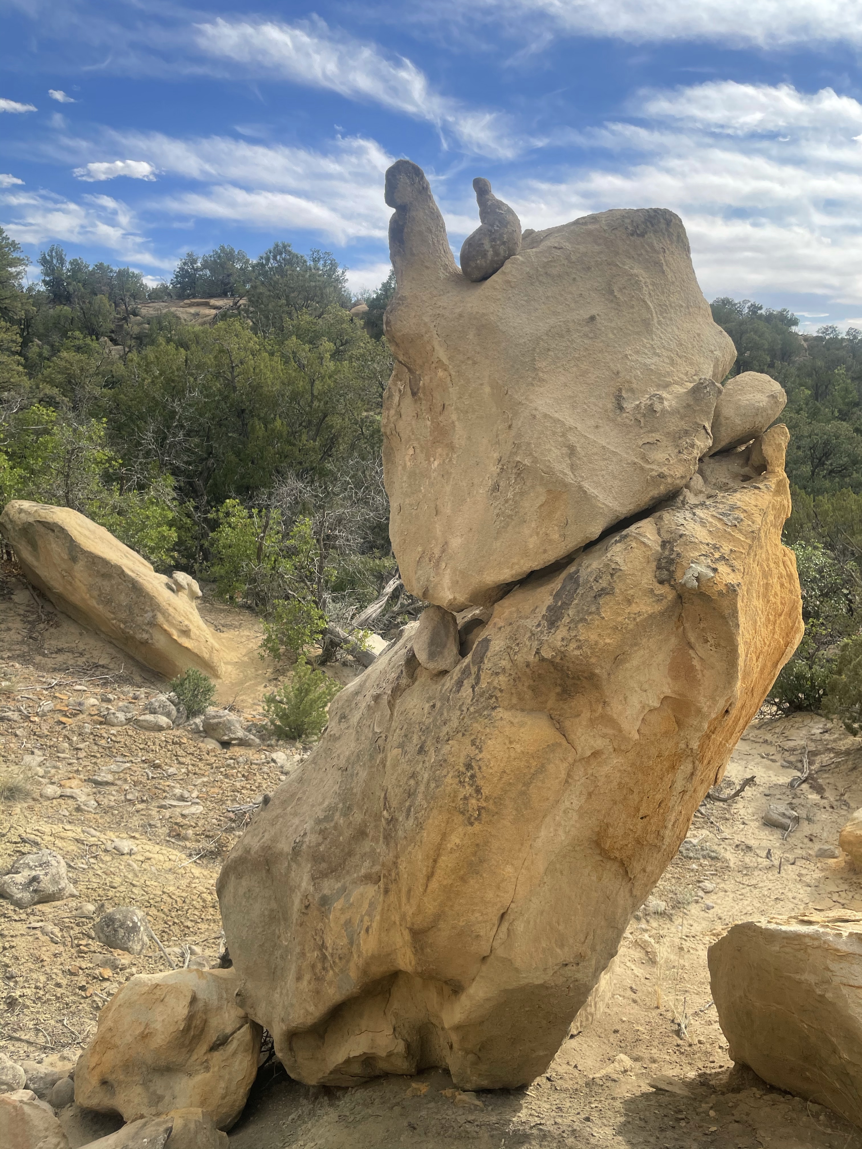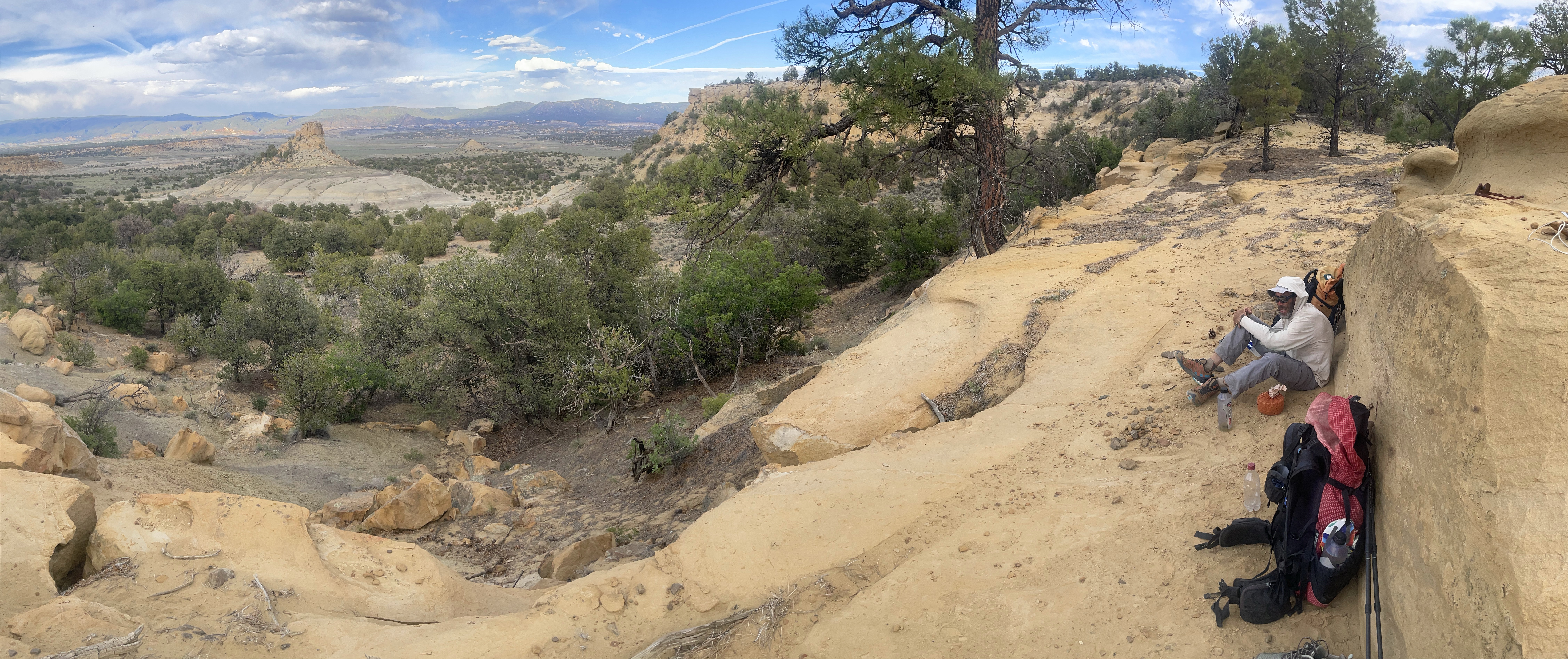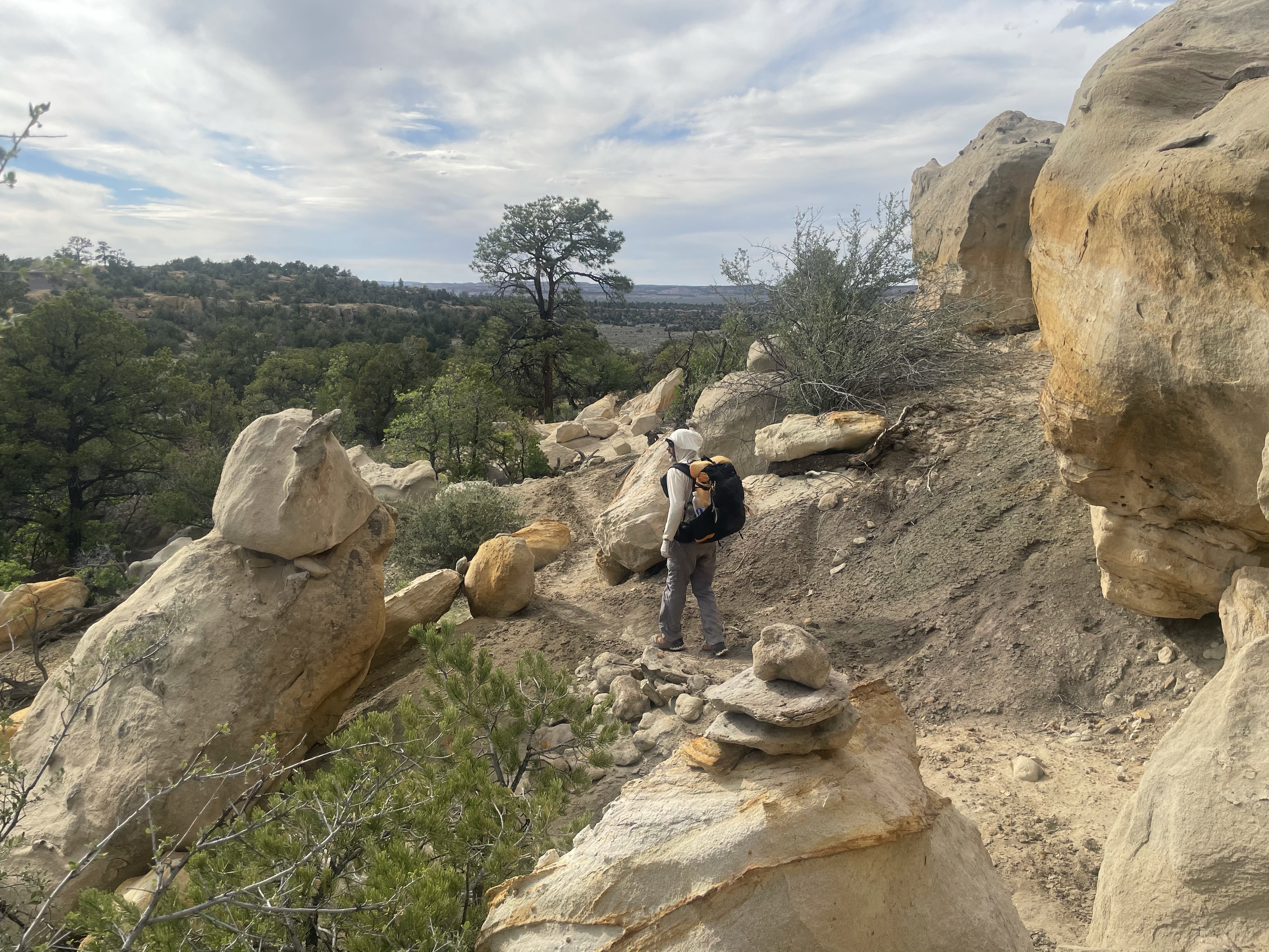 The trail snaked along the bottom edge of the mesa, ducking in and out of random boulders, hoodoos, and subsidiary mud piles flanking the base. The colors! I couldn’t believe all the colors contained in these mesa edges, subtle though they were. Yellow, orange, cream, rust, grey, cadet blue, dark indigo, charcoal, black, maroon. And one cairn was piled of the biggest moqui marbles I’d ever seen. Marvels! The path abruptly climbed, a tight wiggle up boulders and rebar-enforced steps. Someone had put a ton of work into this section- gratitude to them. The top was fossilized waves of sandstone scattered with ponderosa pines and their umbrellas of shade. We took a long break, since there was no reason not to, and then followed a sandy track across the top. At the far end it curled down beautifully constructed steps along a ridge, where we found a stone couch to cook dinner against and contemplate a monolith out in the valley.