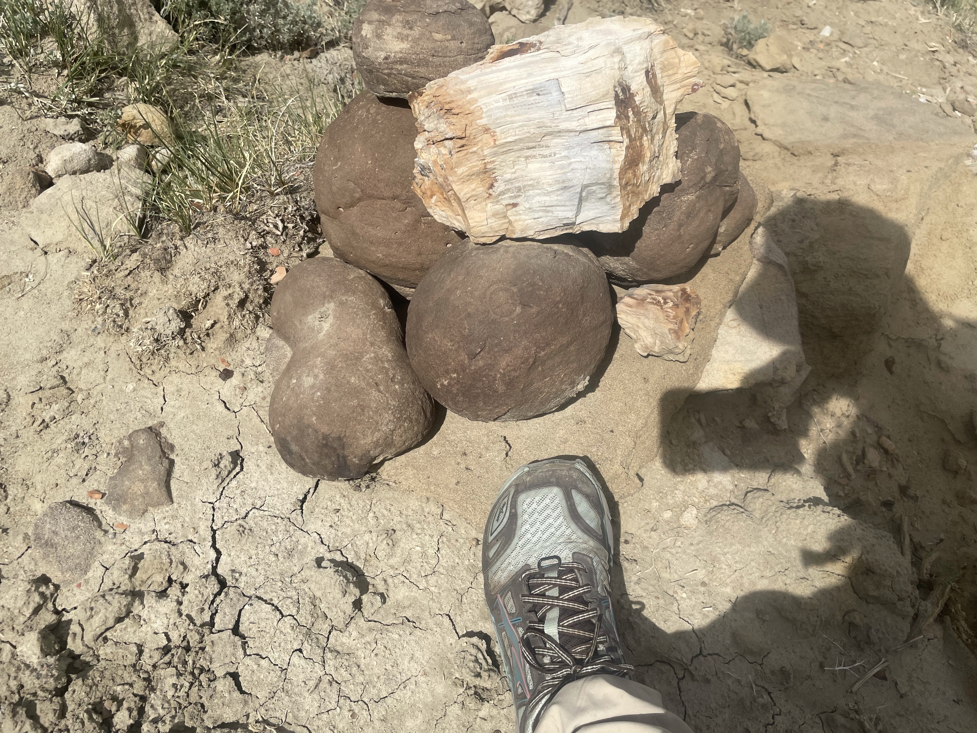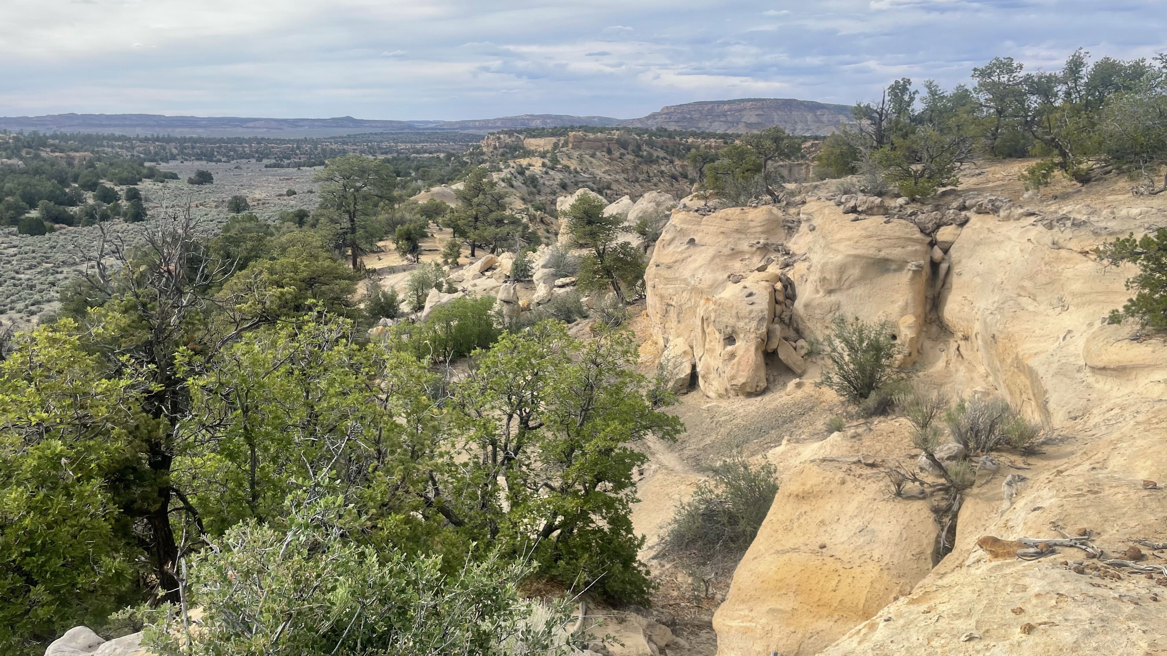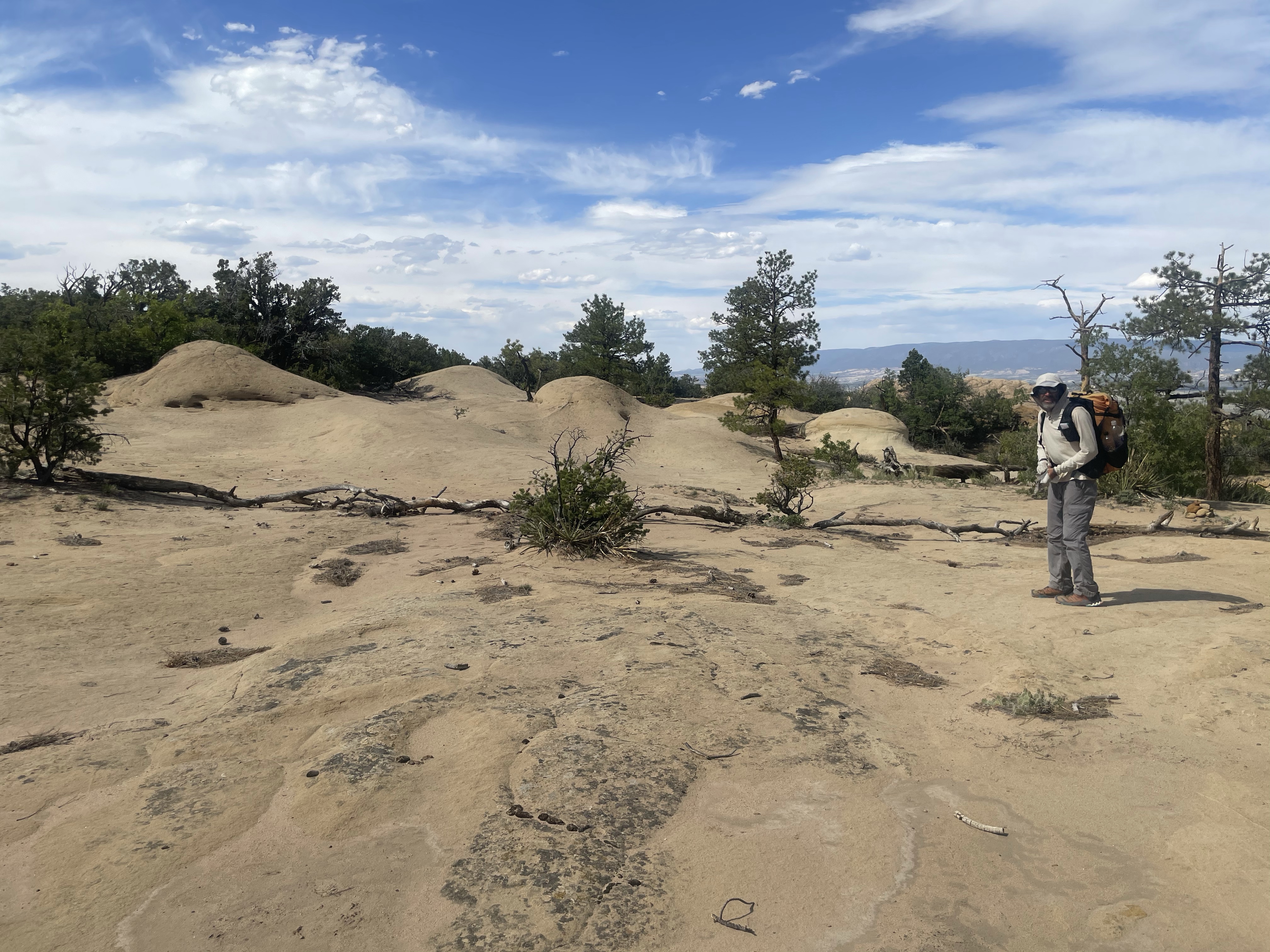 The trail snaked along the bottom edge of the mesa, ducking in and out of random boulders, hoodoos, and subsidiary mud piles flanking the base. The colors! I couldn’t believe all the colors contained in these mesa edges, subtle though they were. Yellow, orange, cream, rust, grey, cadet blue, dark indigo, charcoal, black, maroon. And one cairn was piled of the biggest moqui marbles I’d ever seen. Marvels! The path abruptly climbed, a tight wiggle up boulders and rebar-enforced steps. Someone had put a ton of work into this section- gratitude to them. The top was fossilized waves of sandstone scattered with ponderosa pines and their umbrellas of shade. We took a long break, since there was no reason not to, and then followed a sandy track across the top. At the far end it curled down beautifully constructed steps along a ridge, where we found a stone couch to cook dinner against and contemplate a monolith out in the valley.