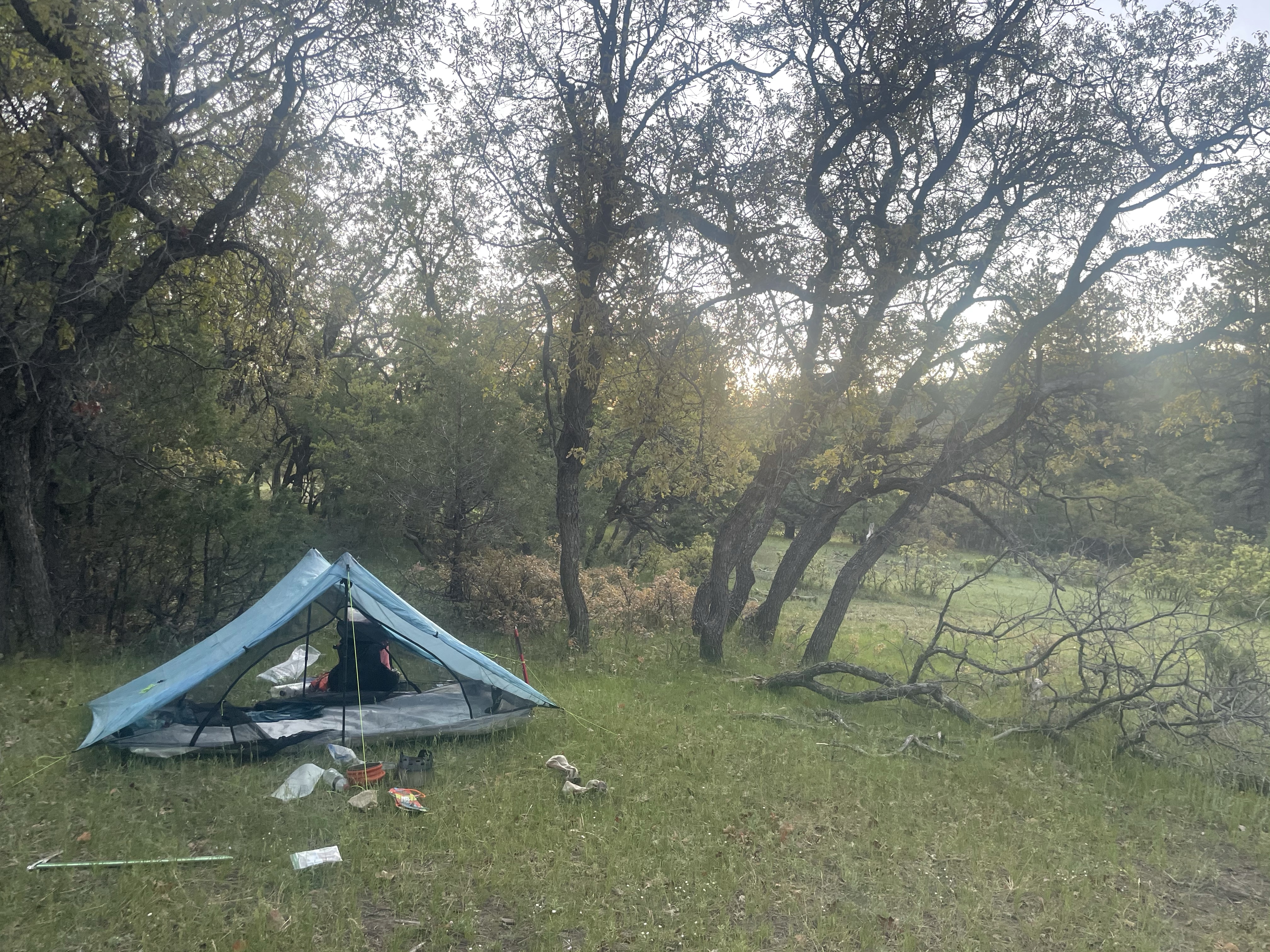 We took a break, took advantage of having the whole mesa top to ourselves, then followed the trail as it traced the very rim of La Mesa De Las Viejas for eight stunning miles. Half way we perched on the edge to cook dinner, and lingered a bit long, twilight already arrived as we pushed our last stretch. My legs never warmed up after they stiffened at dinner, and I hobbled and marveled and took pictures of the alpenglow and sunset. Prana waited at mile 700 for a mini-celebration, and we sought out a good-enough campsite as the dark and the rain converged upon us.