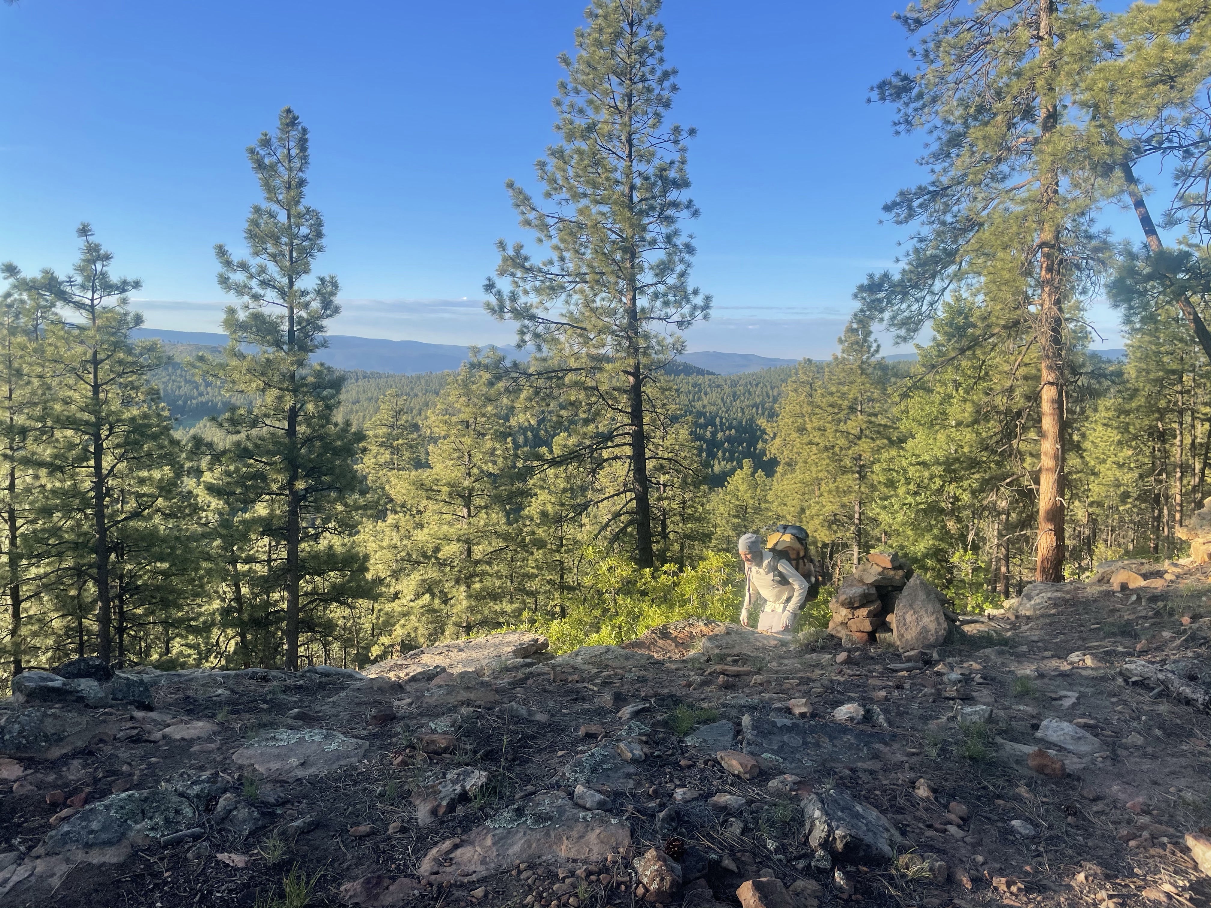 Our leftover little climb was perfect to start the morning with, up through pines and sandstone, and from there we dropped down the back side of the ridge. I listened to several Outside Online podcasts, about grit and choice and what is hard core, and when the trail veered from the road and then disappeared, I felt quite cheerful clambering through mild blowdowns and searching for the trail’s remnants, like a scavenger hunt, even when all it eventually did was rocket steeply back up to the same road we’d veered from.