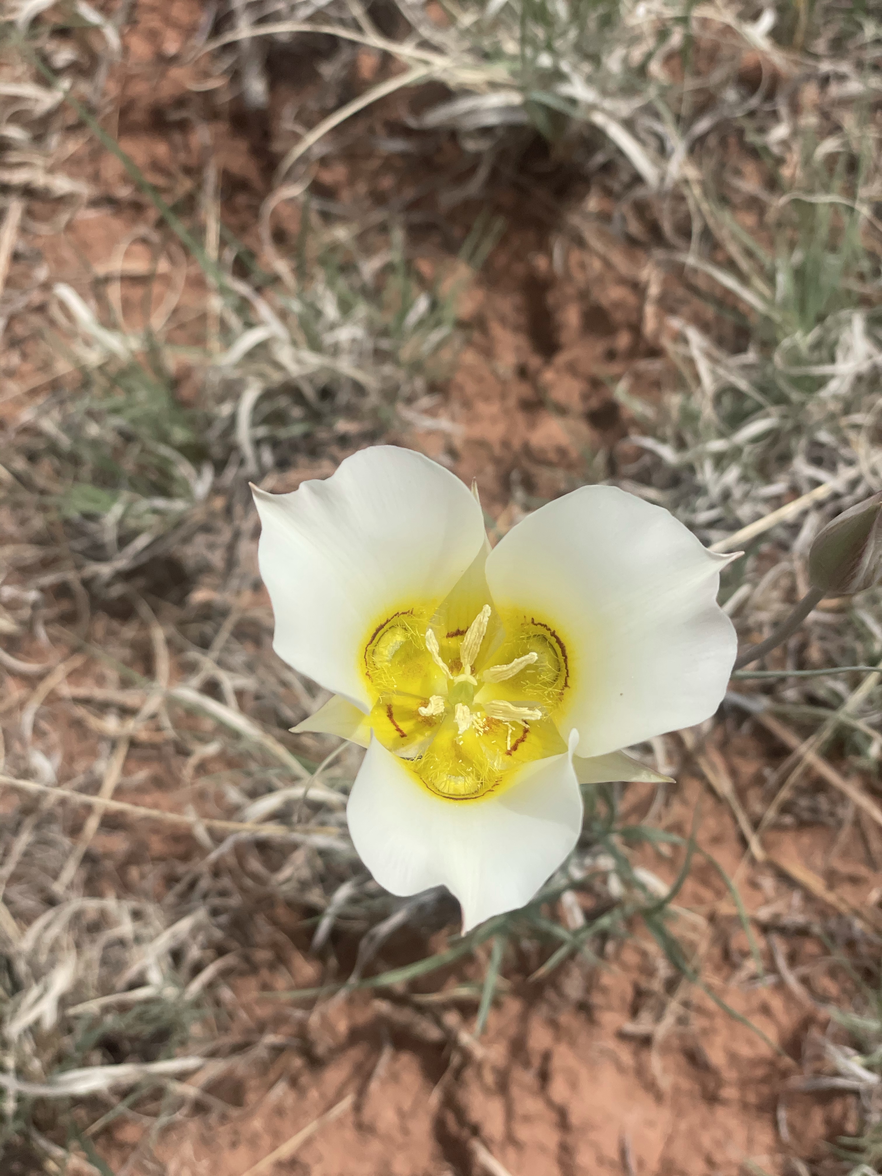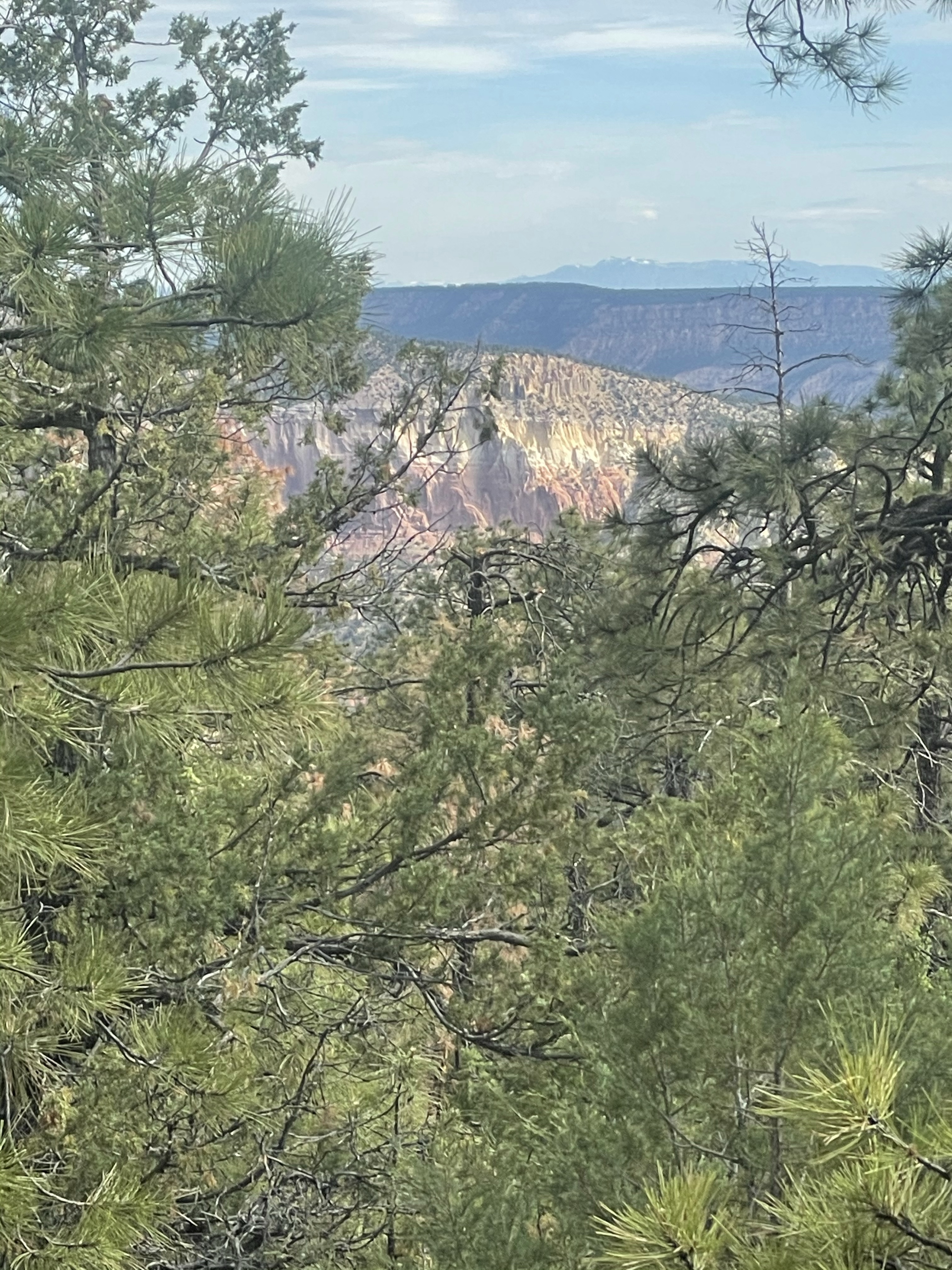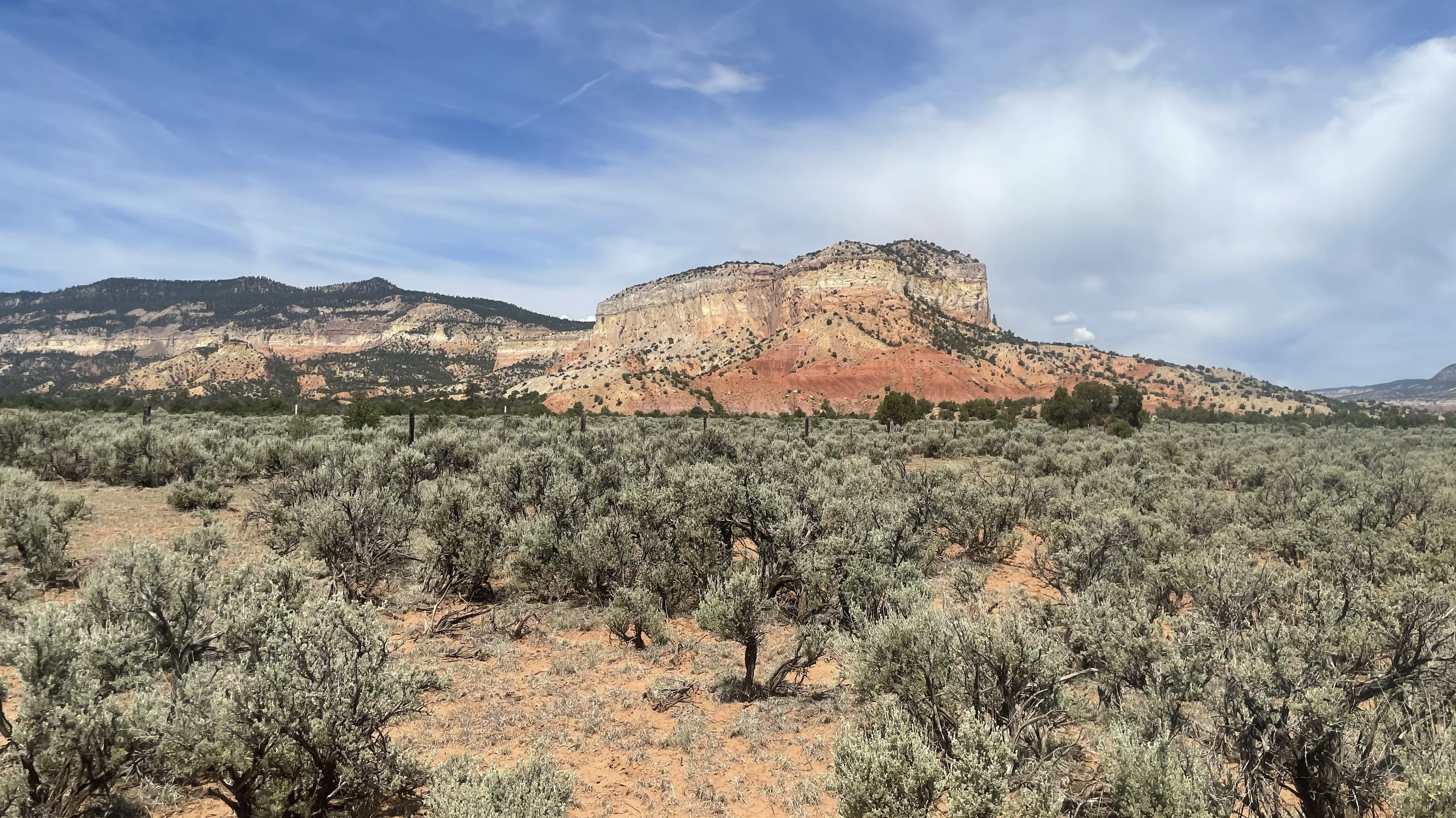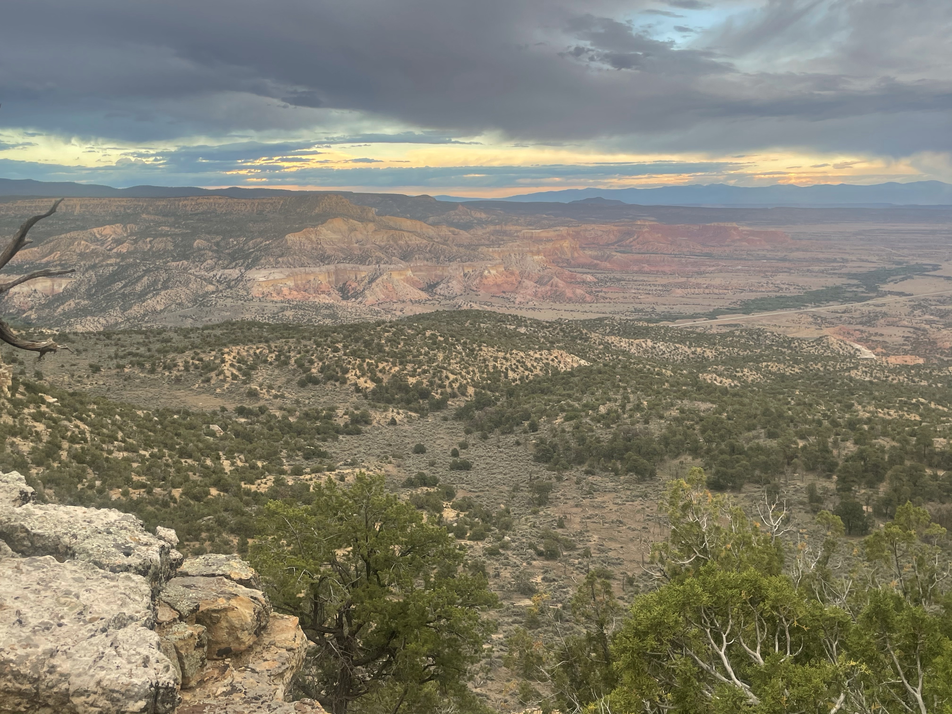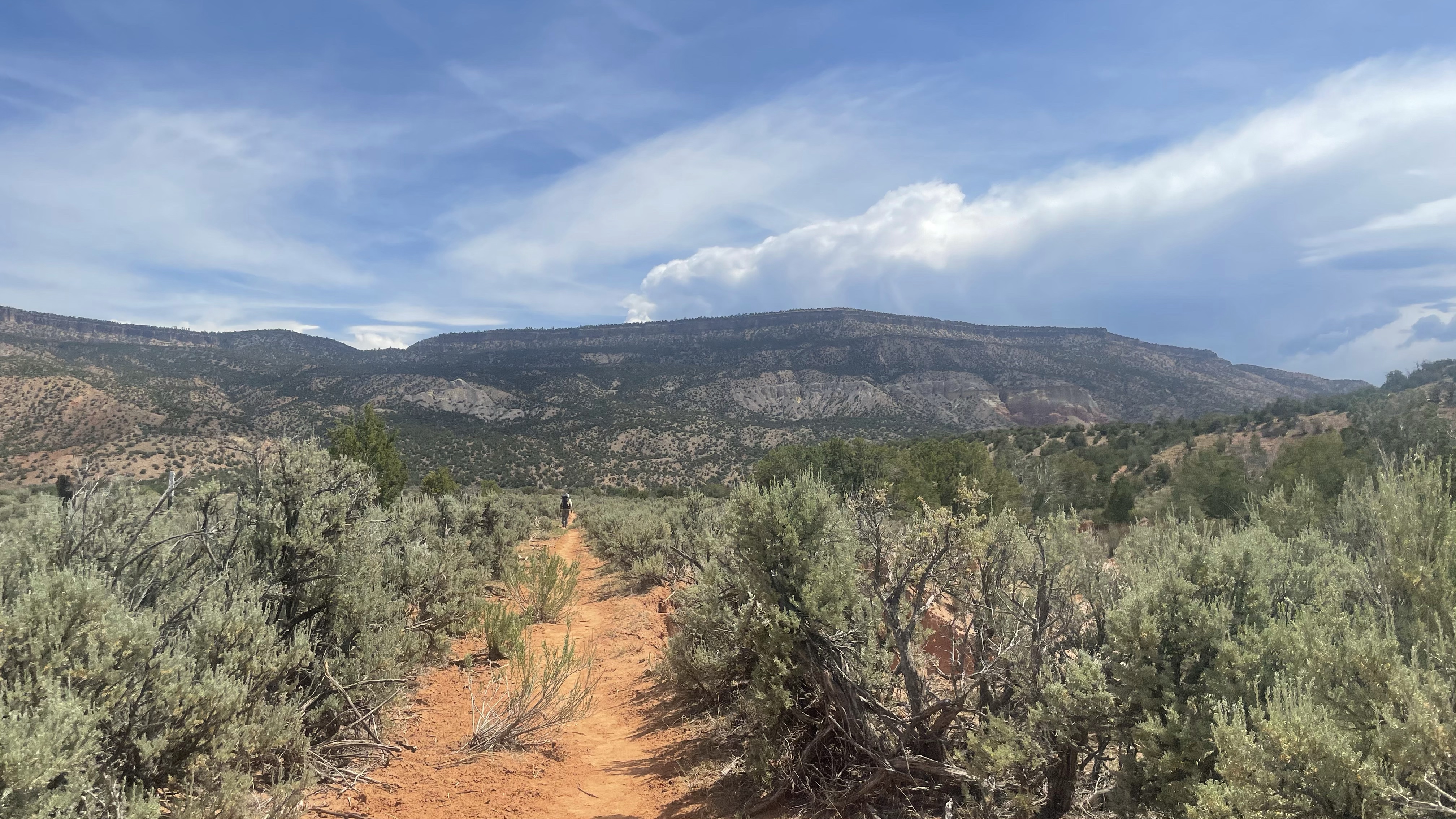 The next descent was for keeps, and we dropped down ledge systems and switchbacks through forest. I cued up a dreamy, esoteric instrumental playlist sent by a friend of my brothers, the perfect accompaniment for landing in the riparian bottom of Cañada Gurule, flanked by painted, sculpted sandstone walls. A small stream carved a trough in the clay bottom, and we crossed and recrossed it as all the green filtered the light. At its wide end the trail left the creek and gained one of the shoulders, and the trail unfurled through sage flats, the canyon walls yellow stacked on white stacked on red, aprons of purple and orange and brown fanning down.