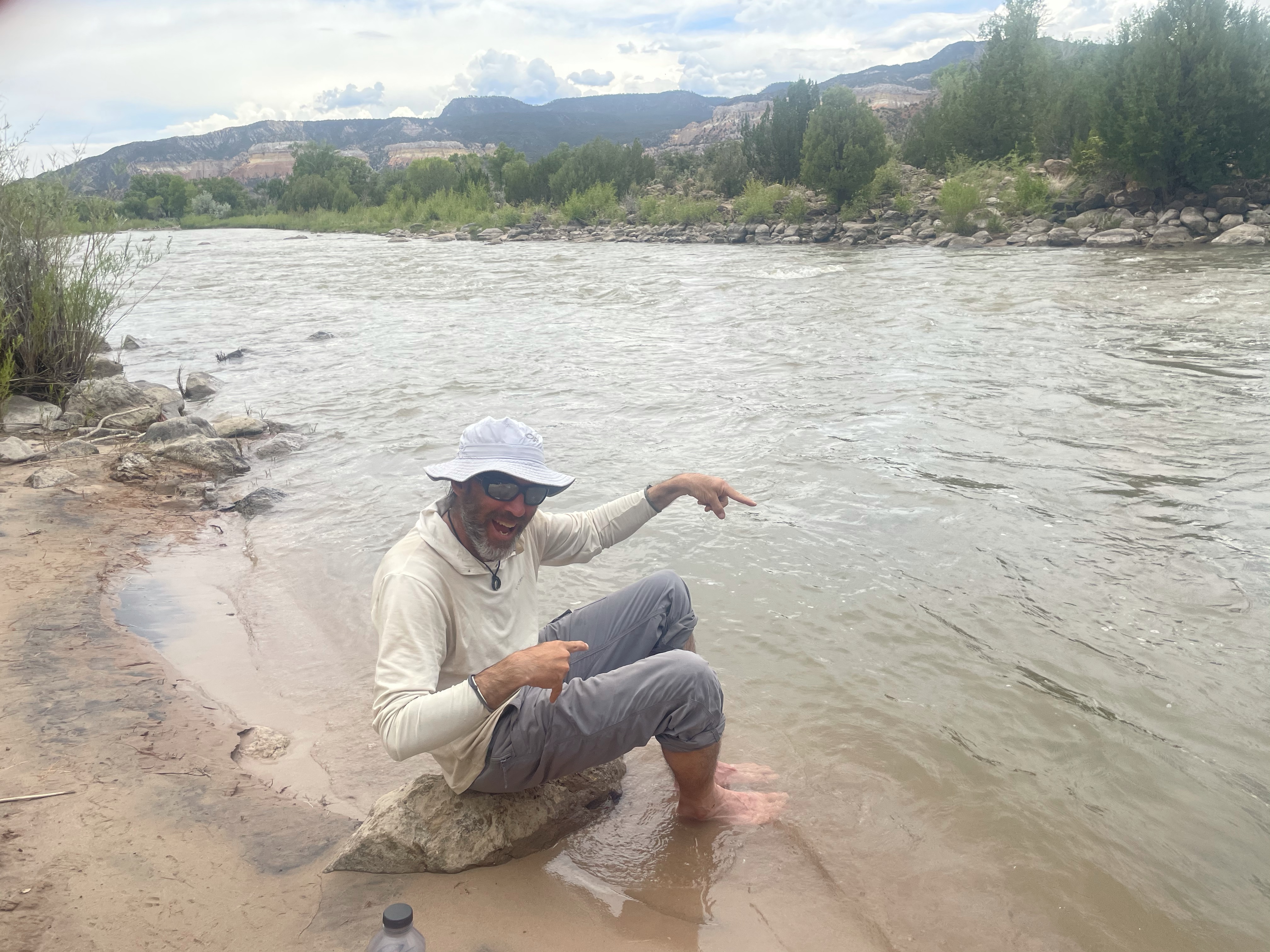 We topped off our water at a spring fed trough, and then there it was: the Rio Chama. Our first real river, after 6 weeks and nearly 700 miles of hiking- kind of wild to see through those Rio-starved eyes. We went down to its sandy shore, set the water up to filter, took off shoes, rolled up pant legs, and waded in. It was cloudy, a bona fide silt-laden desert river, and not as cold as I’d expected; it made beautiful white noise chuckling over its boulders and riffles. We stayed for hours.