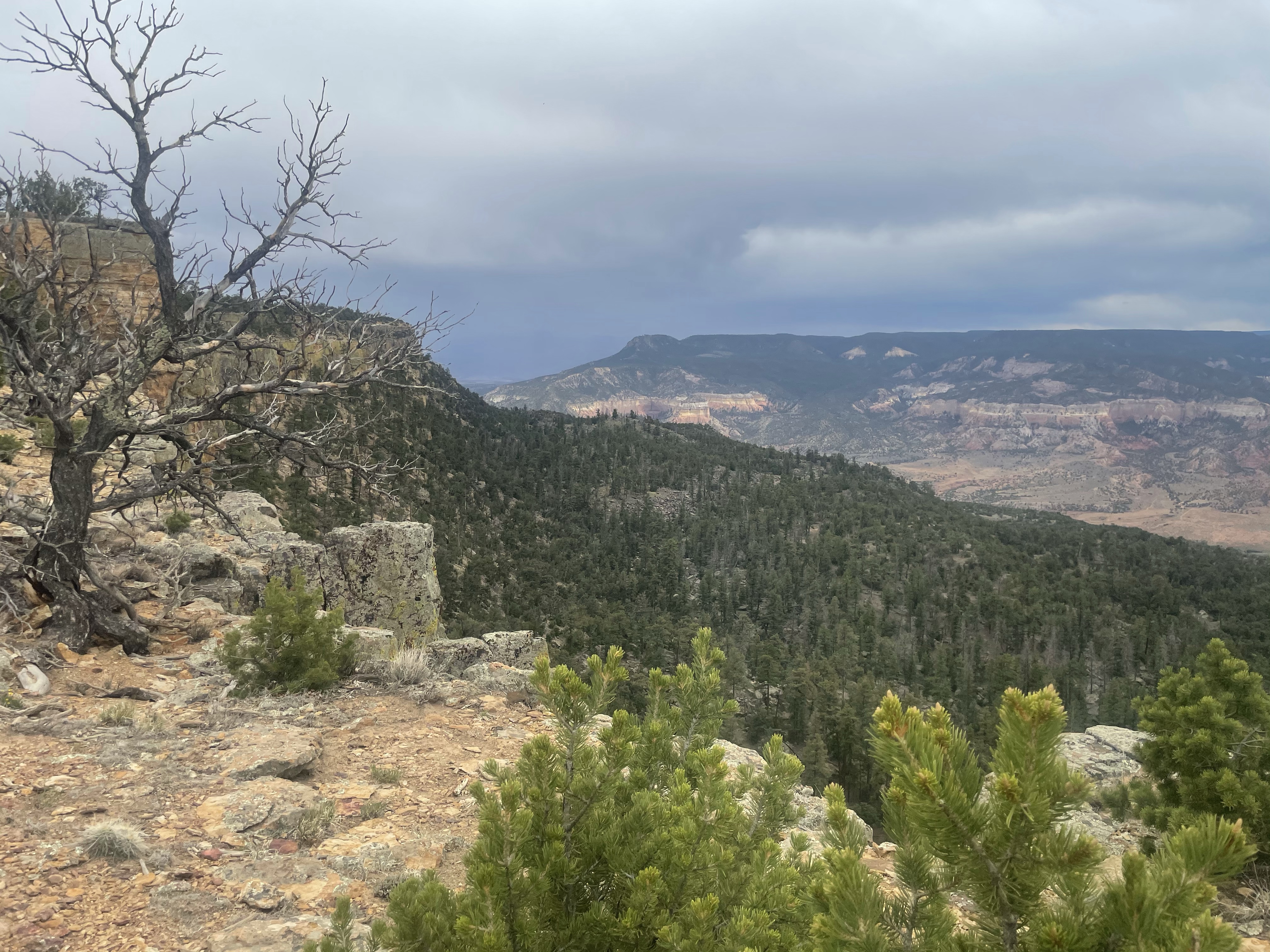 The trail wound gracefully up the benches and ridges, and I could not stop from turning back to the views behind and below, the painted walls under the kaleidoscope of clouds and curtains and light. Only three and a half miles led to the top, where the edge squarely dropped away into the ravine below.
