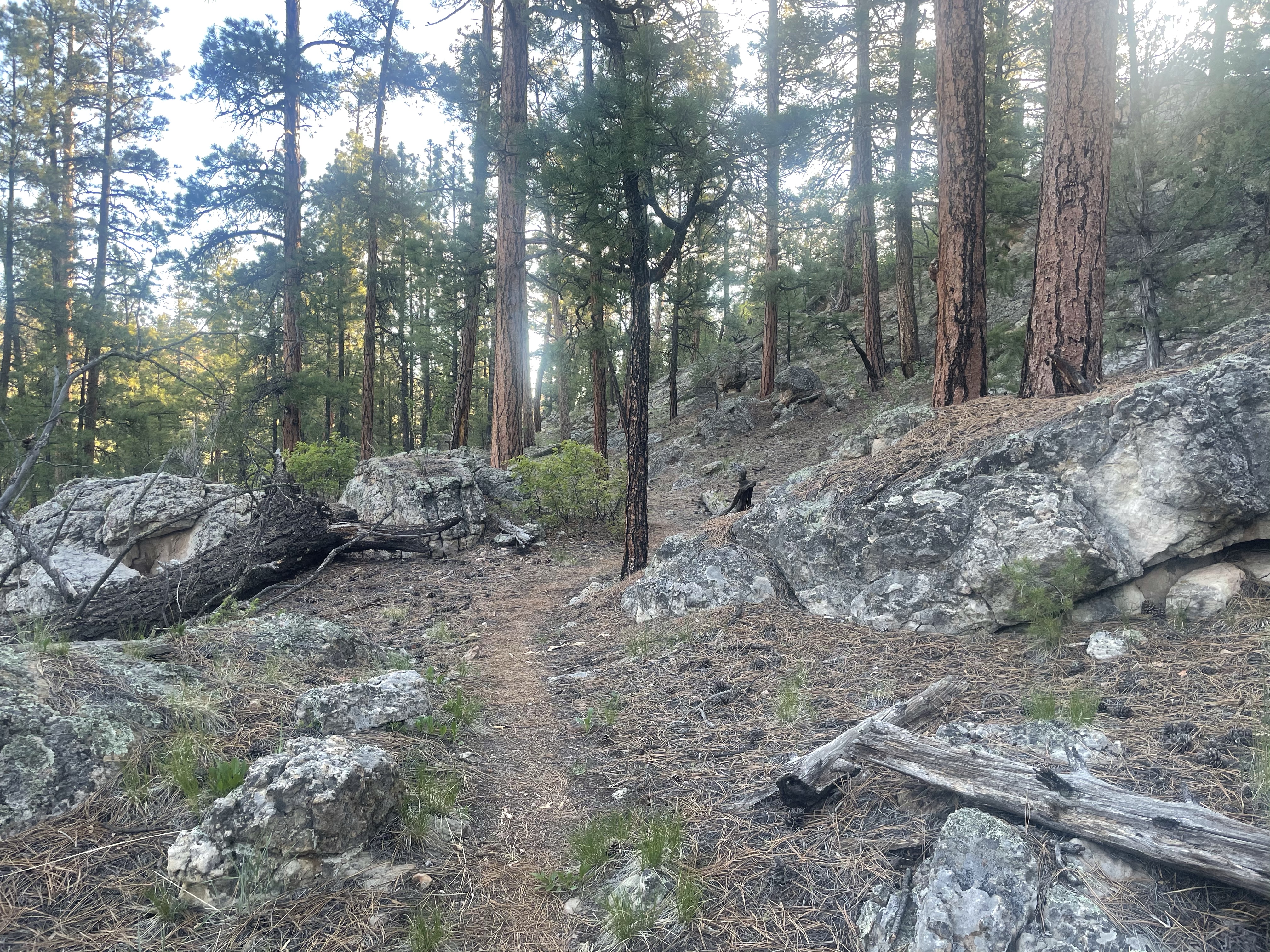 Most of the walking was through pine forest, first on trail, then on old two track road. Nothing too fancy. A good day for podcasts. First a story about a kid who was left on a chairlift at the end of the resort day and finally had to jump off and crawl for help with three broken limbs; next, a story about the first quadriplegic to attempt an Ironman, and all the fascinating physical, mental, and medical conundrums he had to solve. Then a string of Ted Talks: one on the Gratitude Chain, and the hows and whys of gratefulness; one on the Opportunities of Boredom; one on things that can’t be rushed, that just Take Time. All 3 very, very appropriate to today. I didn’t even have the energy to critically think about each one in between- I just kept them playing one after the next.