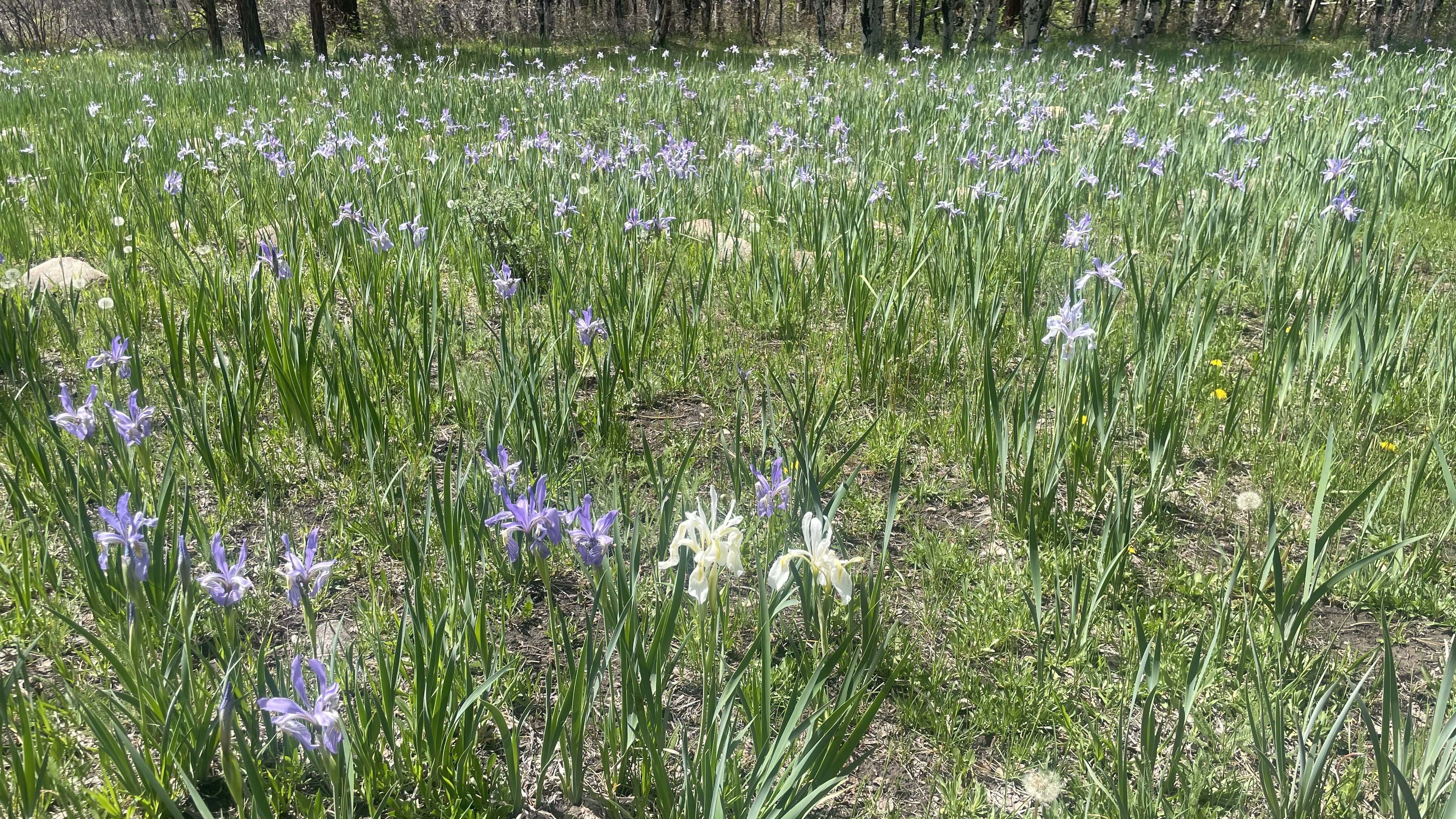 The trail snaked through a strange corral-maze, novelly fun. It had gradually climbed all day, and when the aspen appeared, I felt psychologically cooler. Soon we were surrounded by aspen, and then the highlight of the day: almost a mile of iris filled meadow. I couldn’t believe it- I’d never seen anything like it. Delight overcame me, and a beauty tear slipped out.