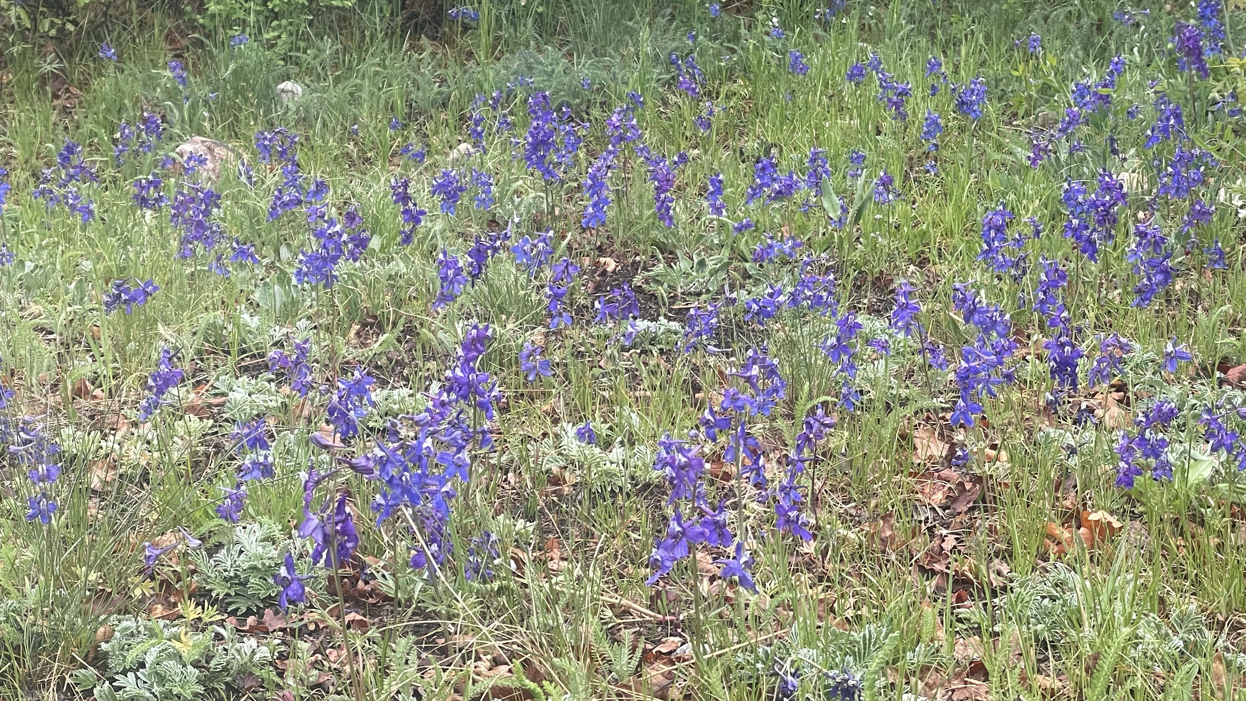 Lightning flashed north as we donned our packs; thunder echoed close behind. The sun was mercifully extinguished, and we marched into open meadows filled with larkspur as the sky roiled and wind gusted. The actual rain appeared patchwork, though- maybe it would miss us?